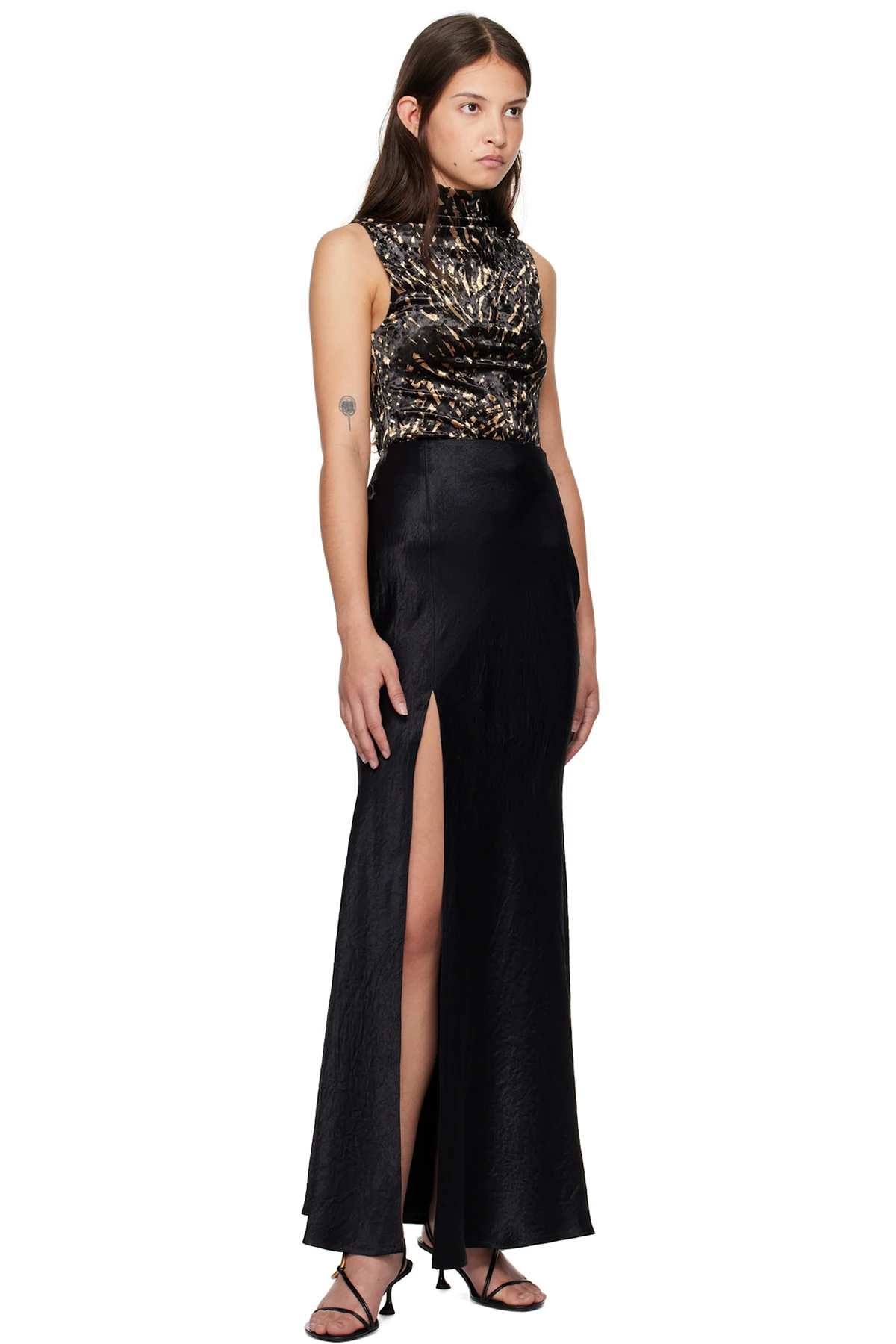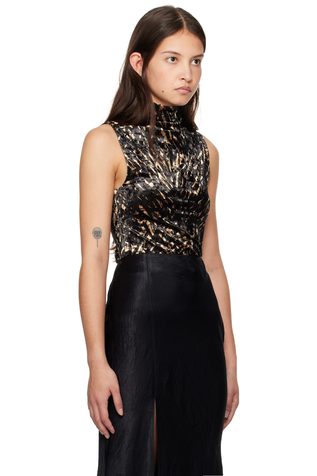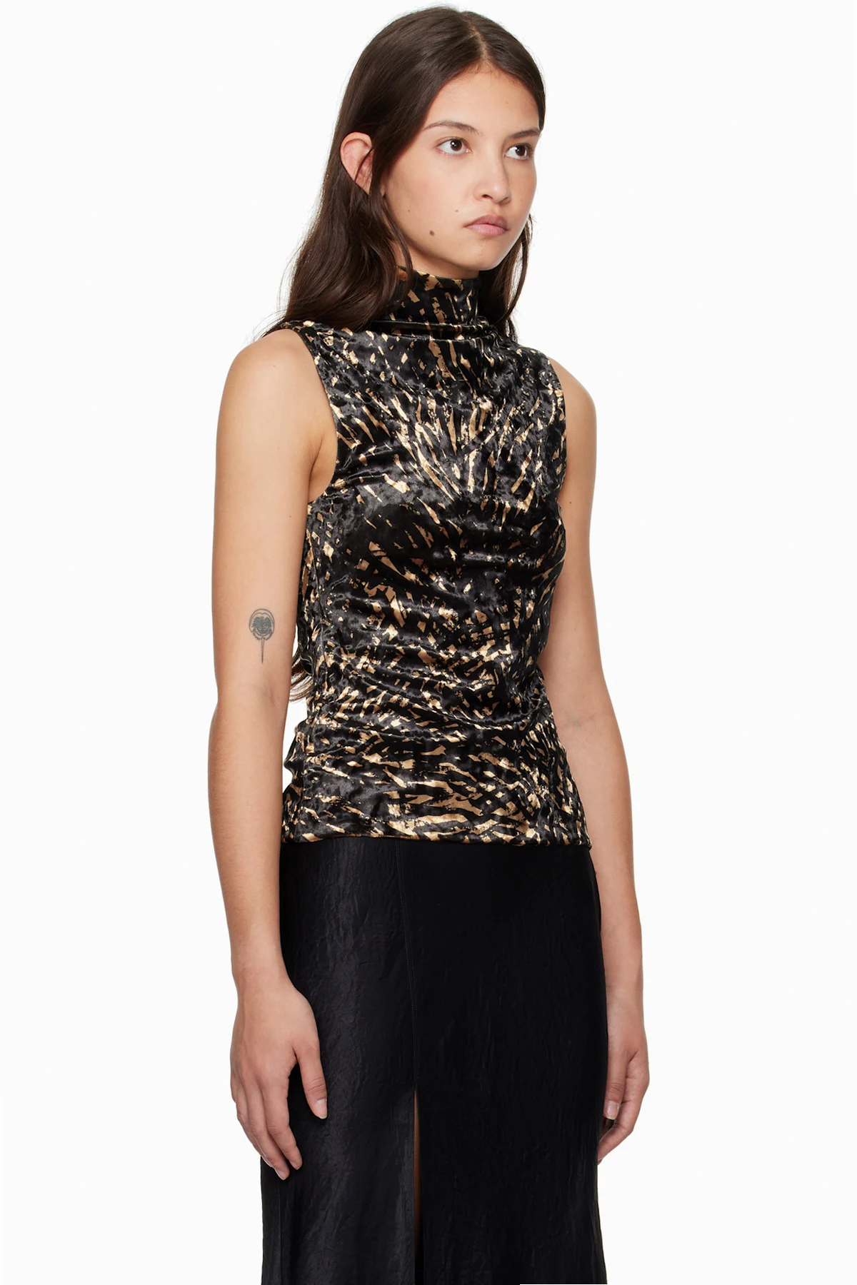 Stretch polyester crushed velvet turtleneck. Graphic pattern throughout.