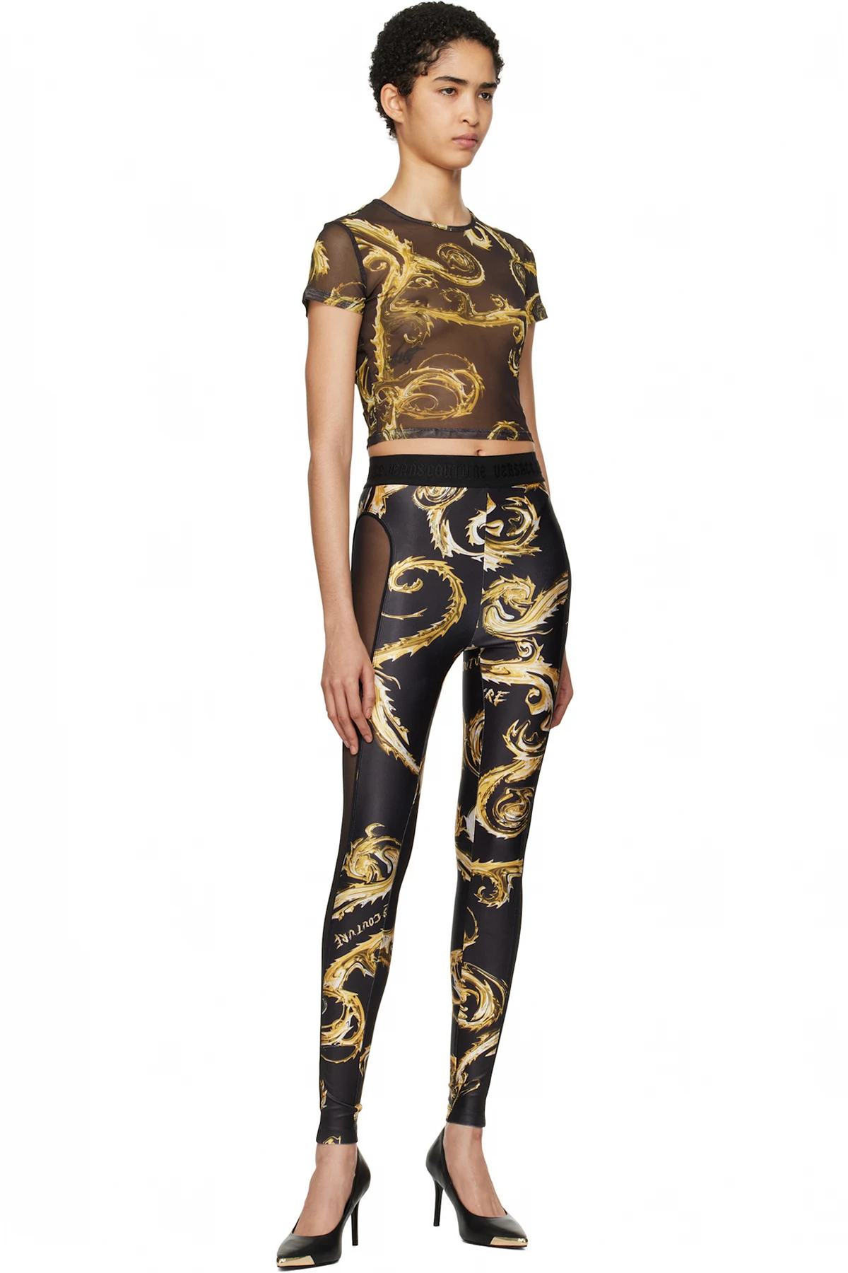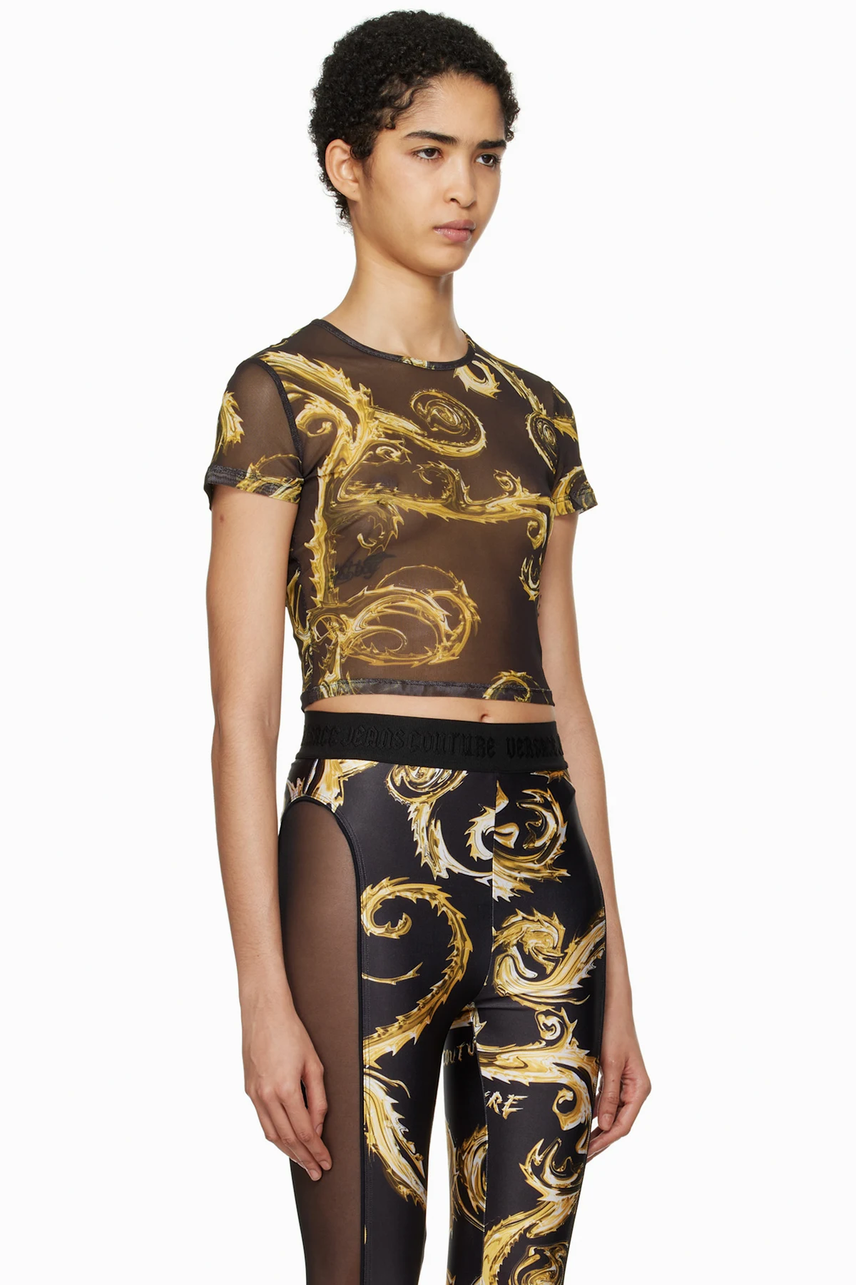 Sheer stretch polyester mesh T-shirt. Logo graphic pattern printed throughout.