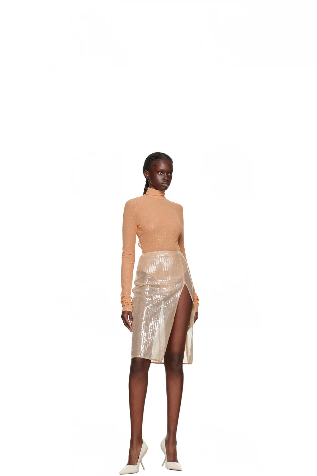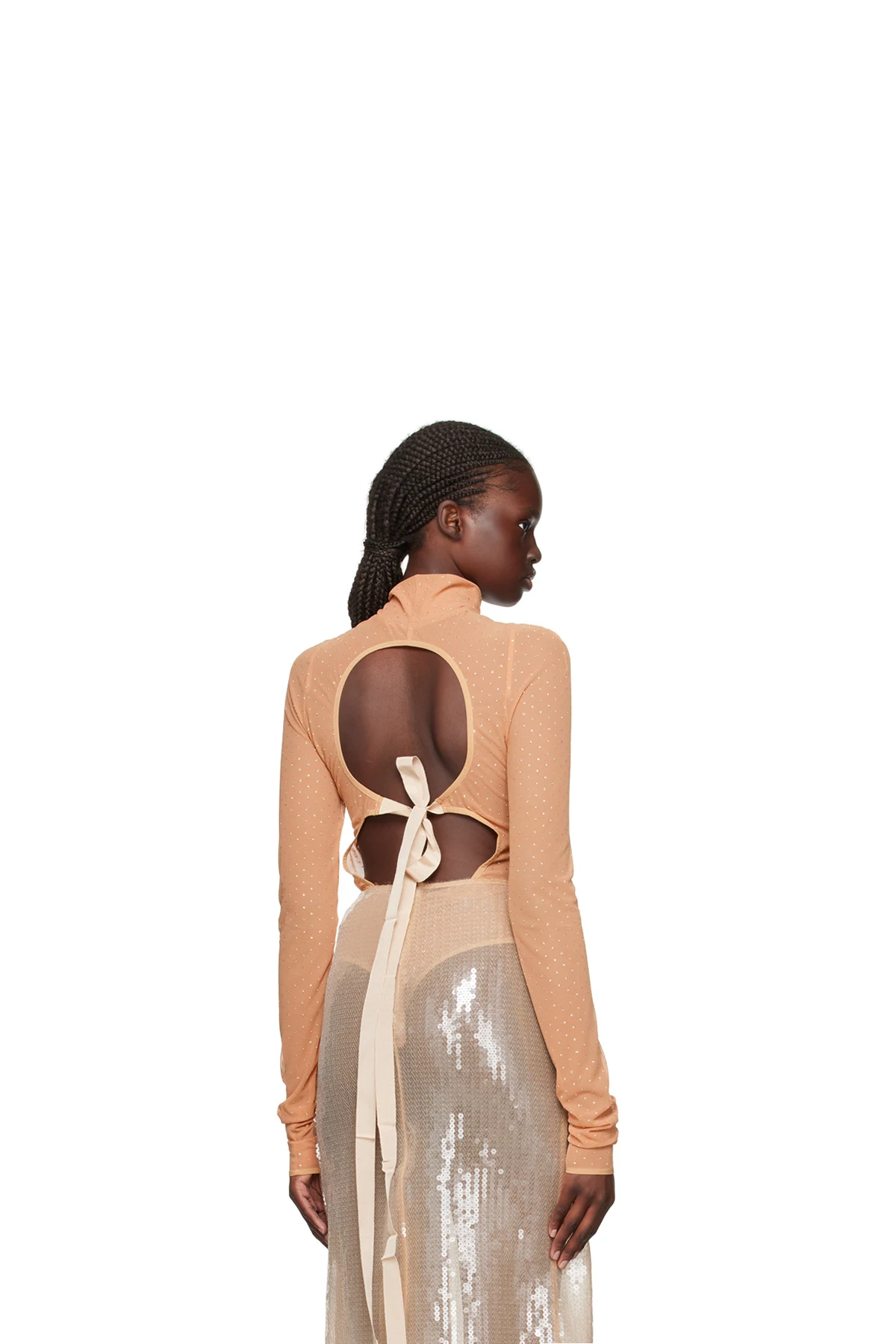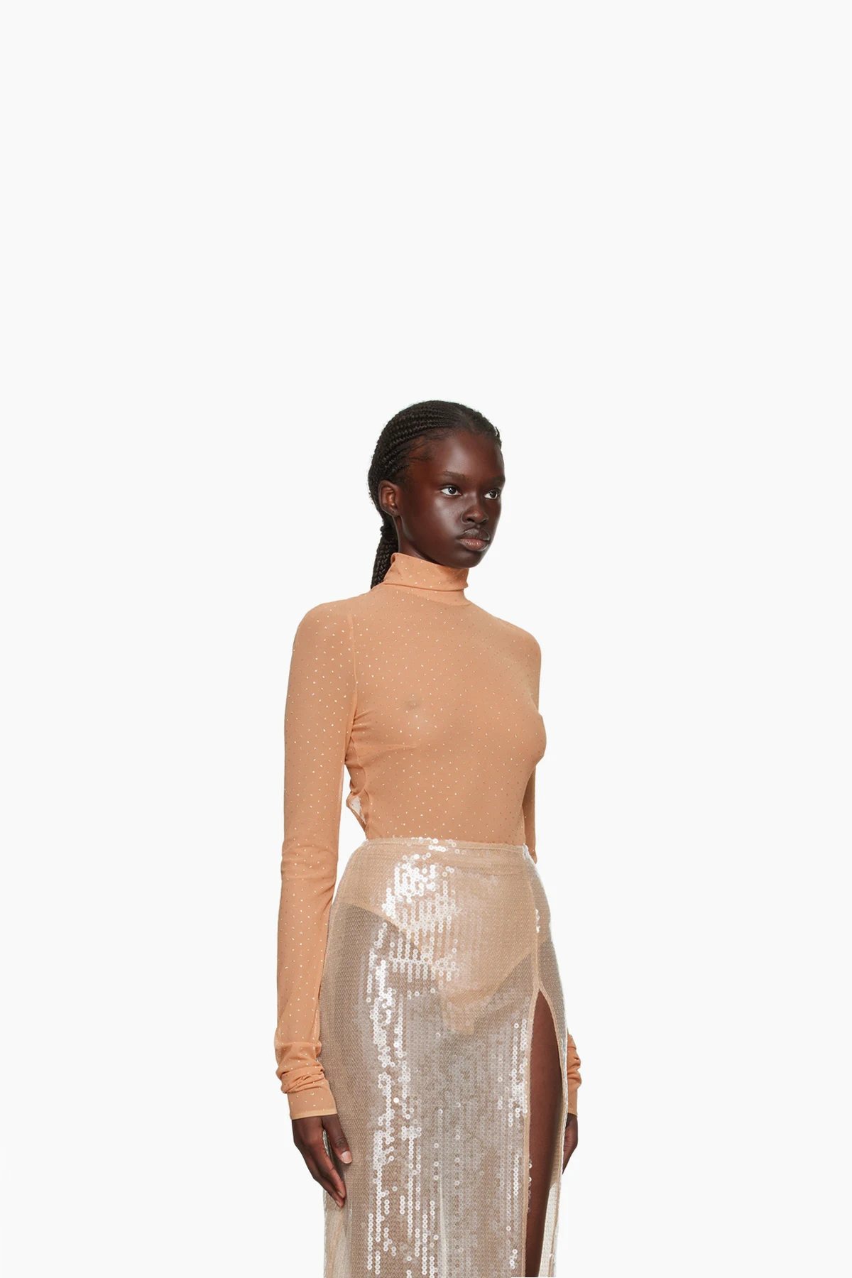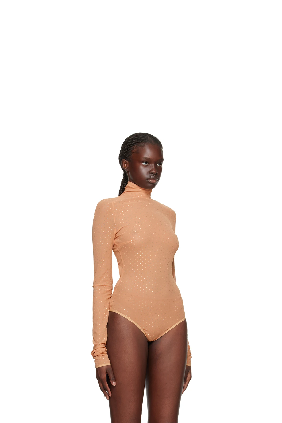 Semi-sheer stretch nylon mesh bodysuit. Glittered detailing throughout.