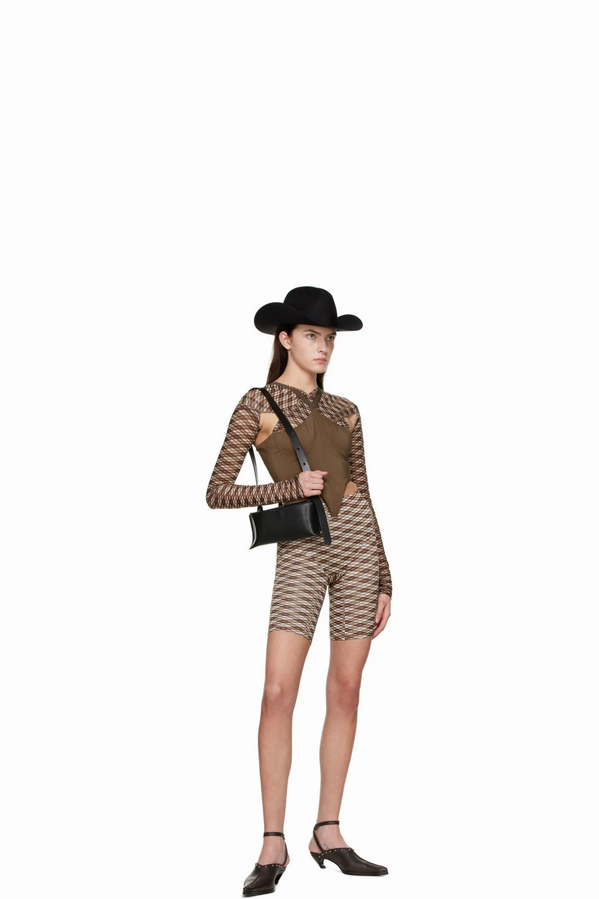 Semi-sheer stretch polyester mesh blouse. Cut-outs and check pattern printed throughout.