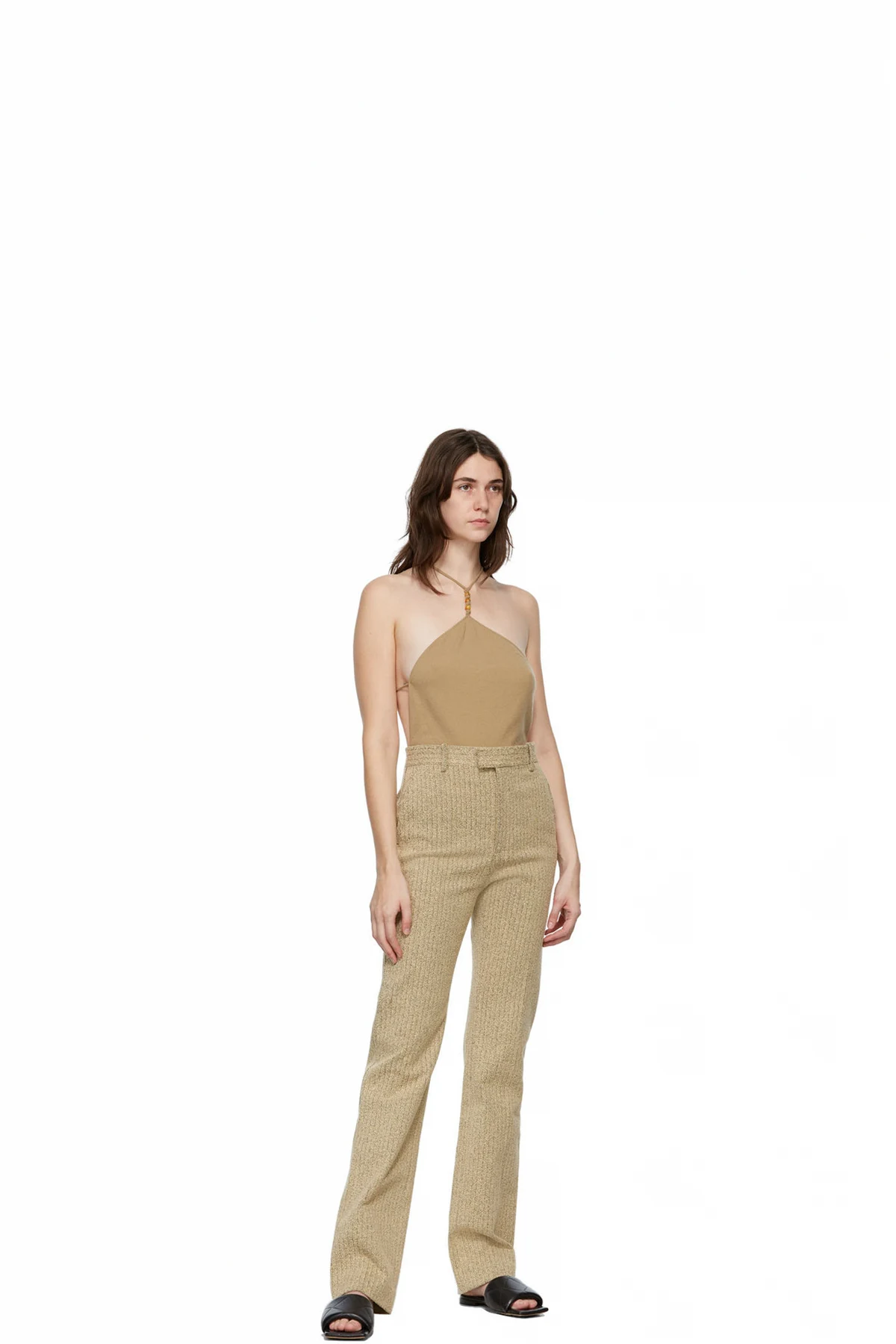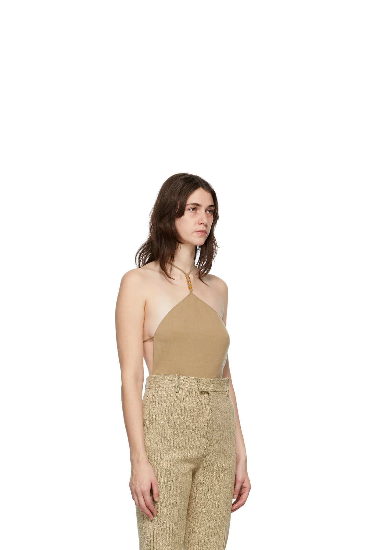 Sleeveless stretch knit cashmere-blend bodysuit in beige. Halter strap featuring beaded detailing. Open back. Press-stud closure at bottom. Brown and silver-tone hardware.
