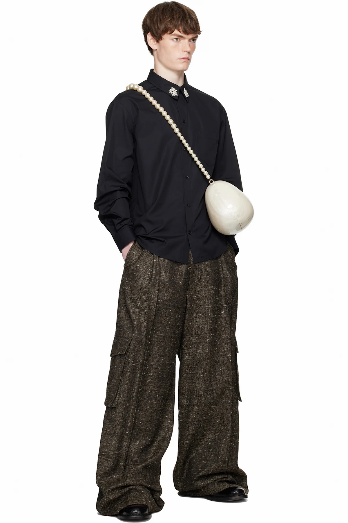 · Faux-pearl floral accents at spread collar