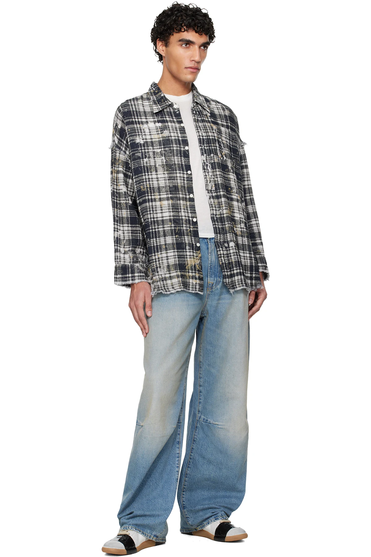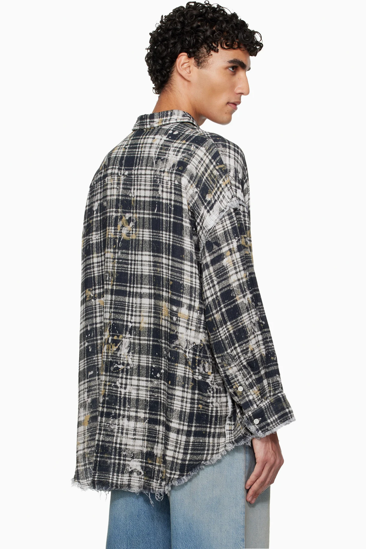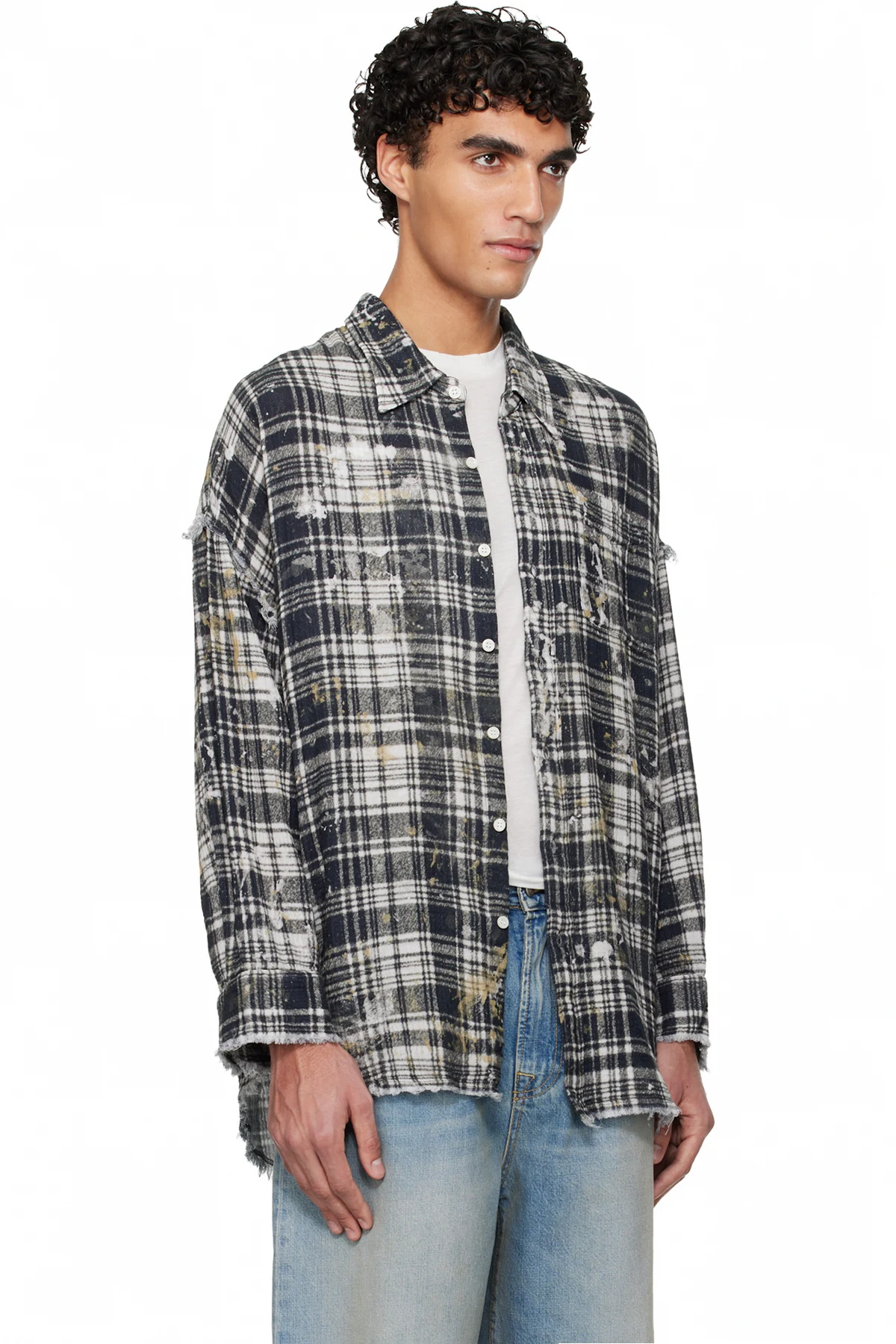· Frayed edges, paint splatter, and check pattern throughout