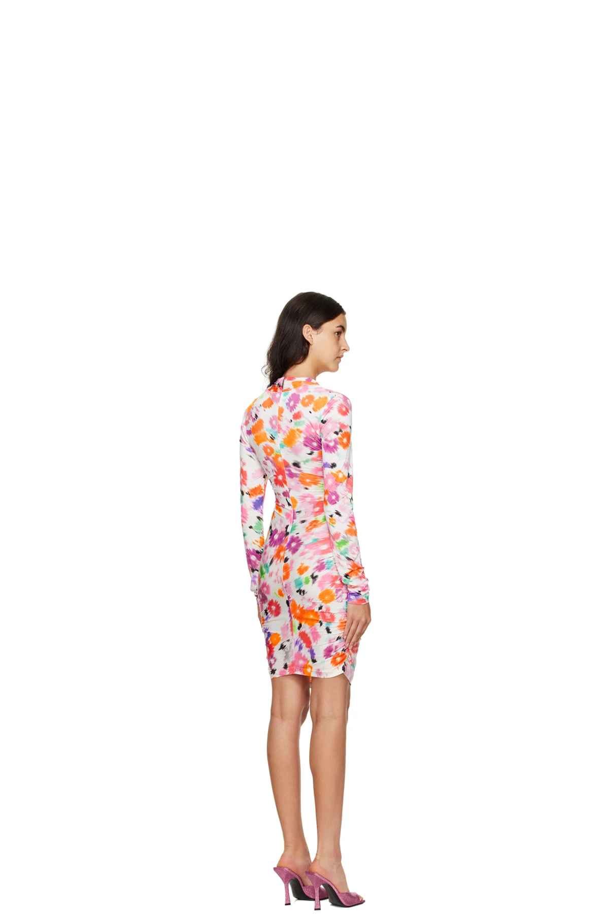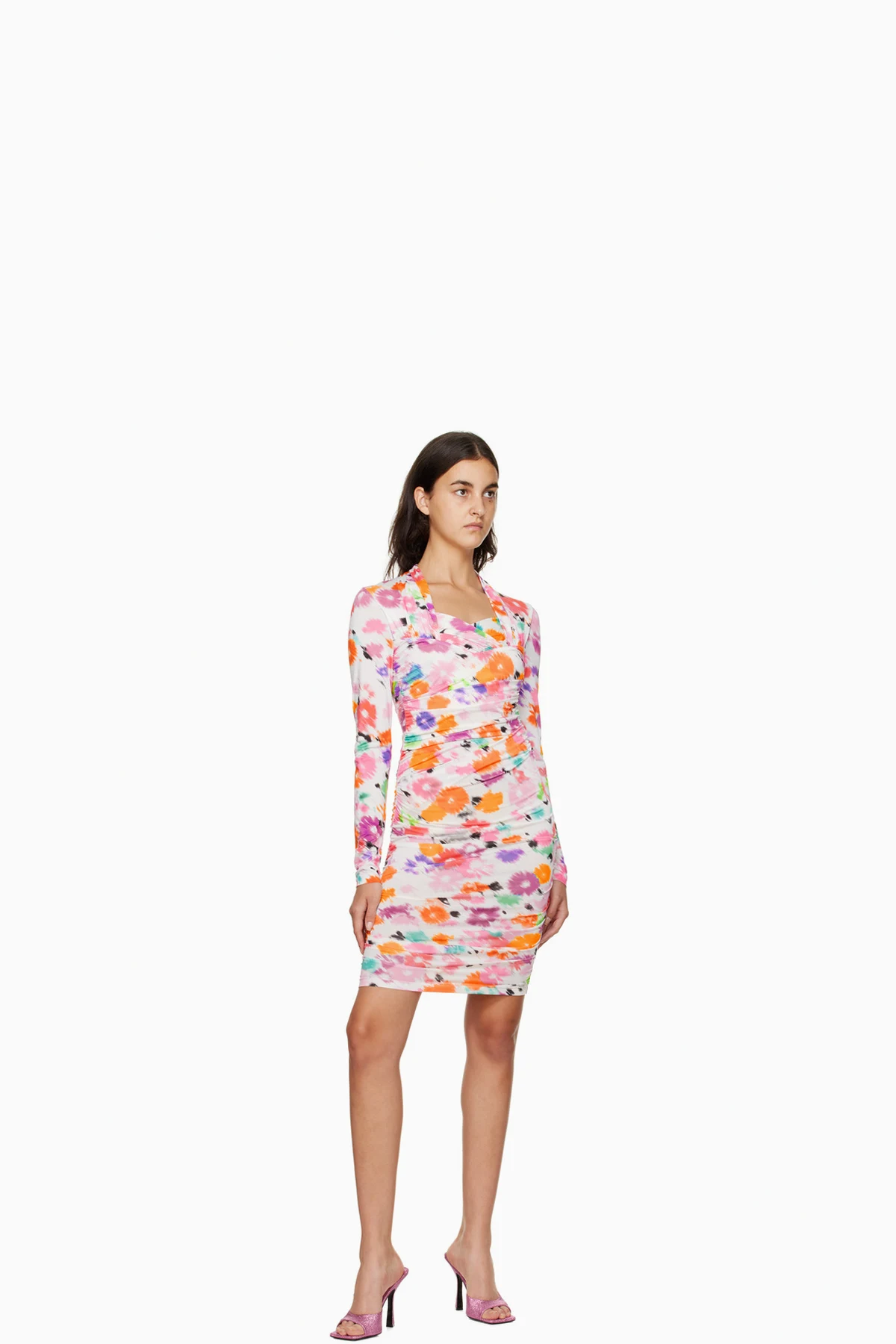 Stretch polyester jersey dress. Gathering and printed floral pattern throughout.
