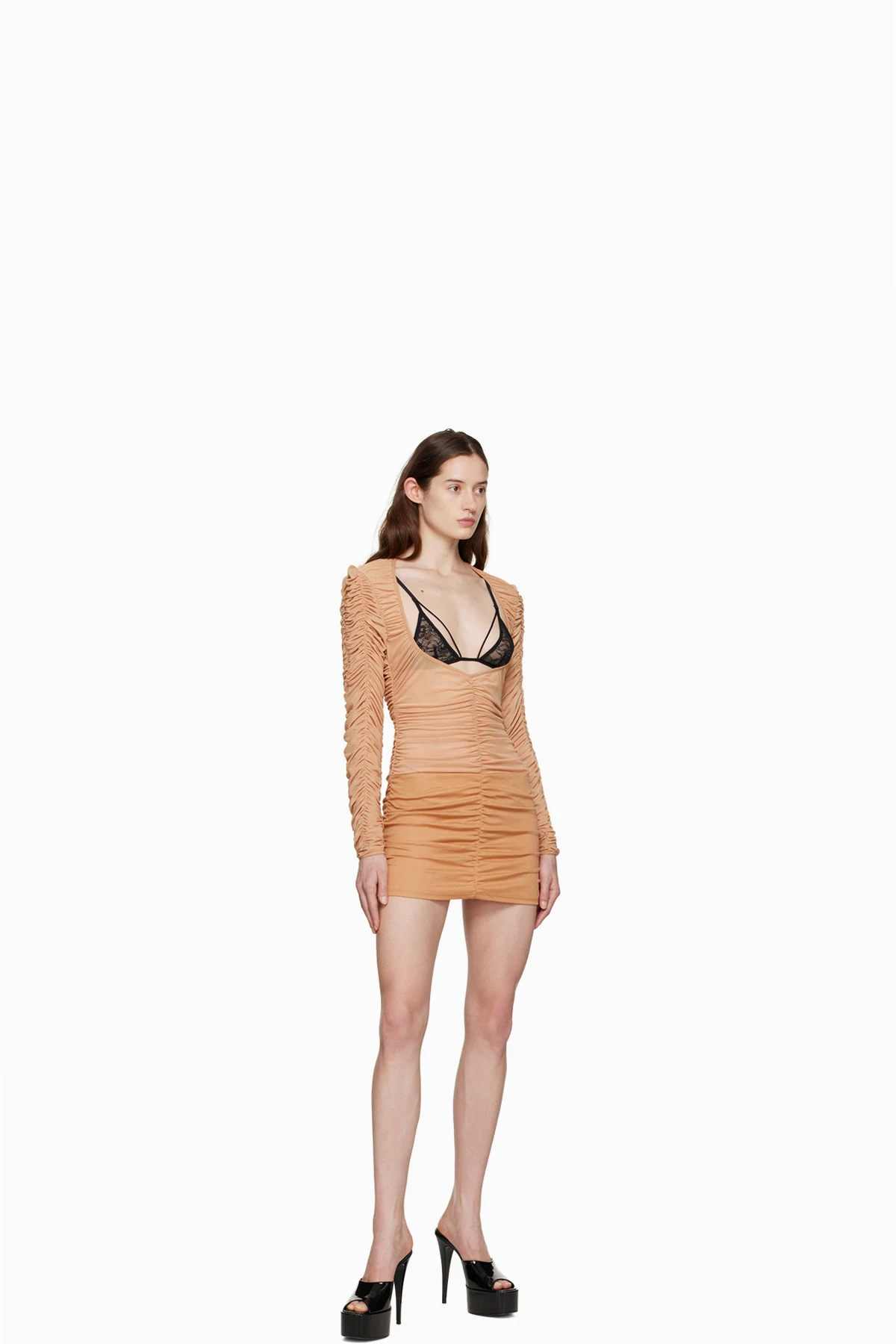 Sheer polyester mesh dress. Ruching throughout.