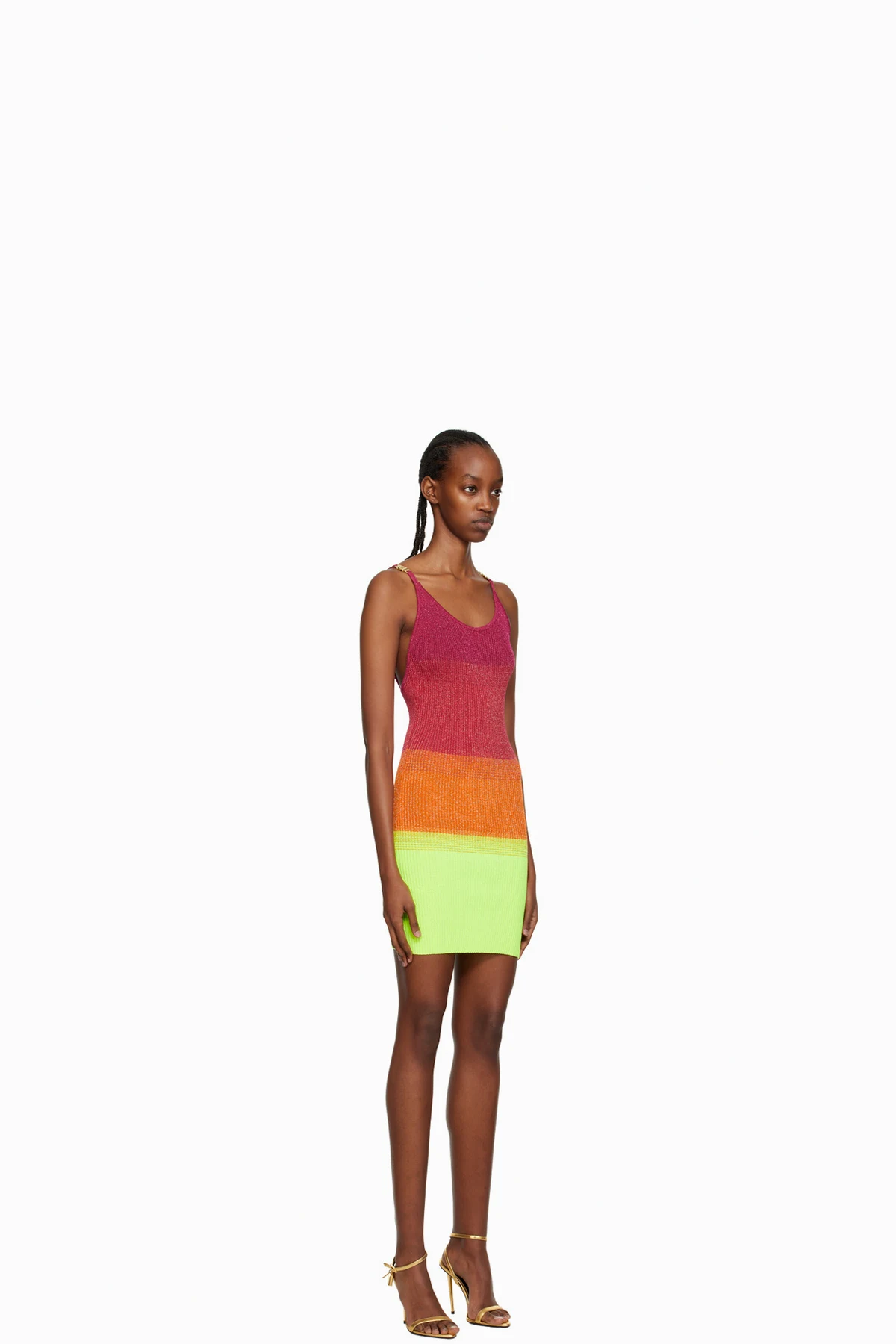 Rib knit viscose-blend dress. Gradient pattern and metallic thread detailing throughout.