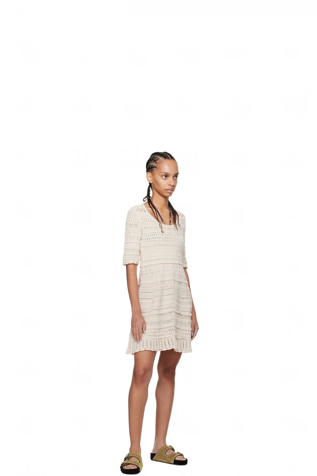 Semi-sheer crocheted cotton dress. Scalloped edge at scoop neck and hem.