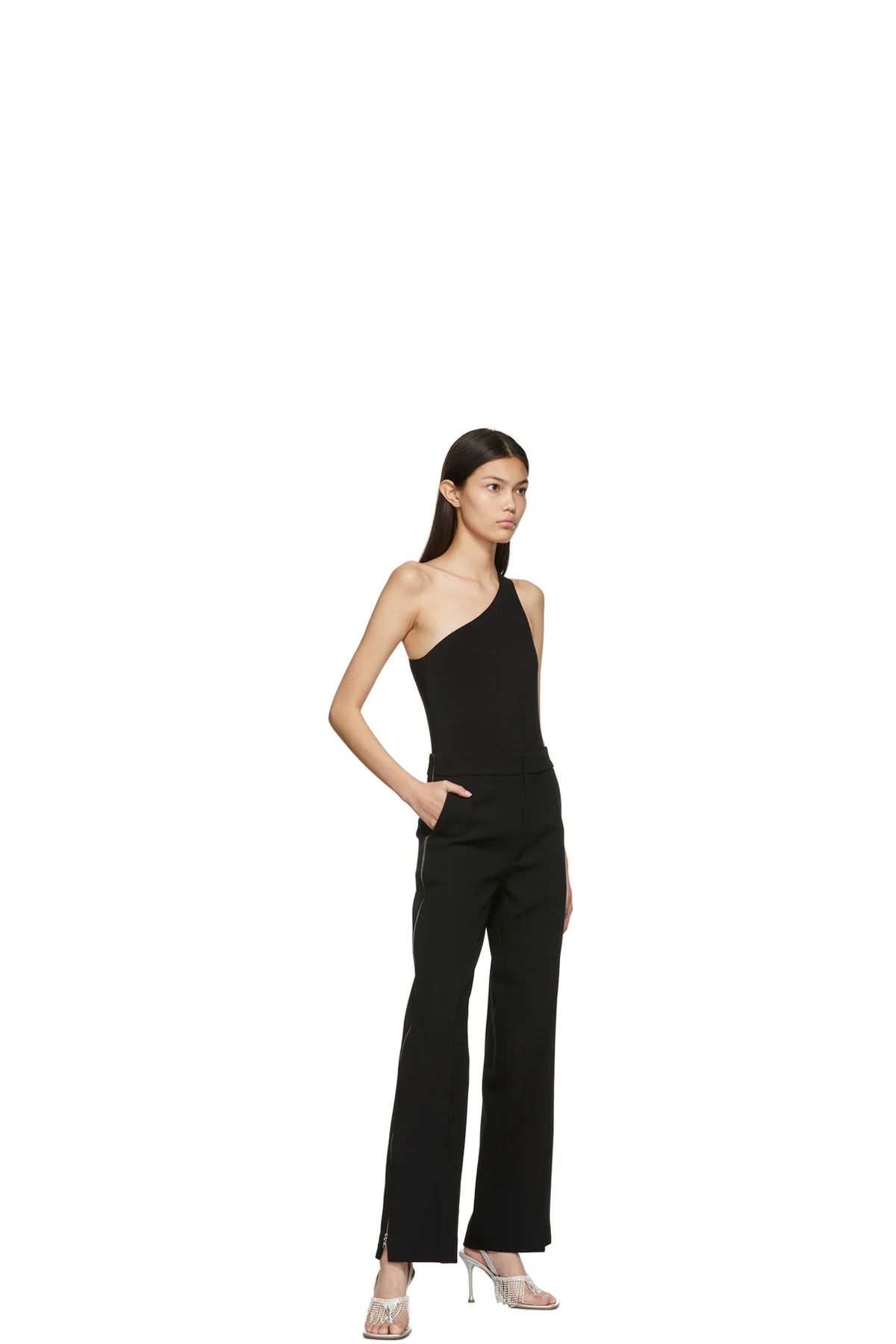 Sleeveless stretch nylon jersey single-shoulder bodysuit in black.