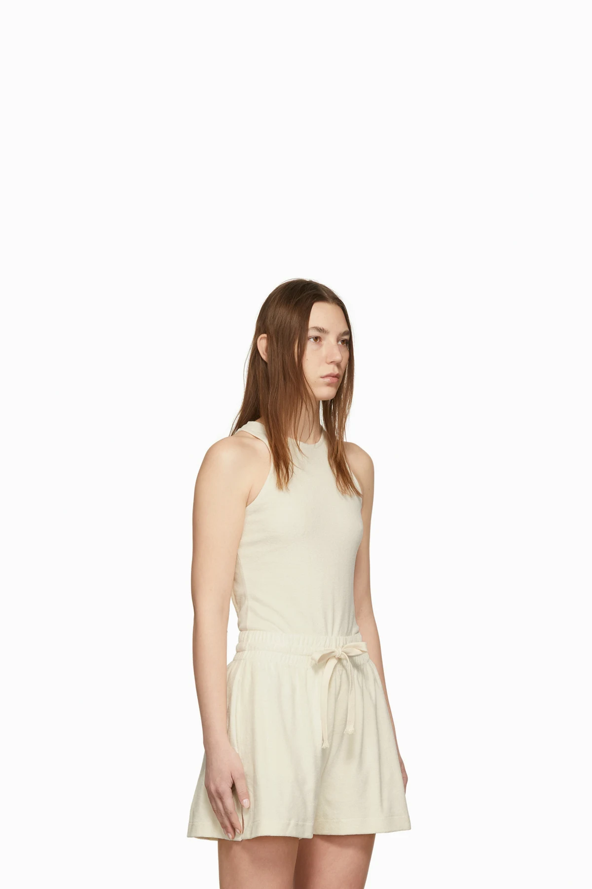 Sleeveless cotton and nylon-blend terrycloth bodysuit in off-white. Logo embroidered in navy at back collar.