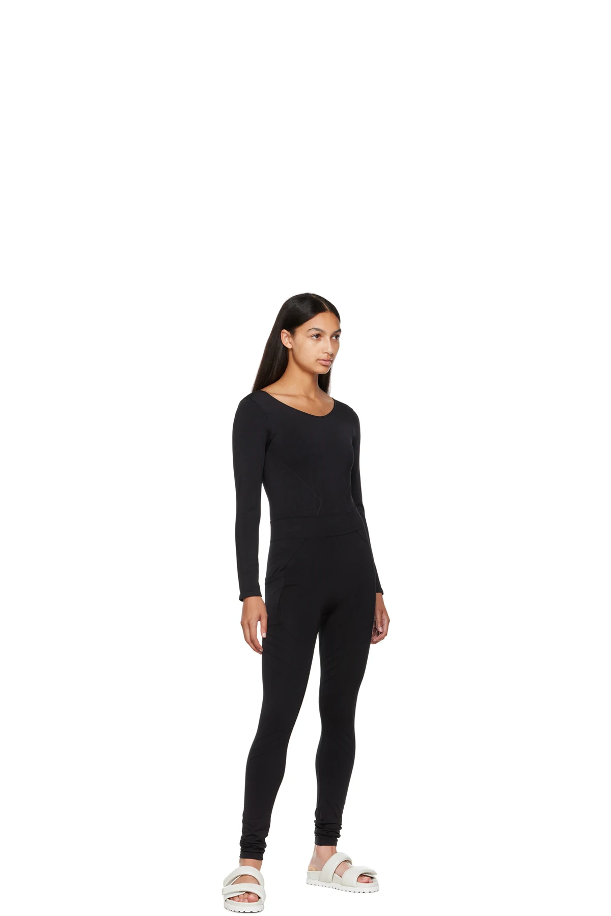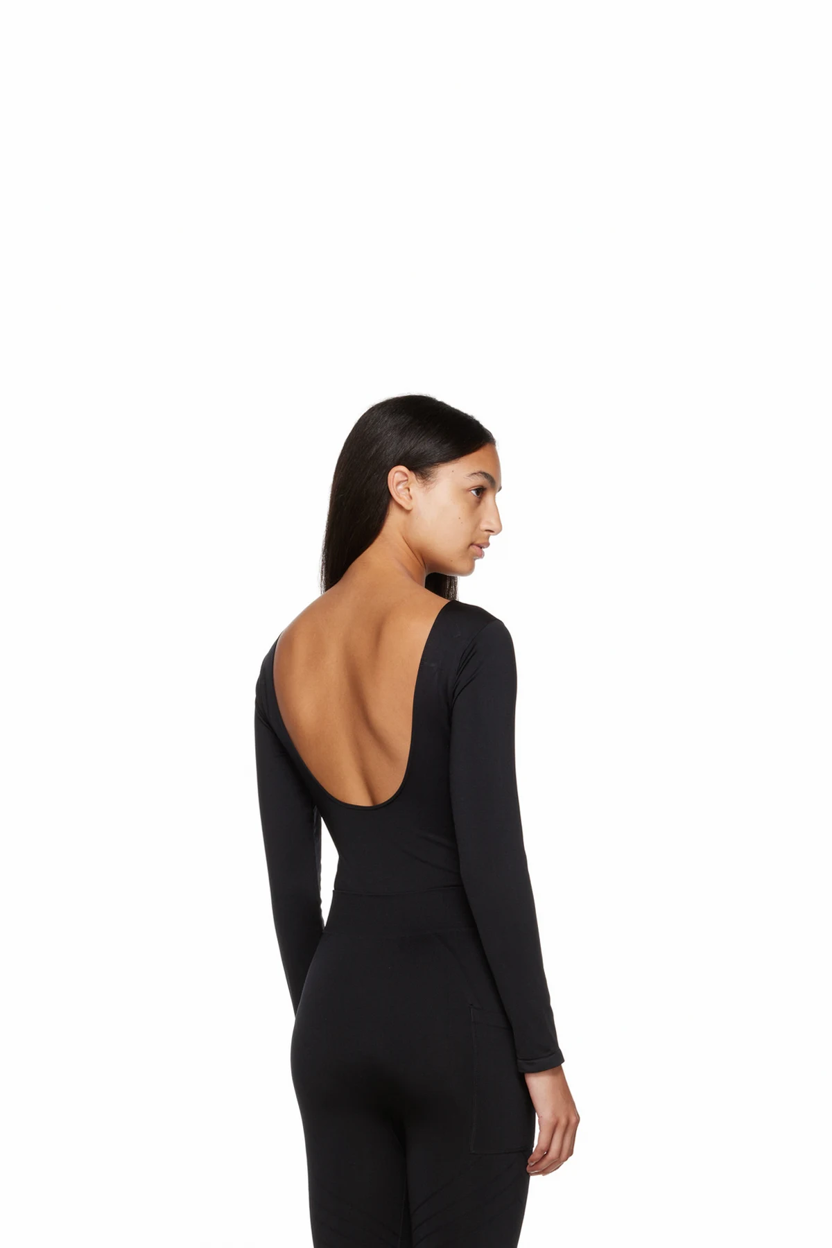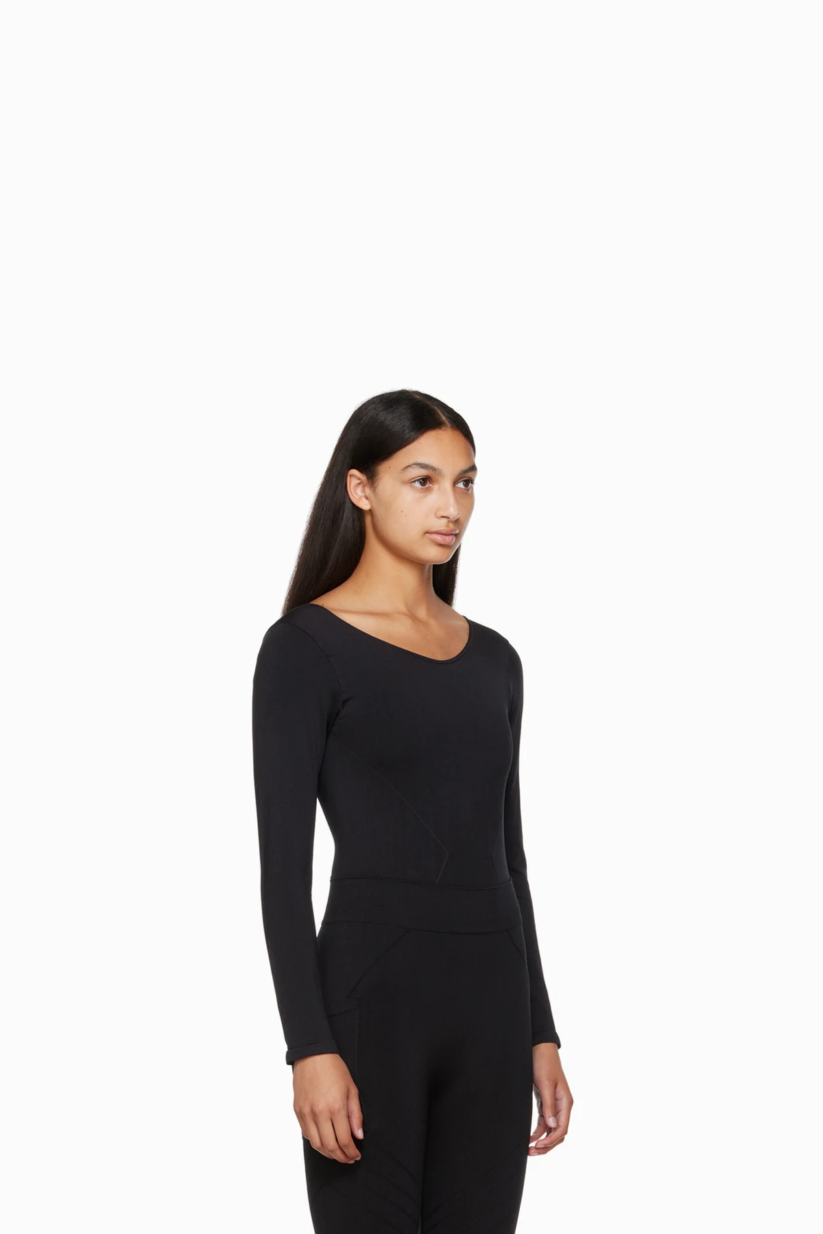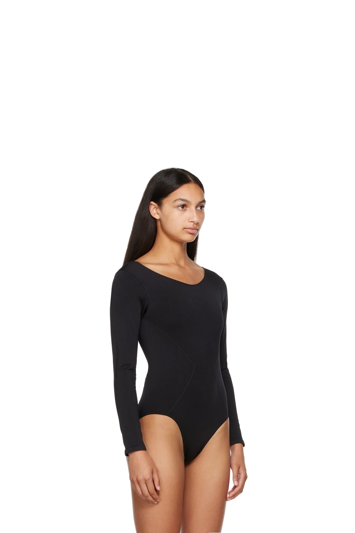 Sweat-wicking, chlorine-resistant, and quick-drying stretch nylon jersey bodysuit.