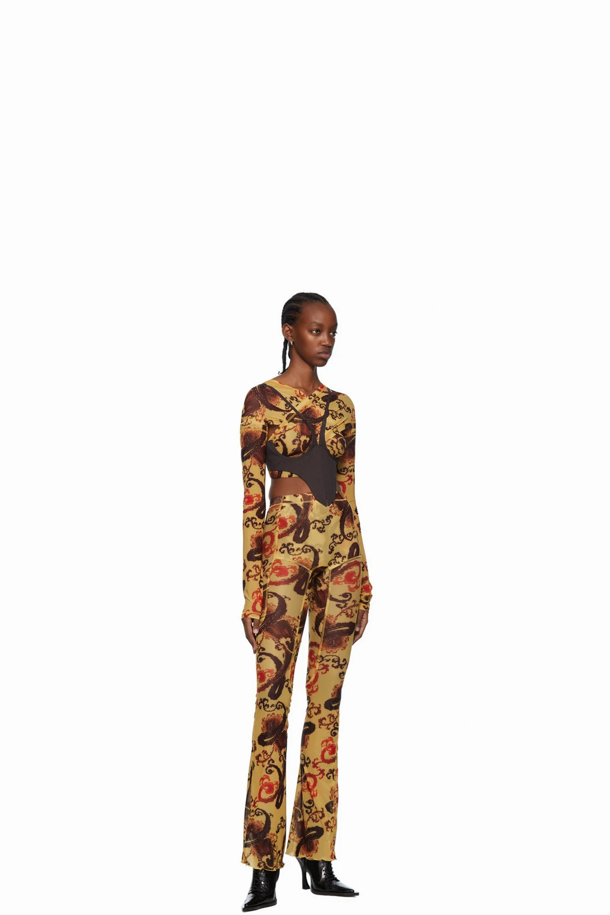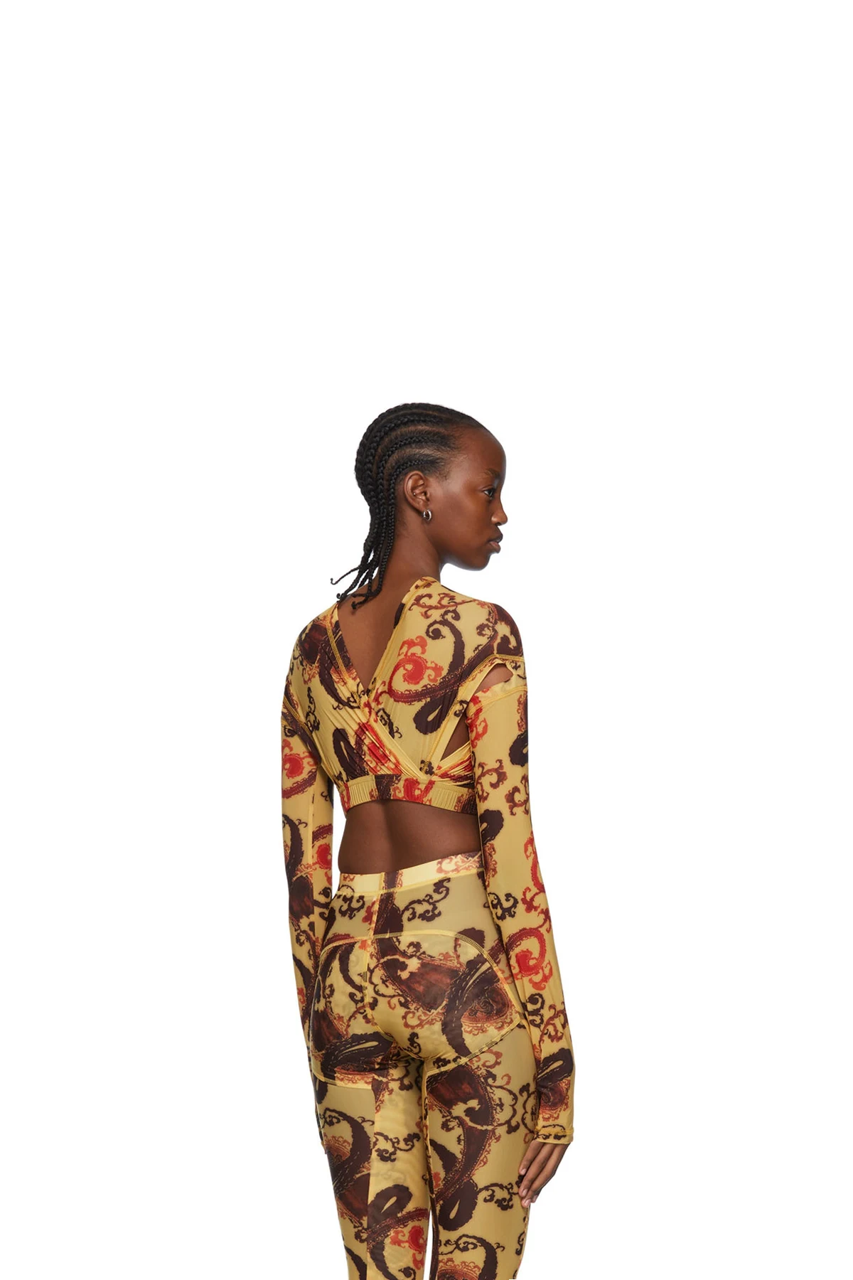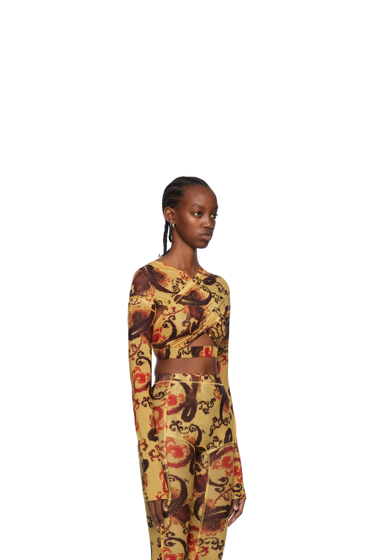 Semi-sheer stretch polyester mesh blouse. Layered construction.