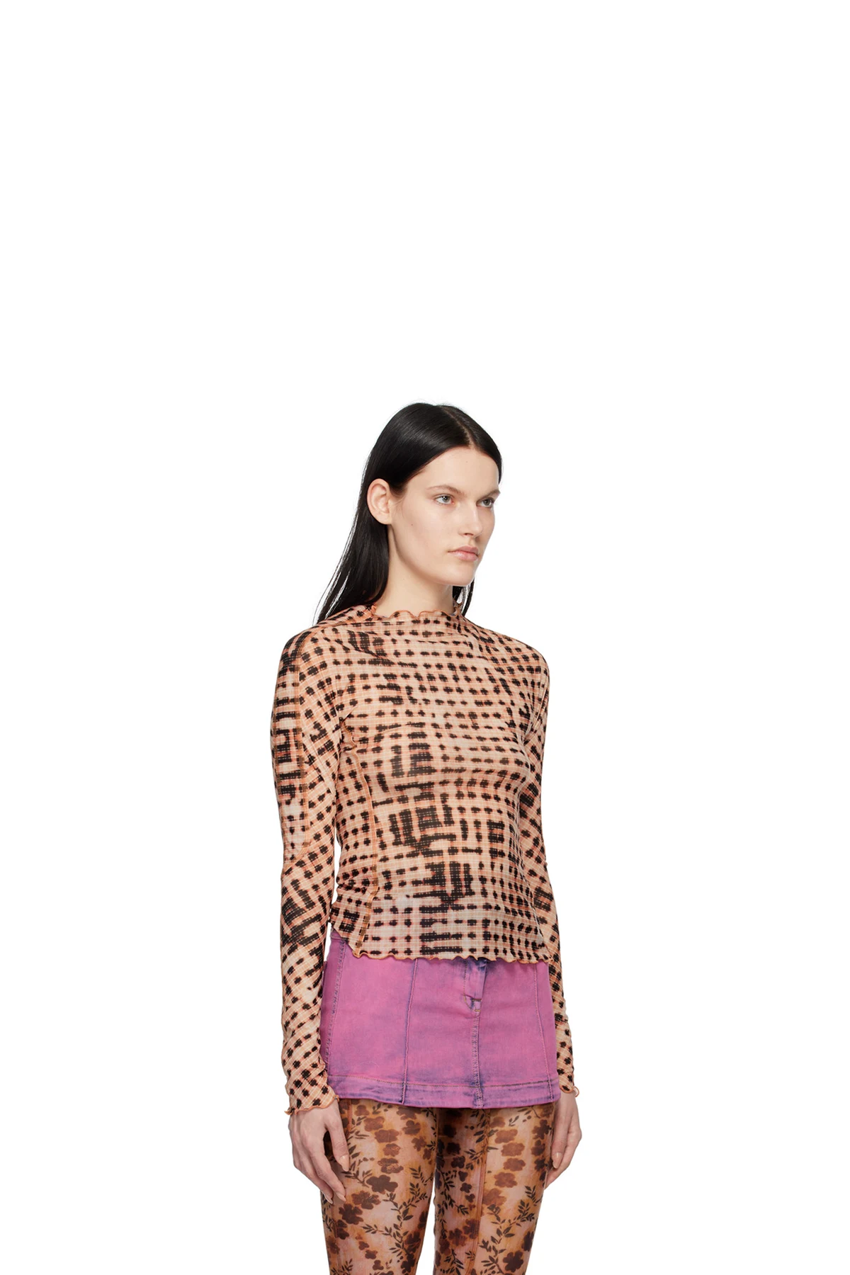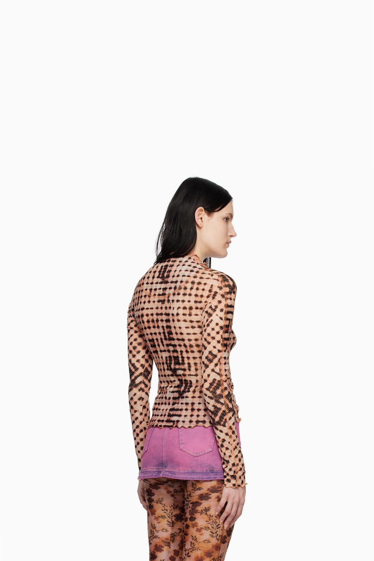 Semi-sheer stretch polyester mesh blouse. Modified plaid pattern printed throughout.