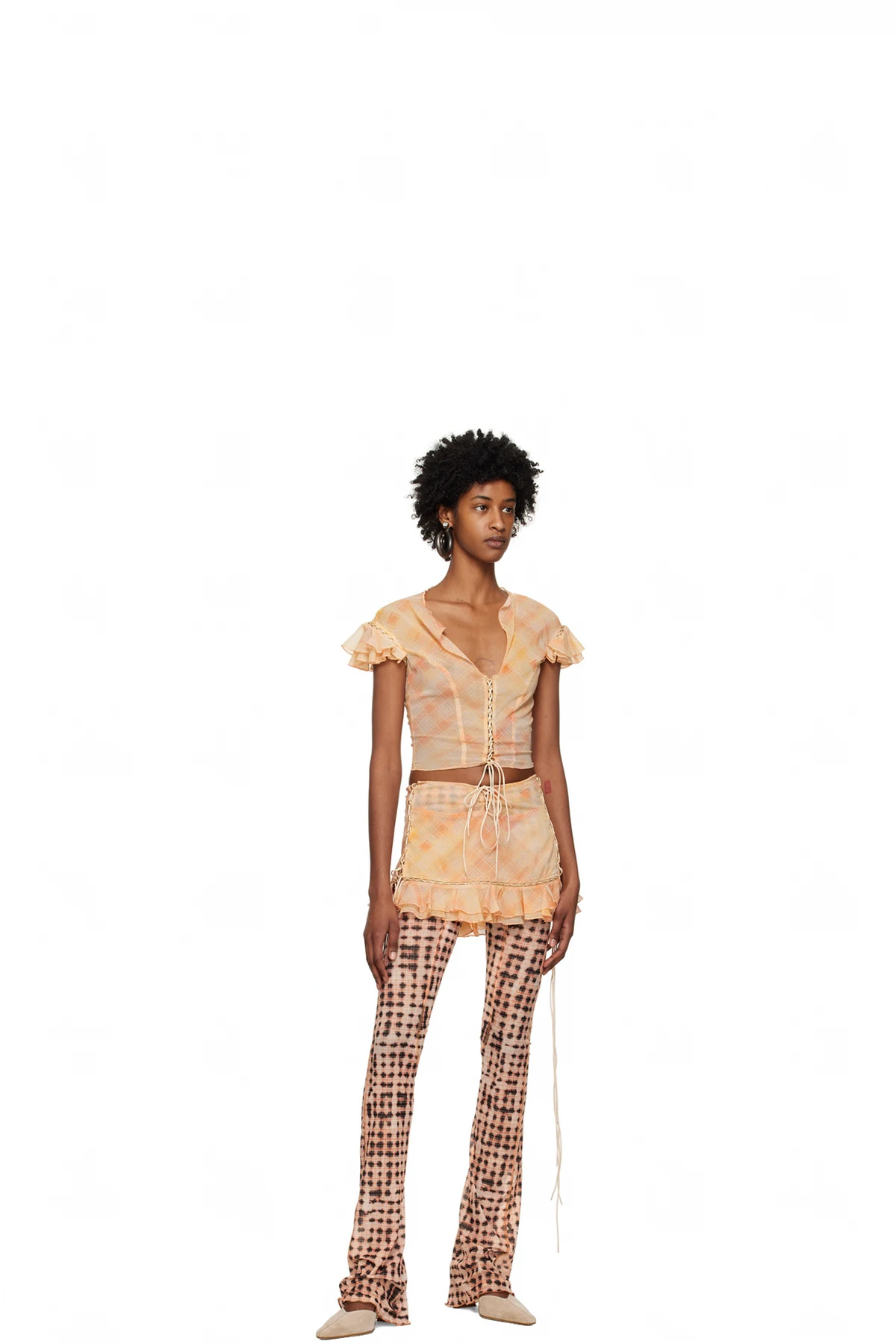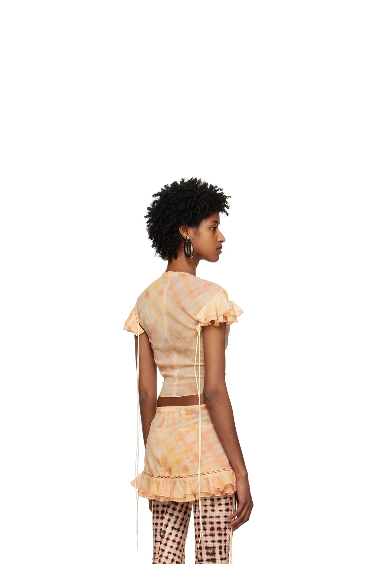 Semi-sheer stretch silk chiffon blouse. Lettuce edges and graphic pattern throughout.