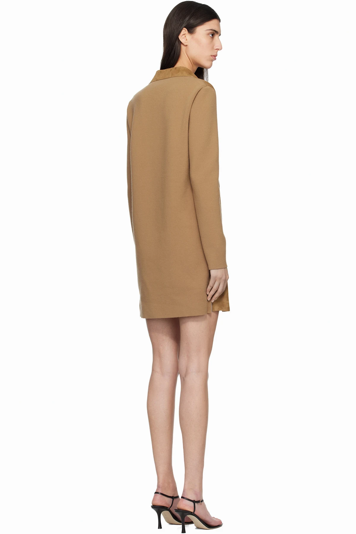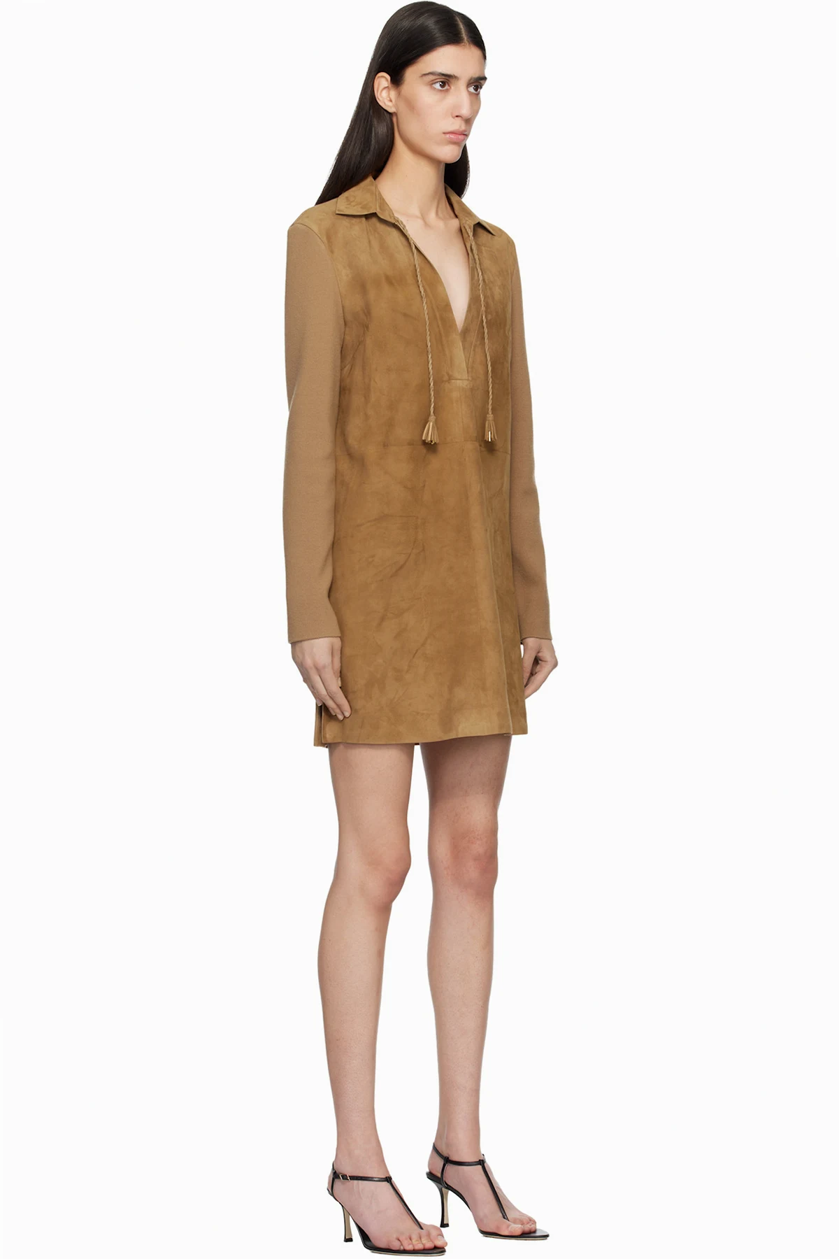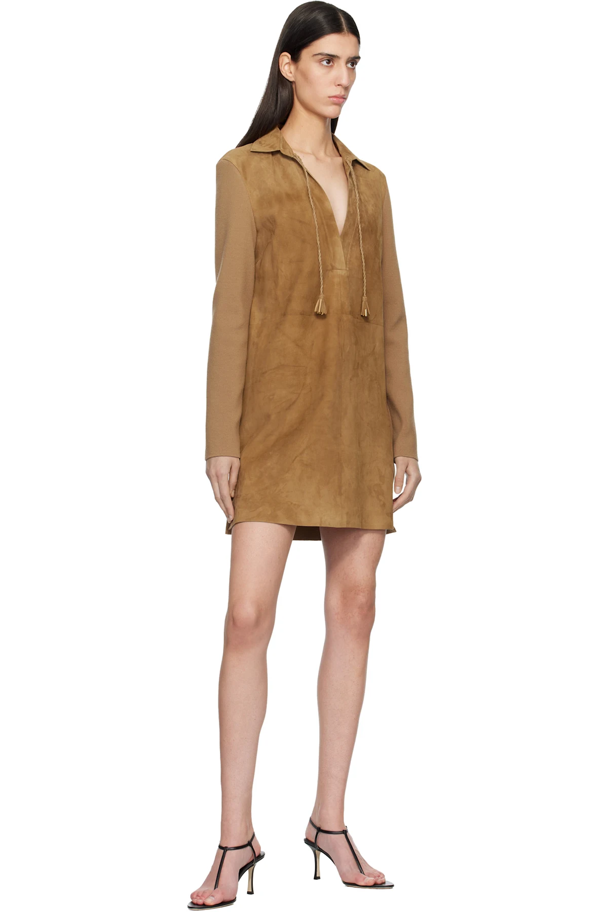 Paneled lambskin suede and knit wool minidress.