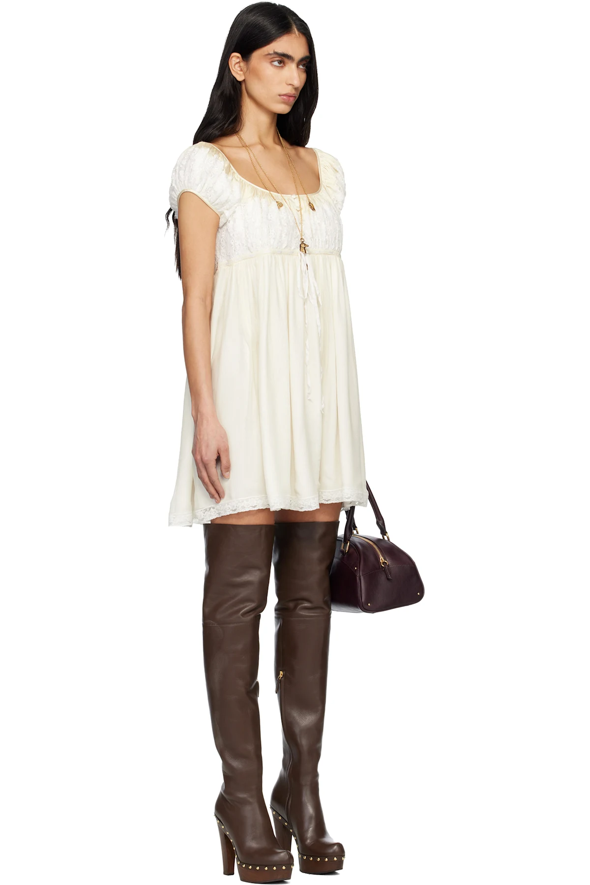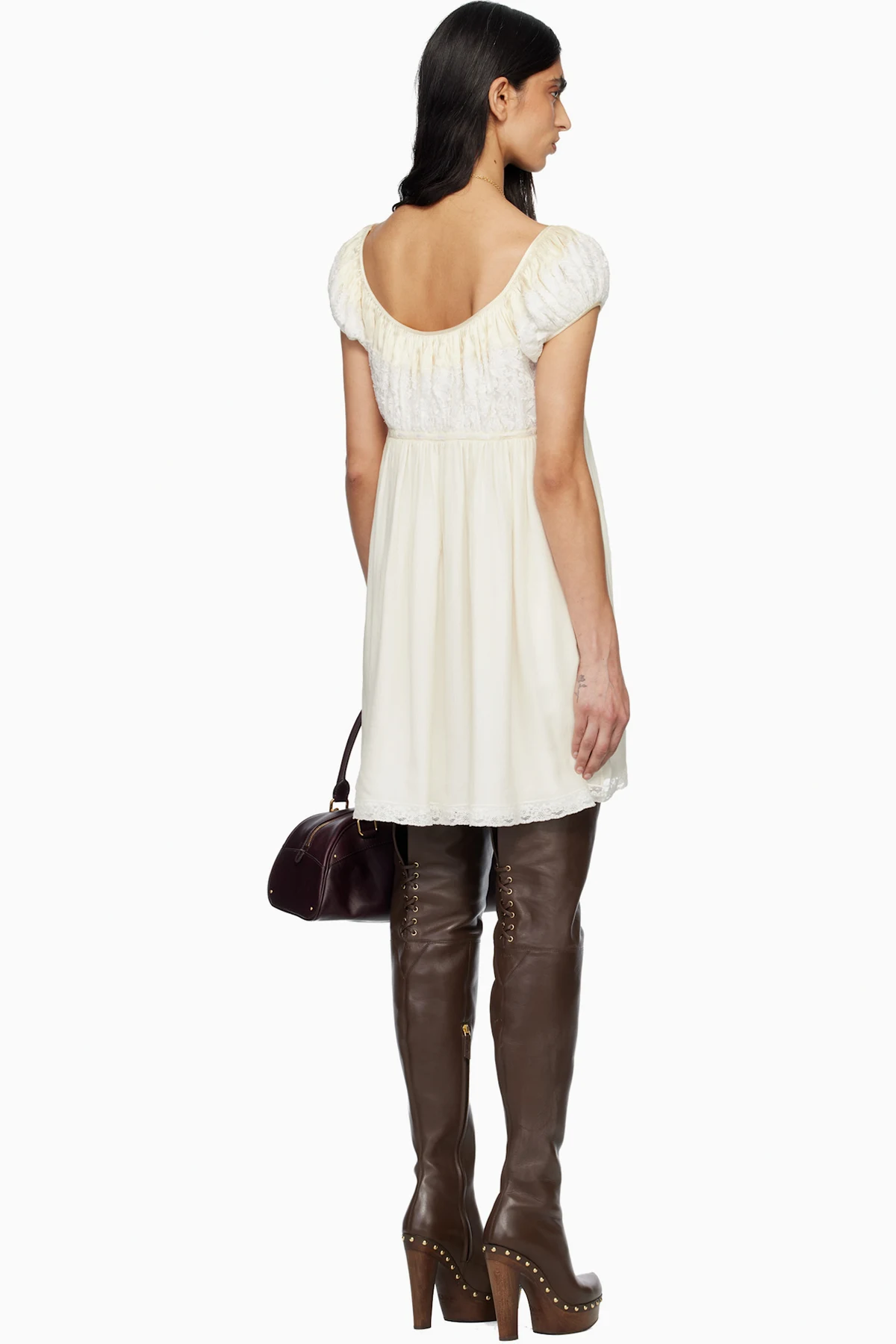 Off-White Short Sleeve Silk Mousseline & Lace Minidress