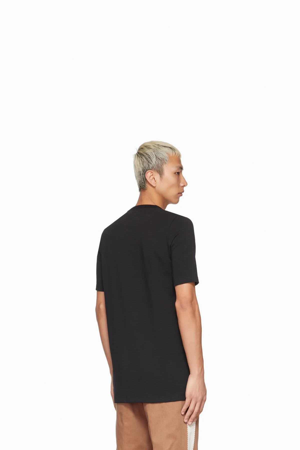 Short sleeve cotton-blend rib knit T-shirt in black featuring bonded graphic at front. Crewneck collar.