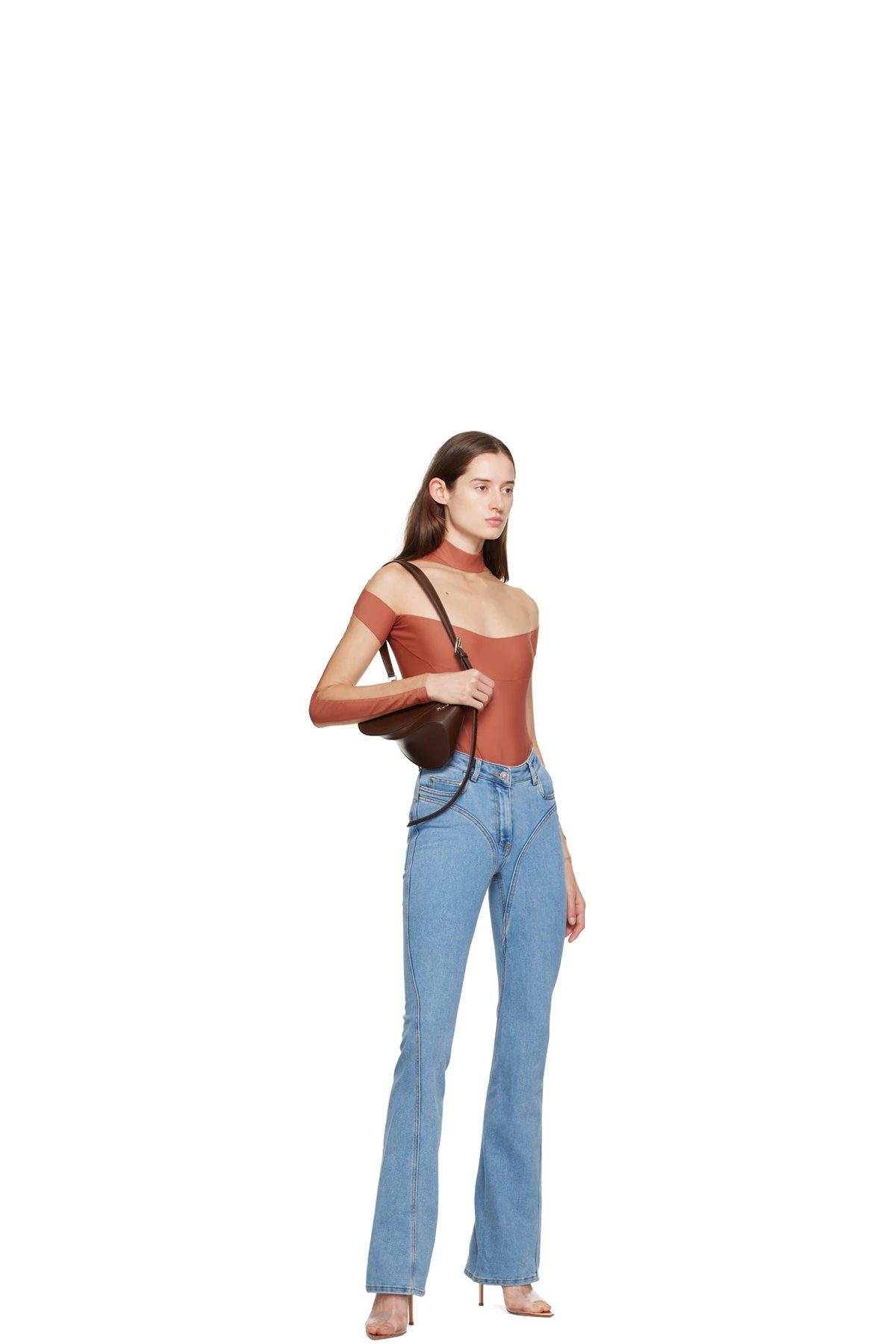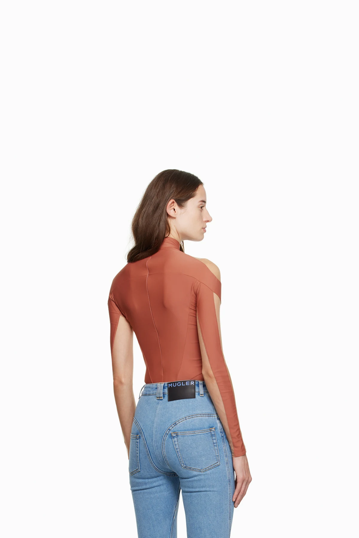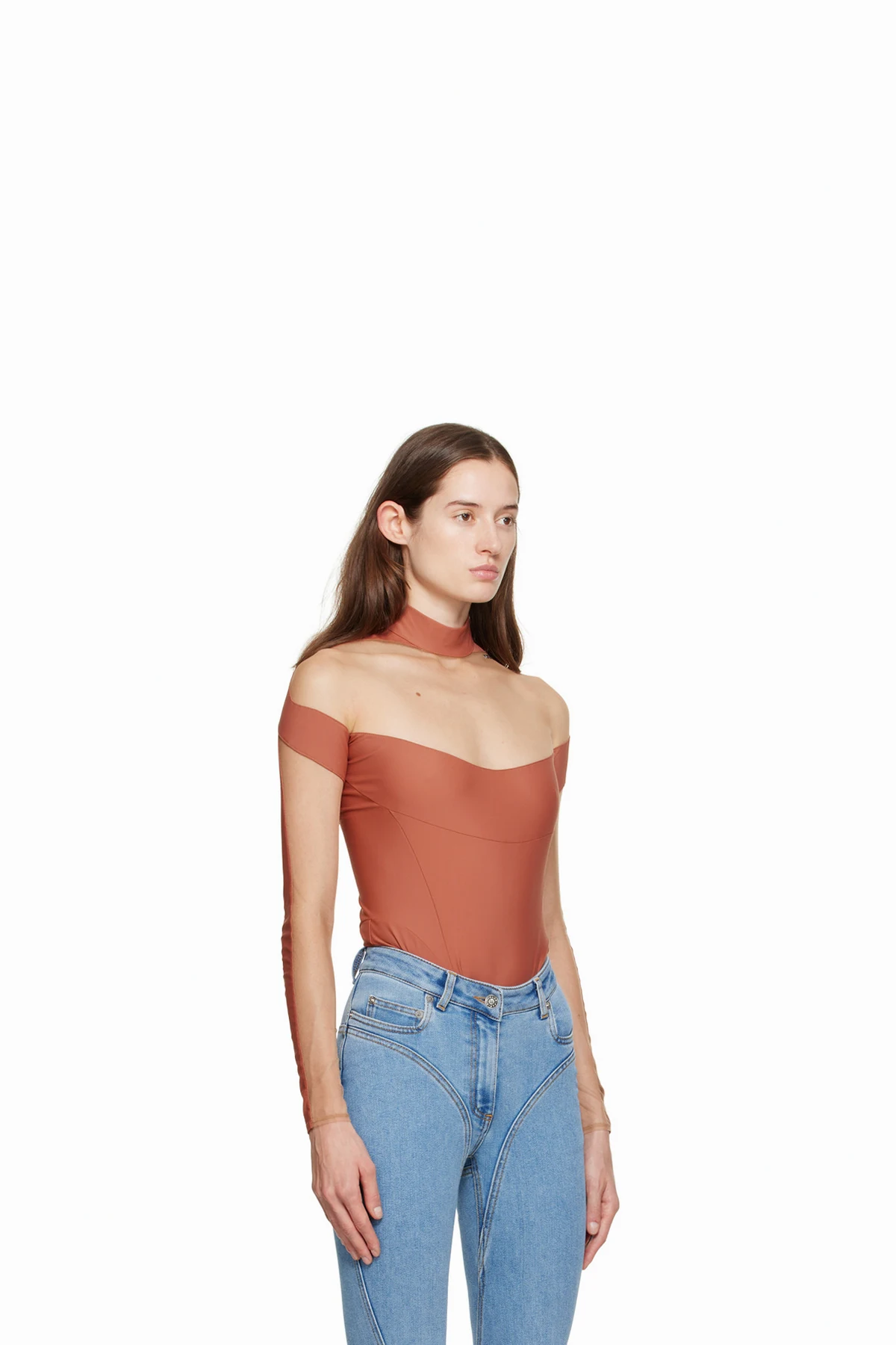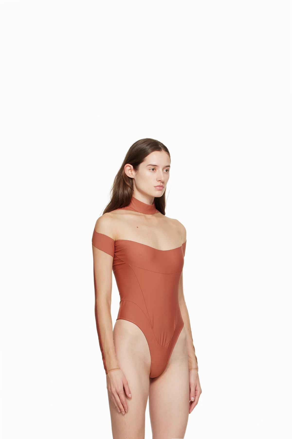 Semi-sheer stretch nylon jersey and stretch nylon mesh bodysuit.