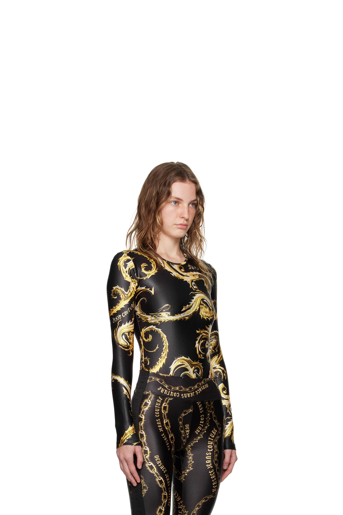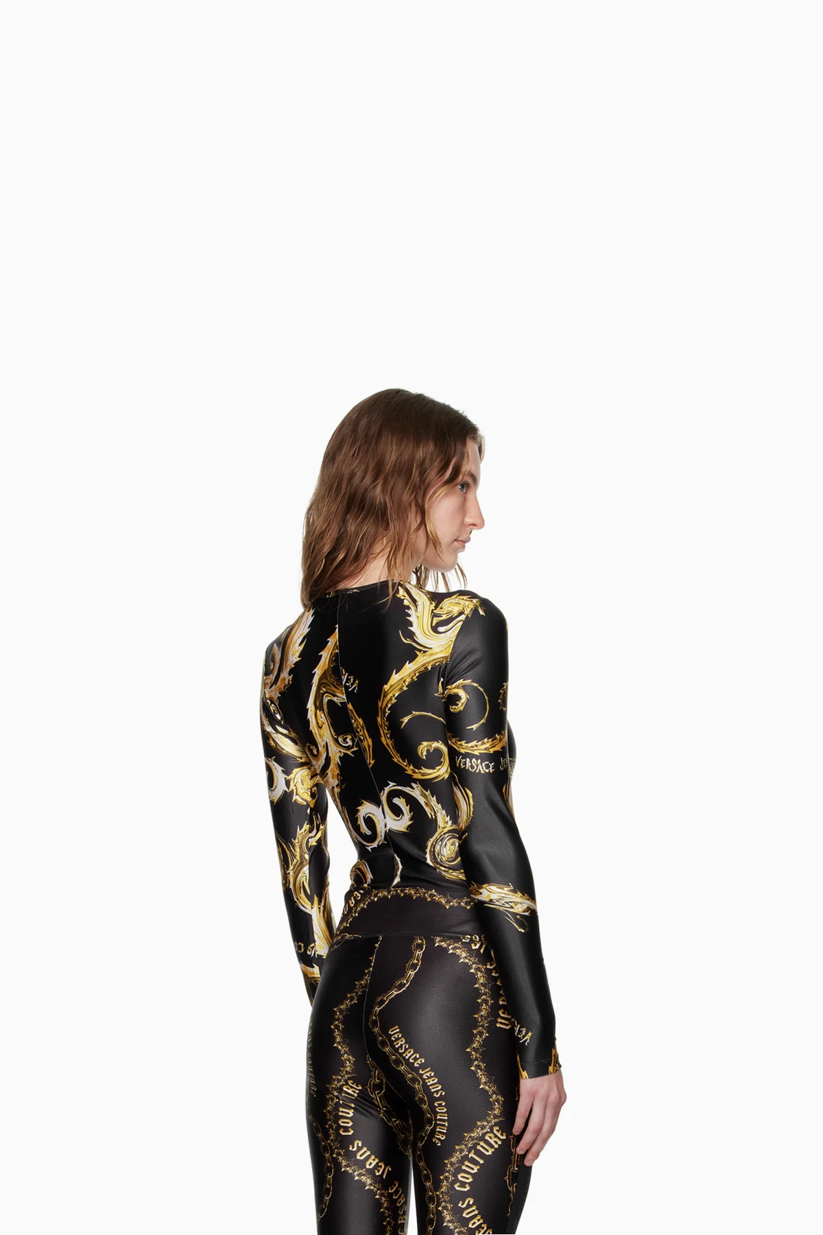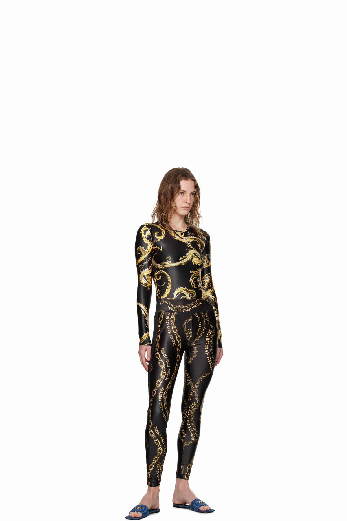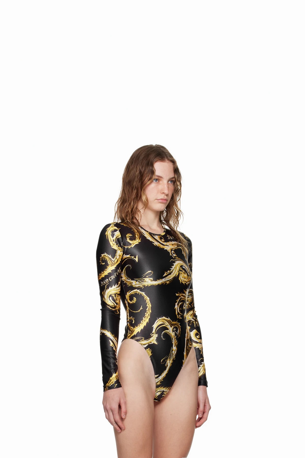 Stretch polyester jersey bodysuit. Graphic pattern and logos printed throughout.