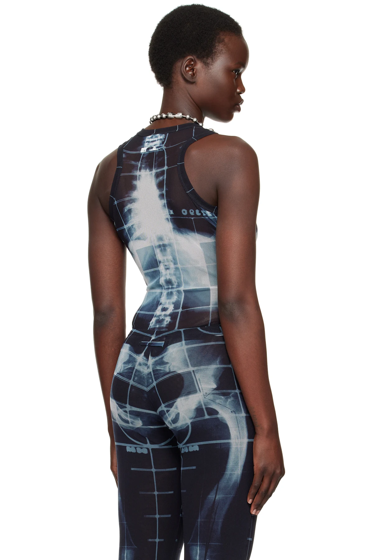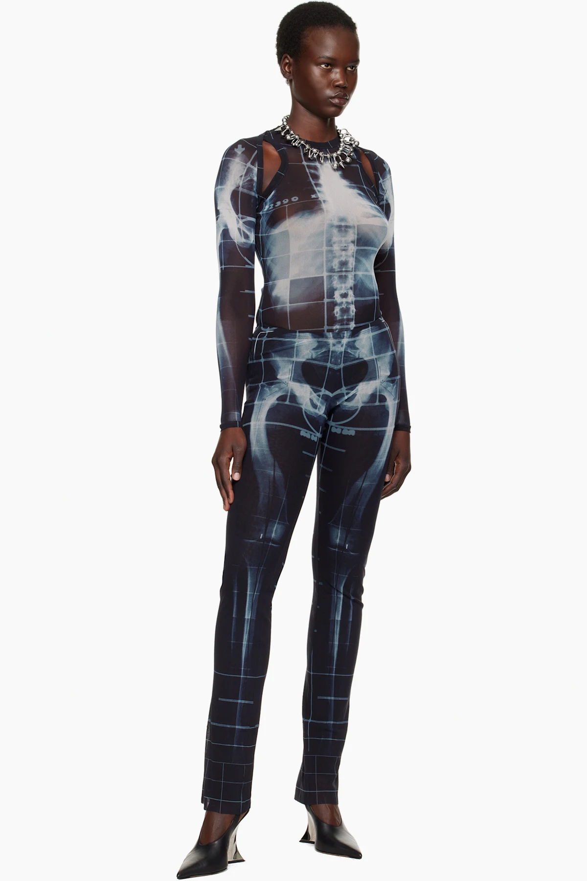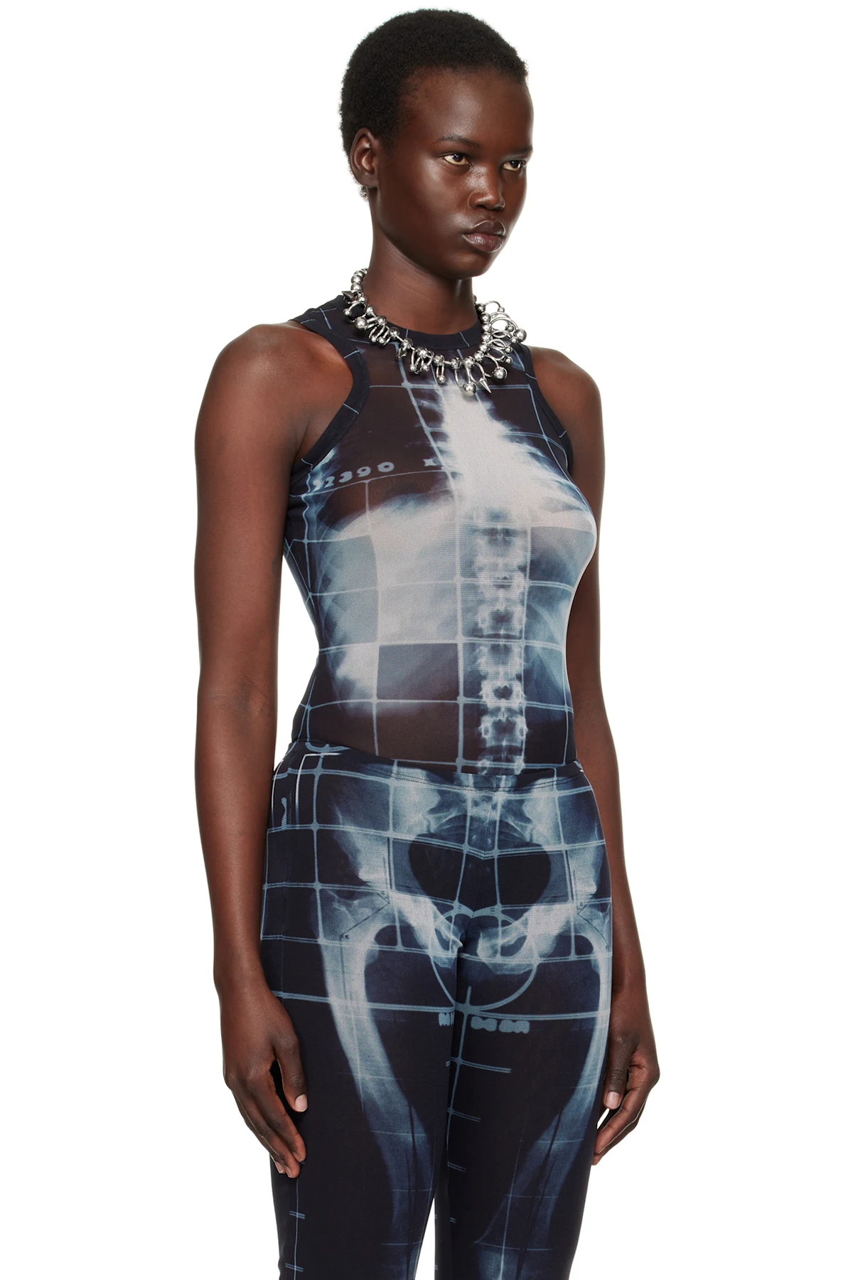Semi-sheer nylon tulle bodysuit. Graphic and check pattern printed throughout.