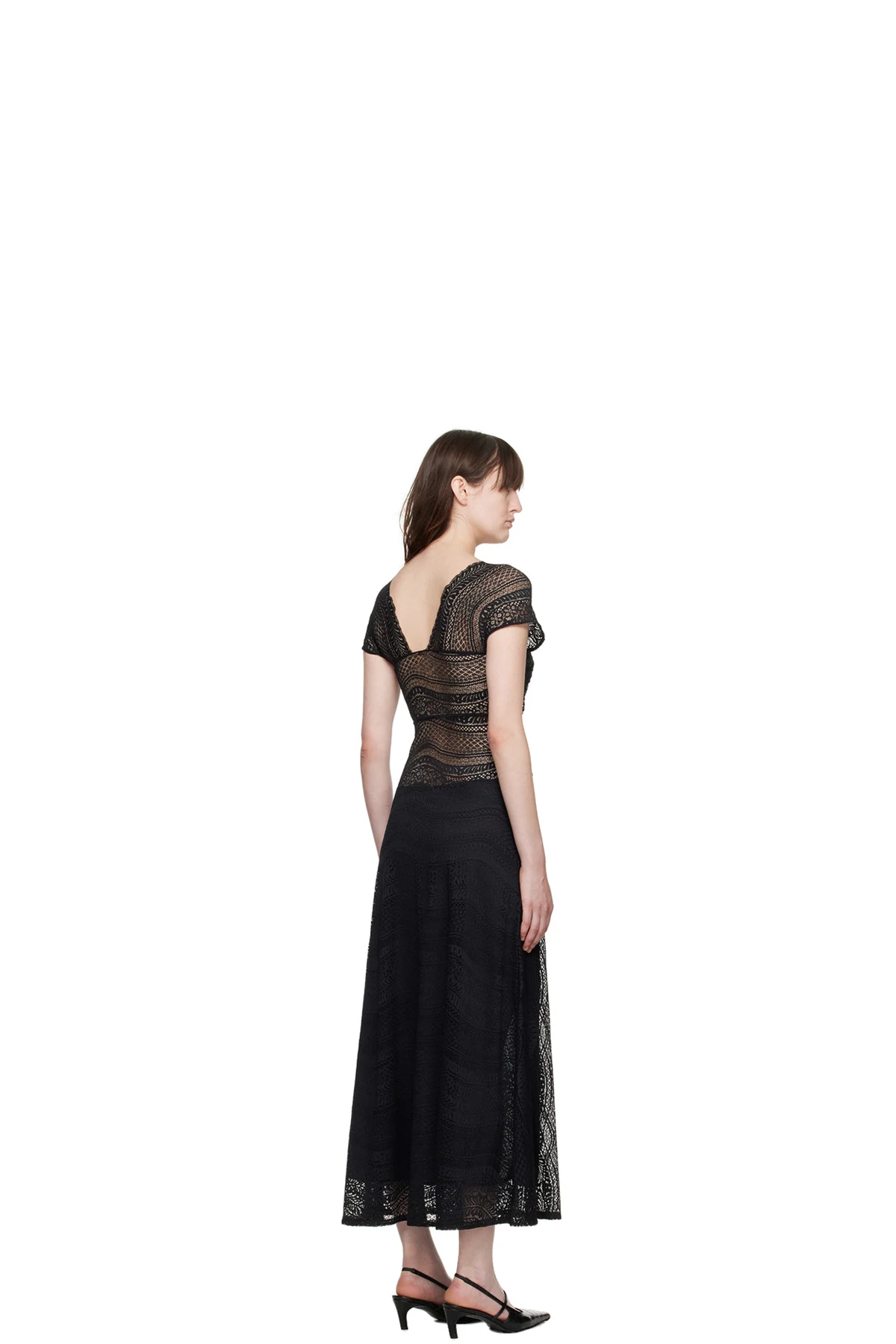 Semi-sheer stretch nylon-blend lace dress. Gathering, floral pattern, and scalloped edges throughout.