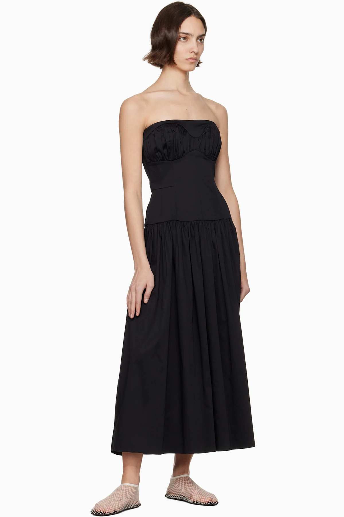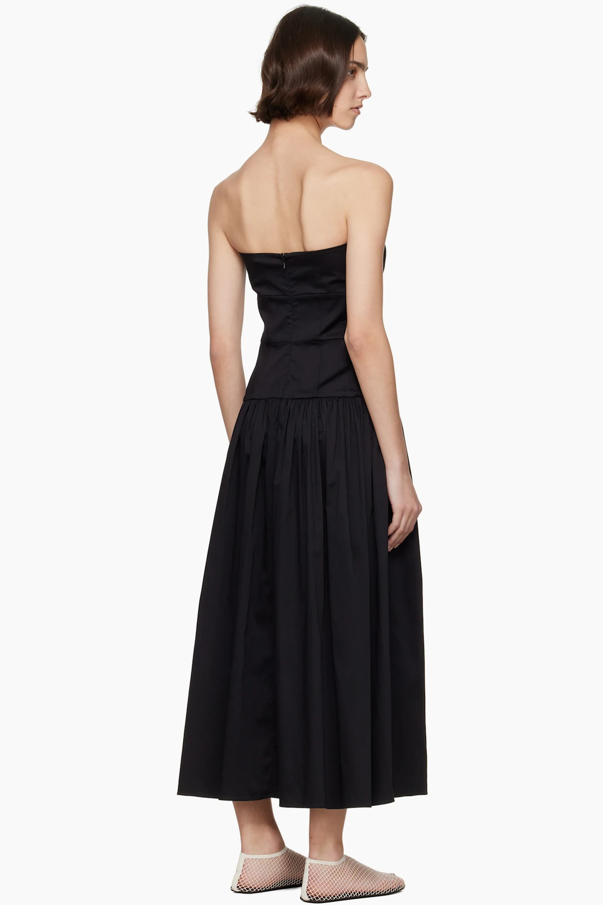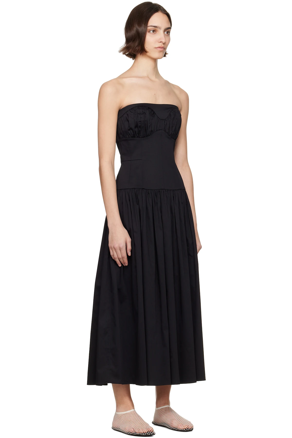 Stretch cotton poplin midi dress. Boning throughout.