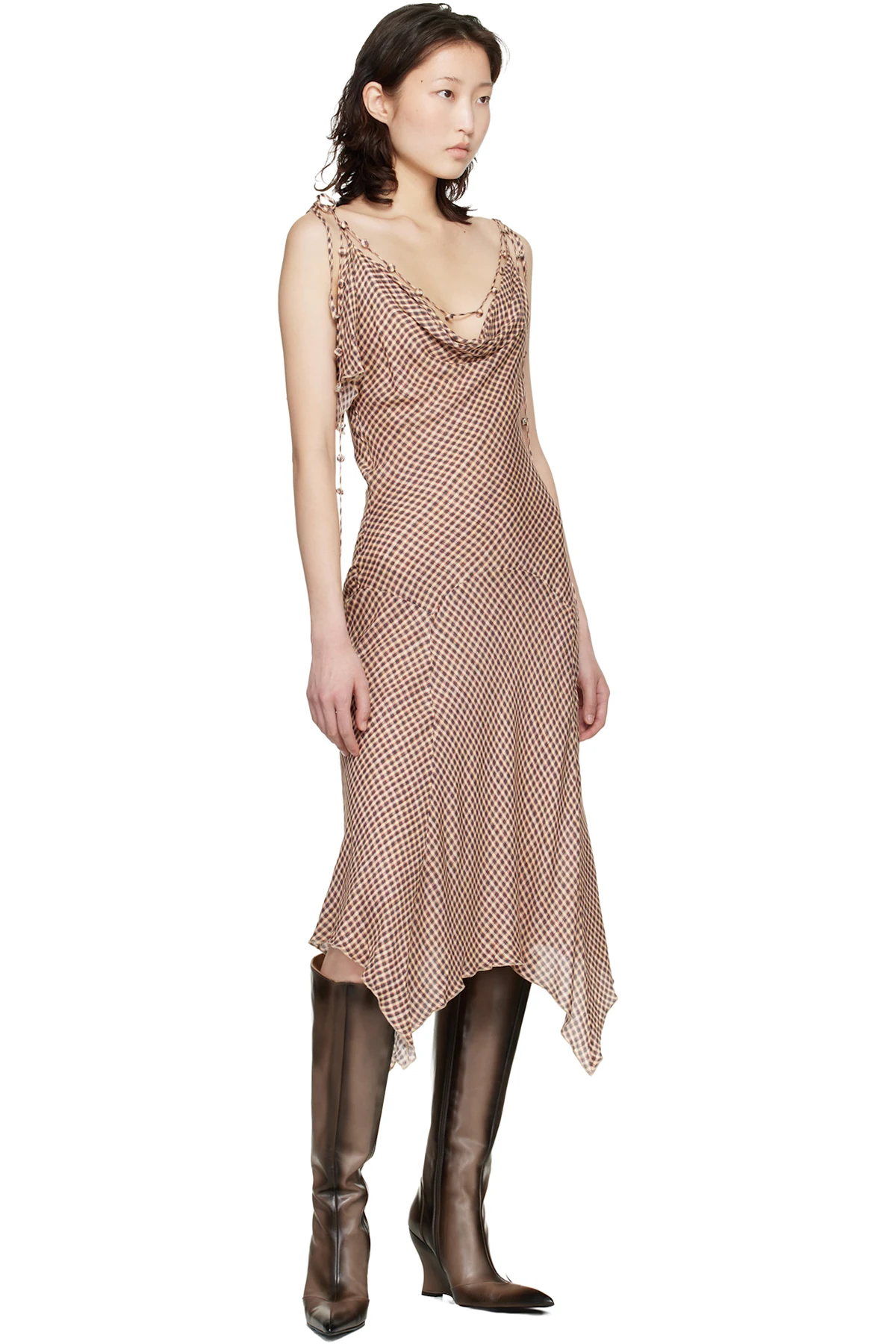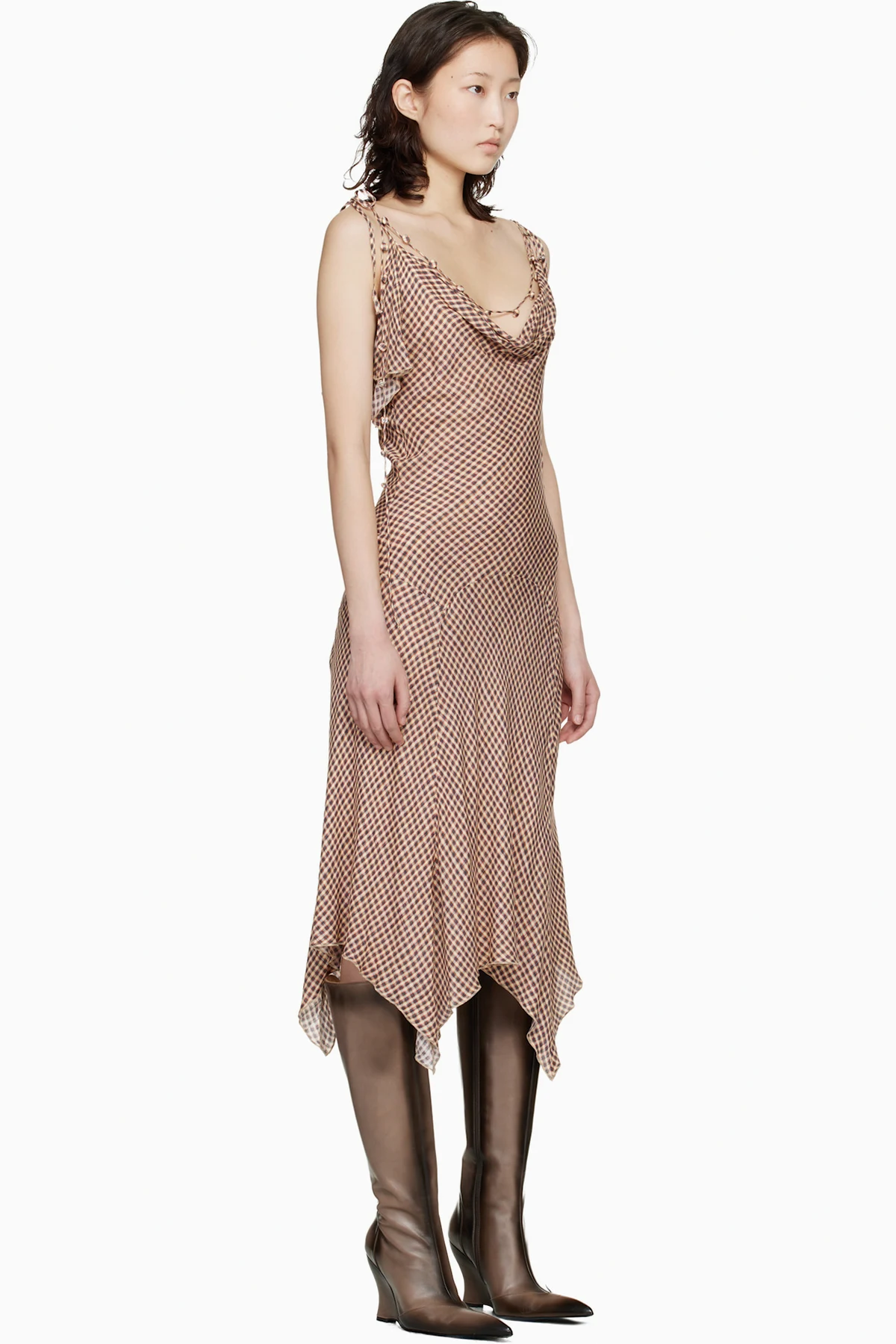 Brown Crinkled Check Maxi Dress