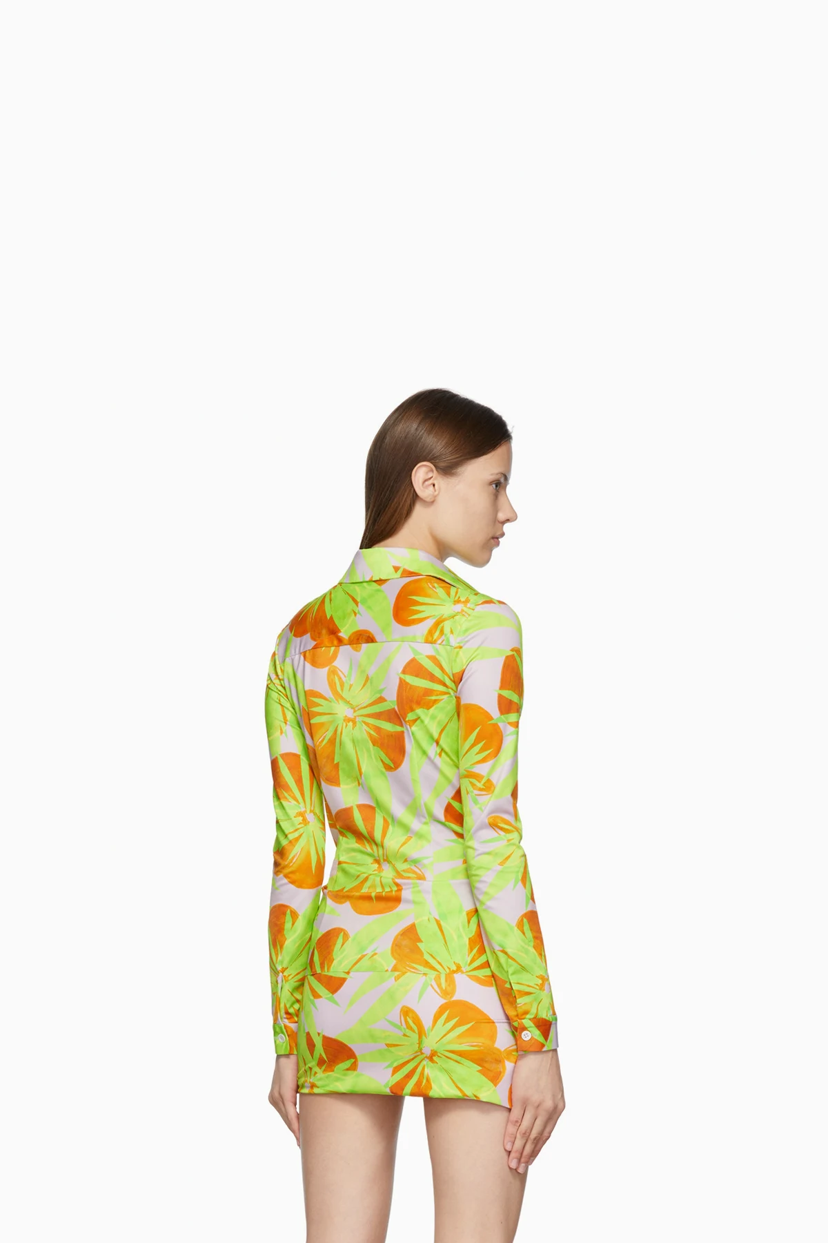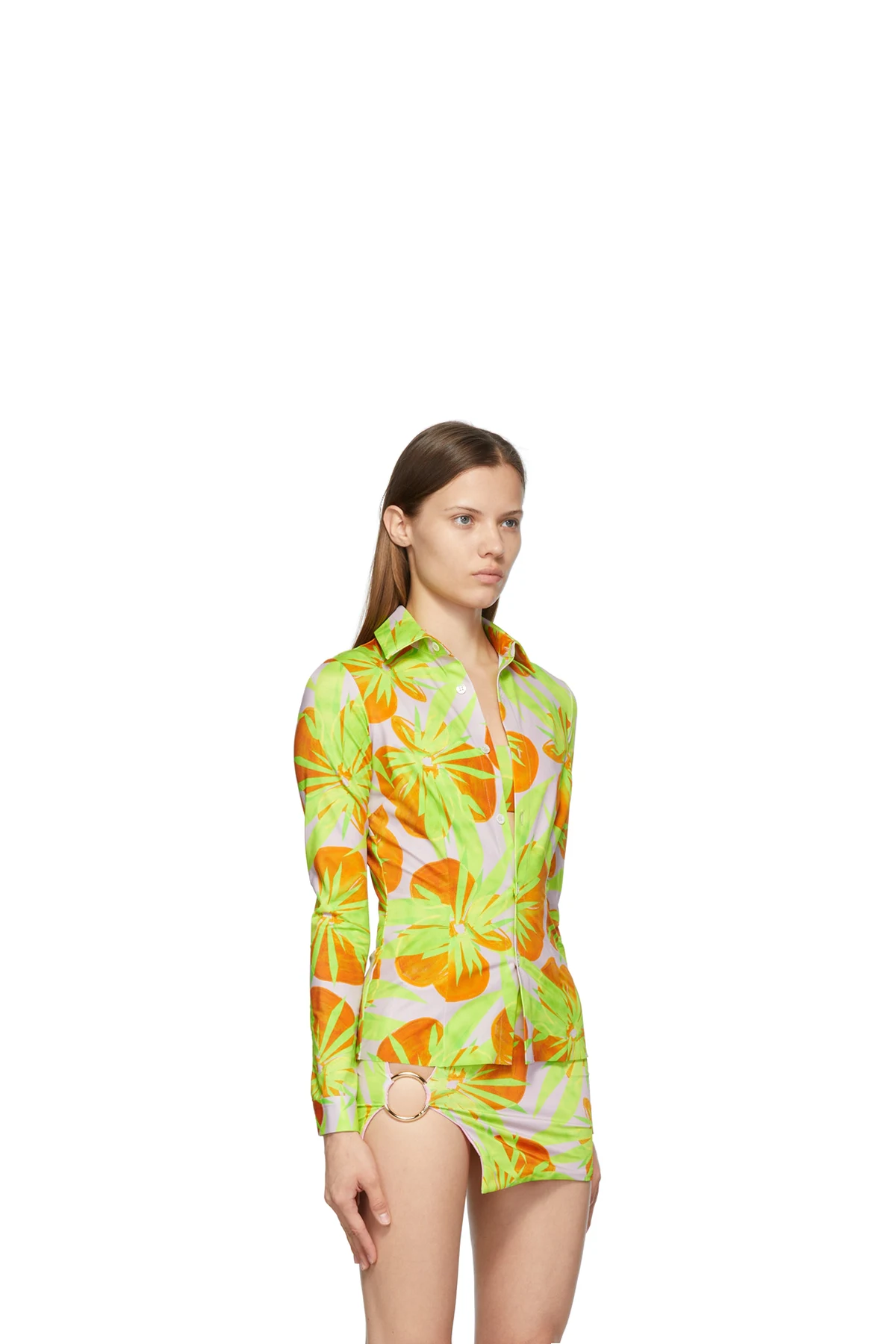 Long sleeve stretch nylon jersey shirt in pink featuring floral pattern printed in tones of green and orange. Spread collar. Button closure at front. Darts at chest, front, and back. Single-button barrel cuffs. White hardware.