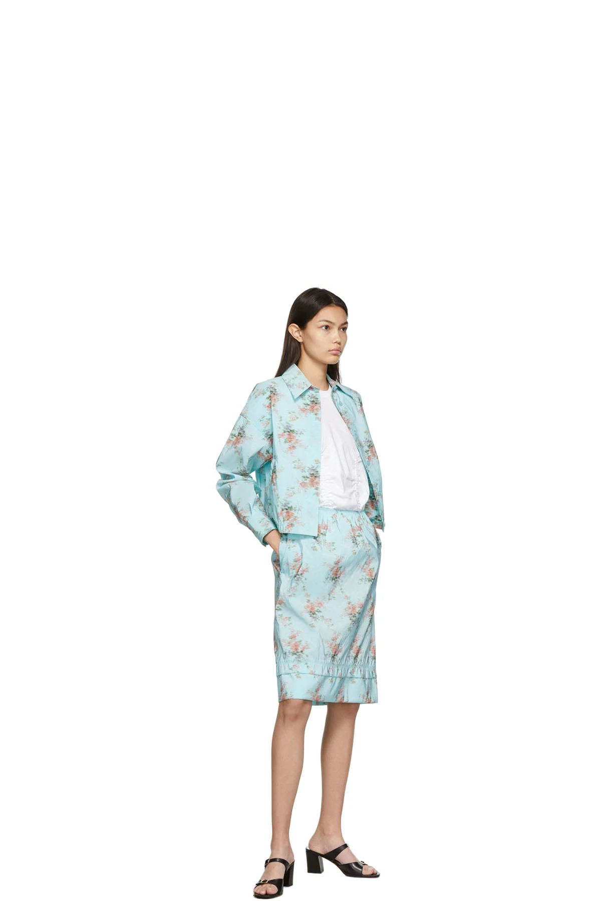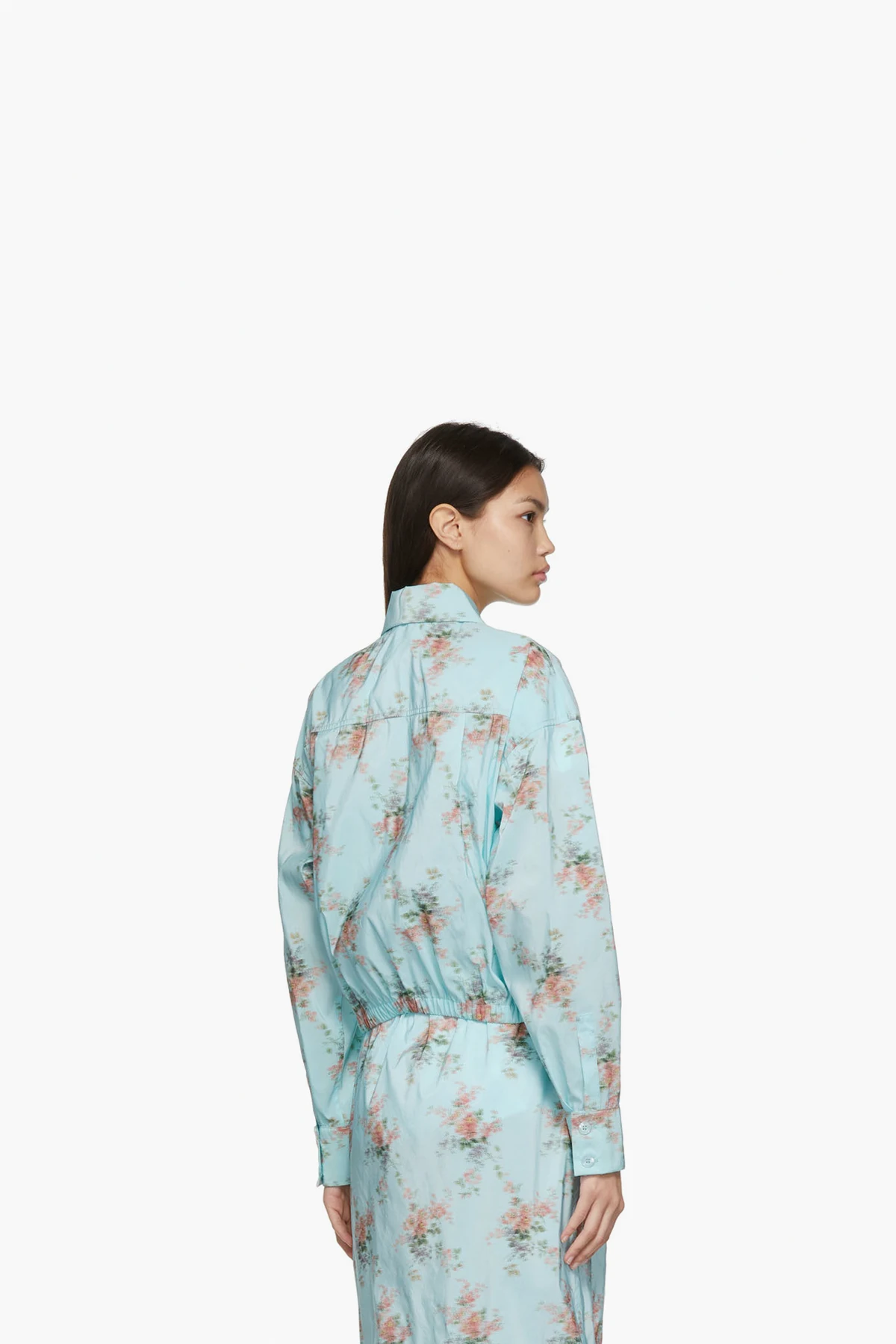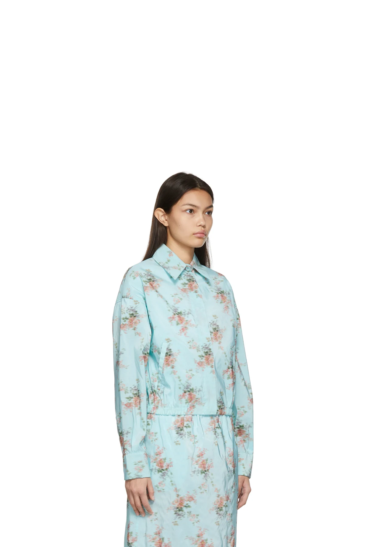 Long sleeve nylon-blend taffeta shirt in blue featuring floral pattern in multicolor.