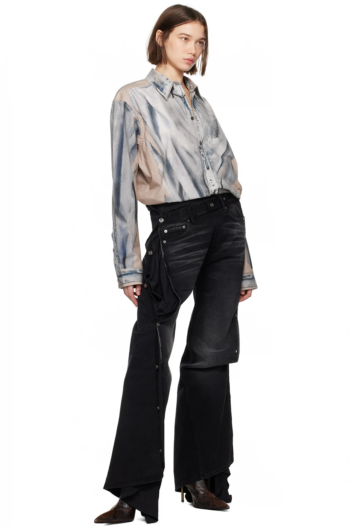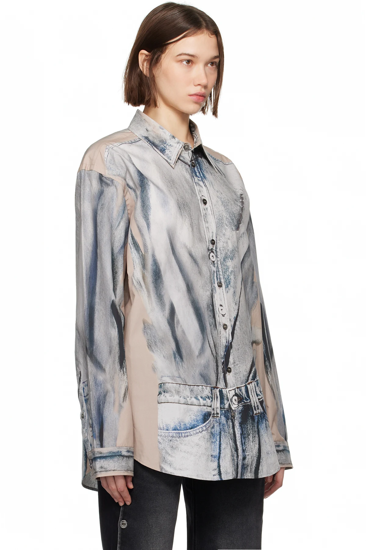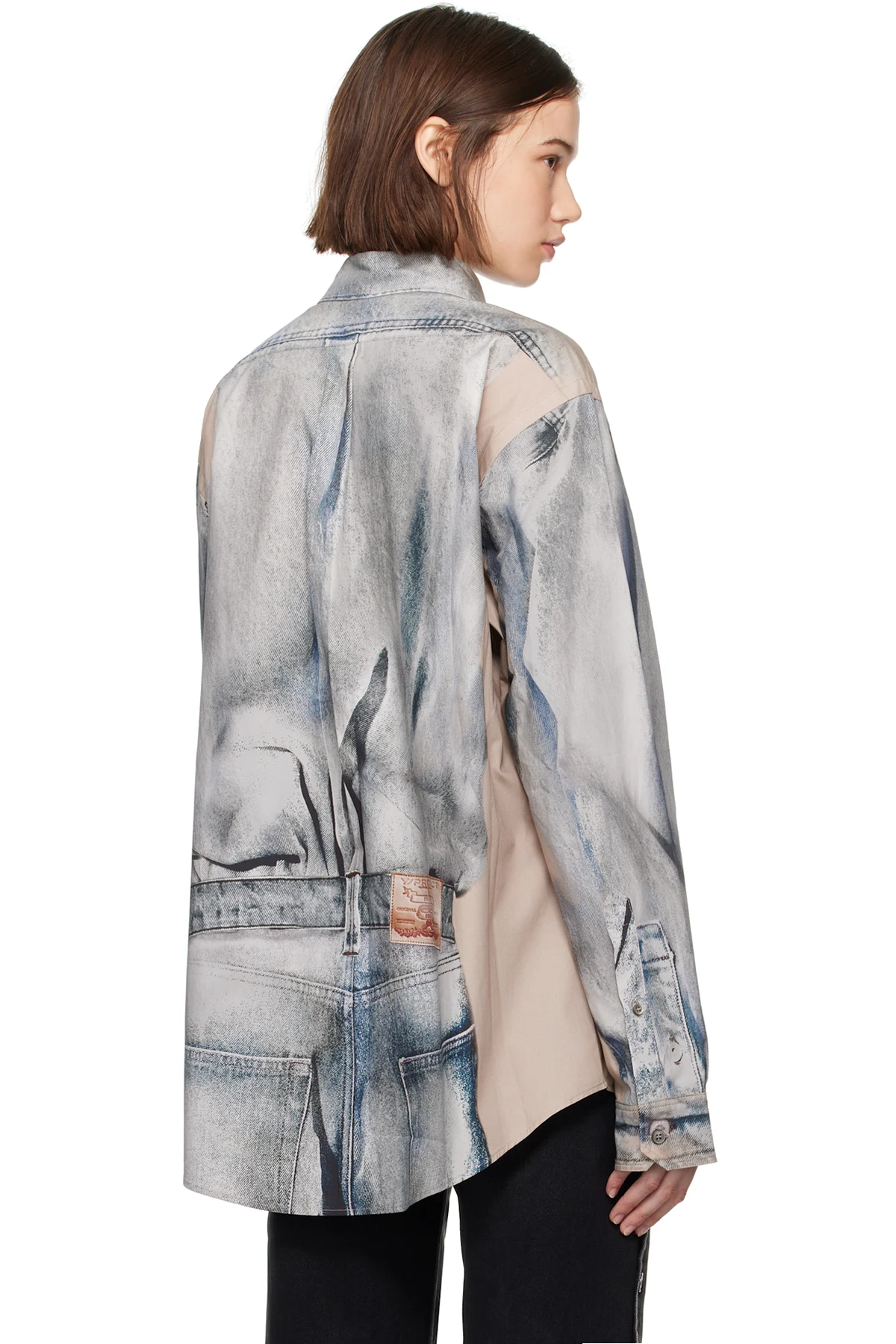 Cotton poplin shirt. Trompe l'oeil denim effect printed throughout.