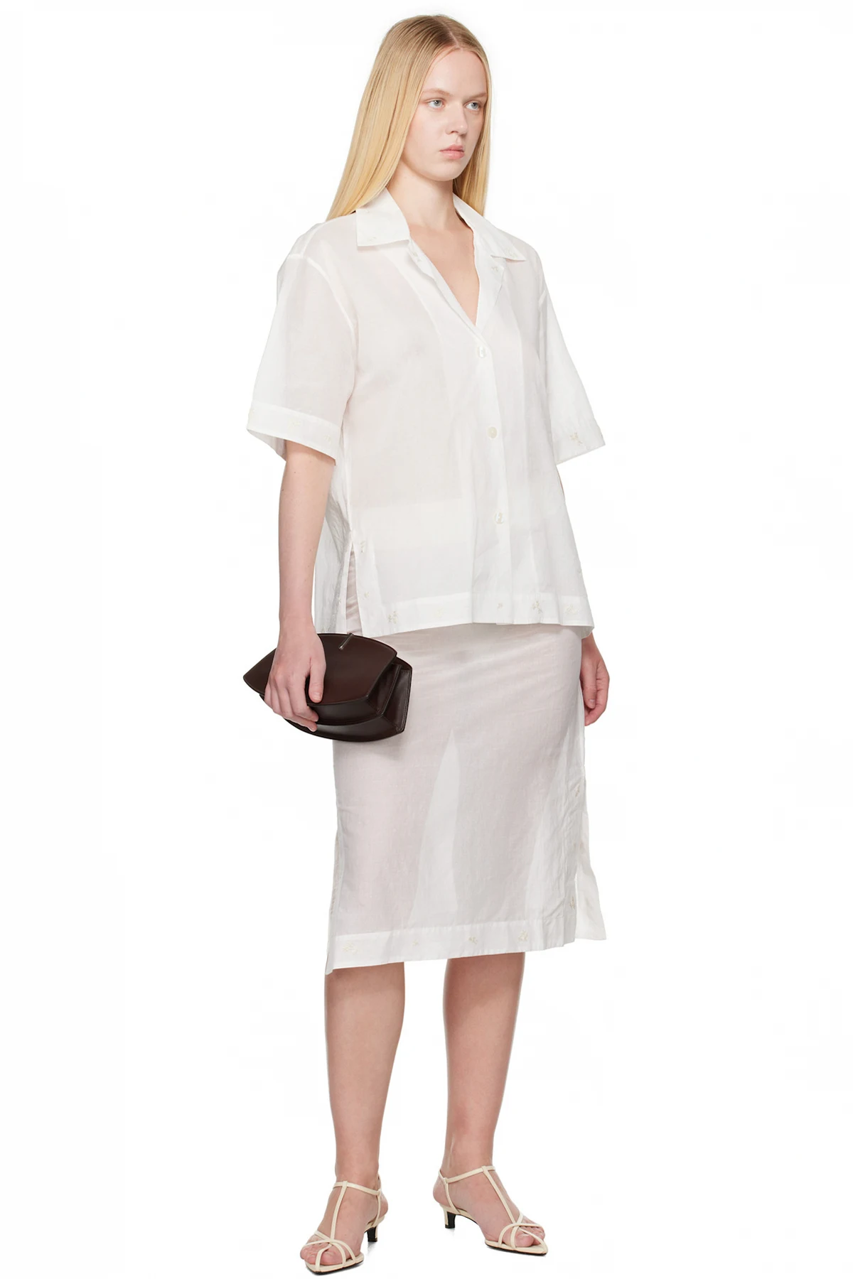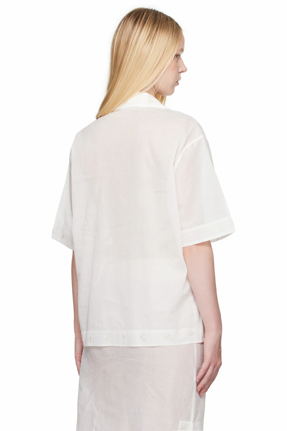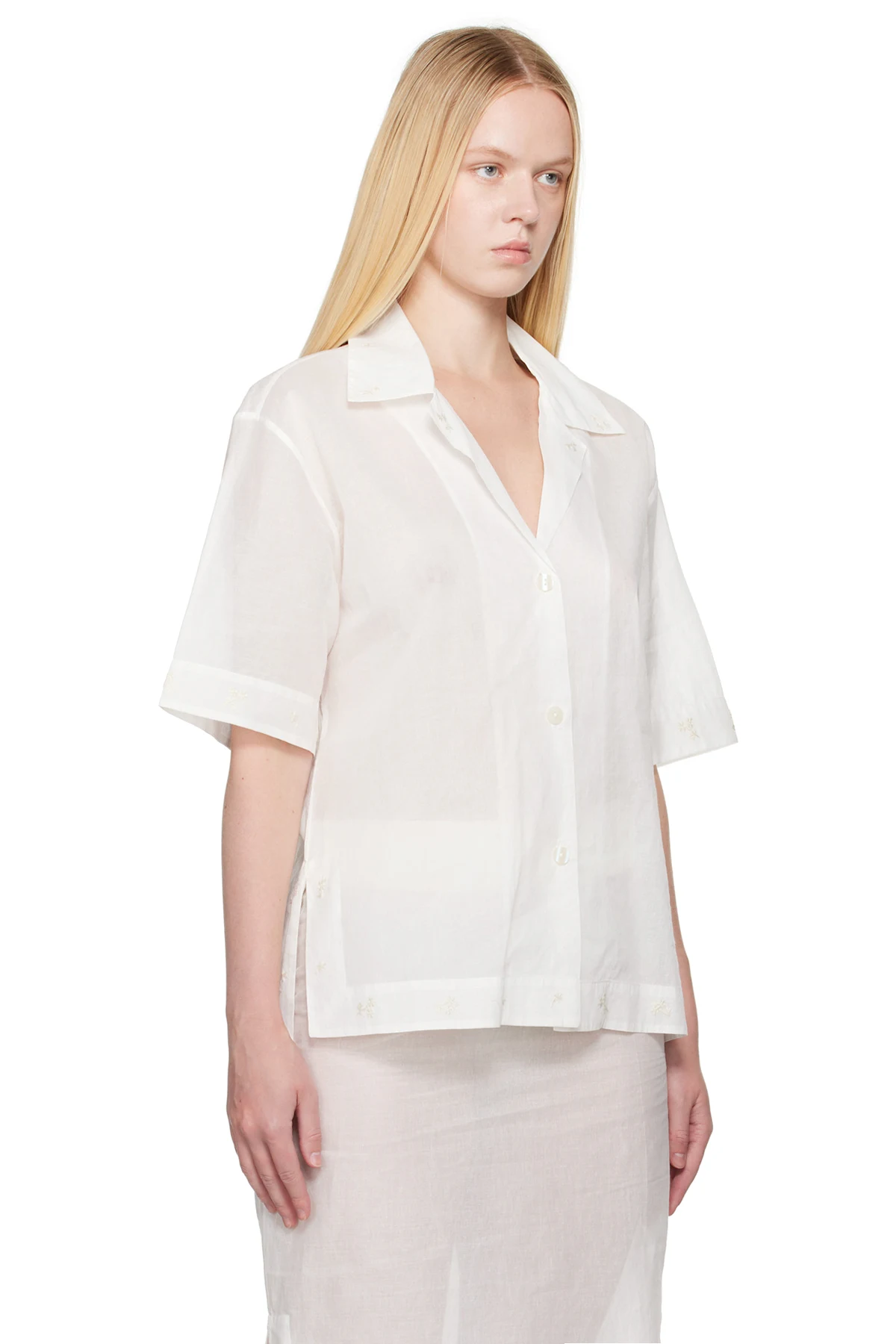 Semi-sheer cotton organza shirt. Embroidered floral pattern at collar, hem, and cuffs.