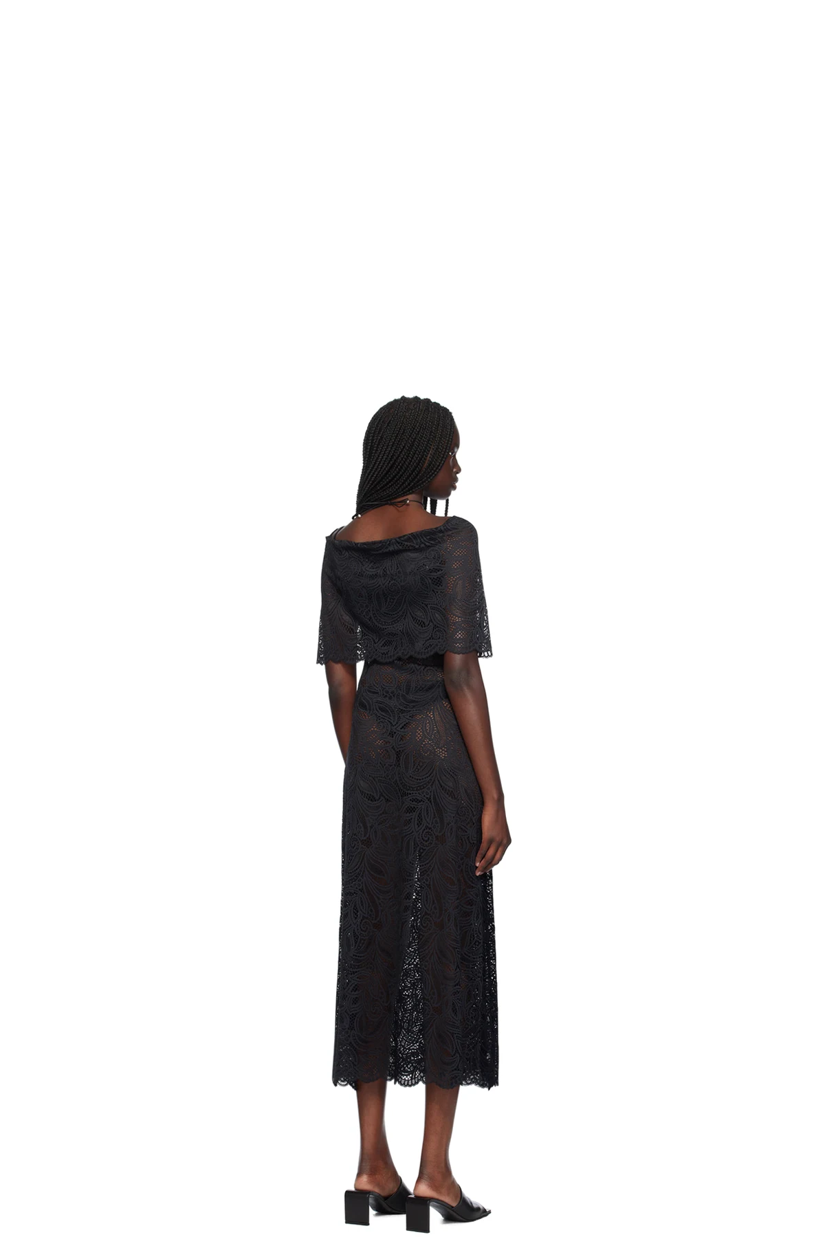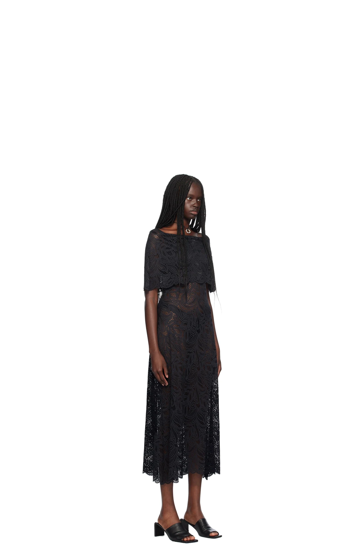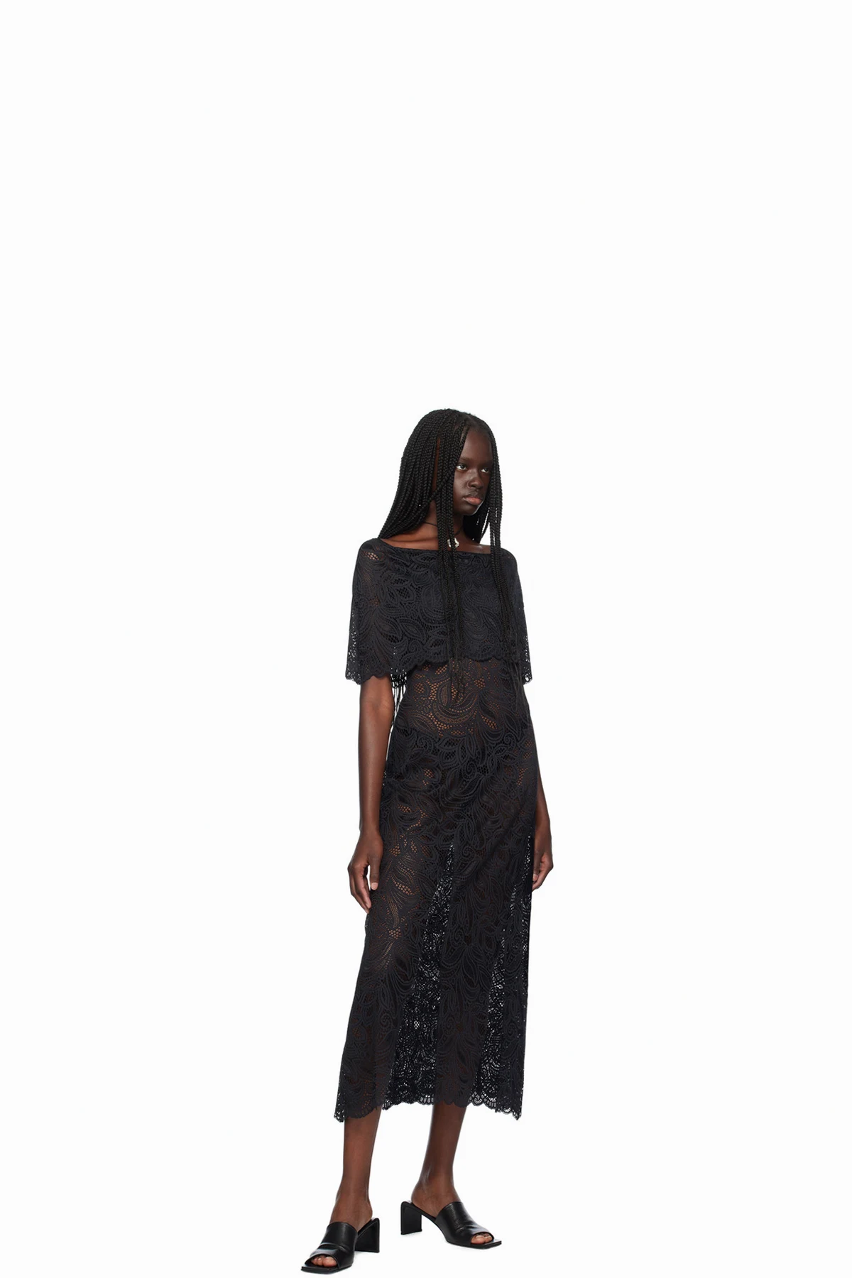A-line lightweight and sheer stretch nylon-blend lace dress. Floral pattern and scalloped edges throughout.