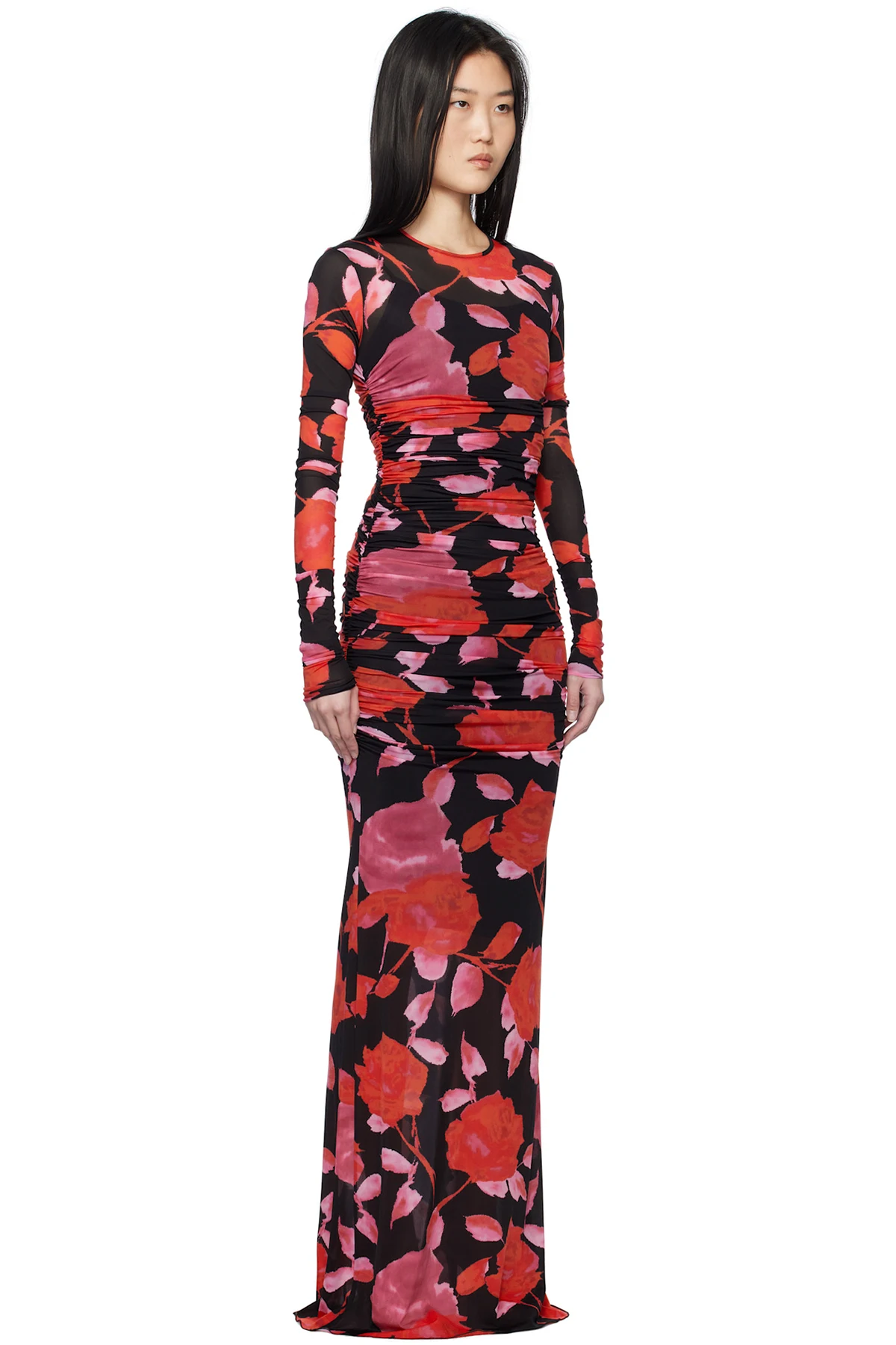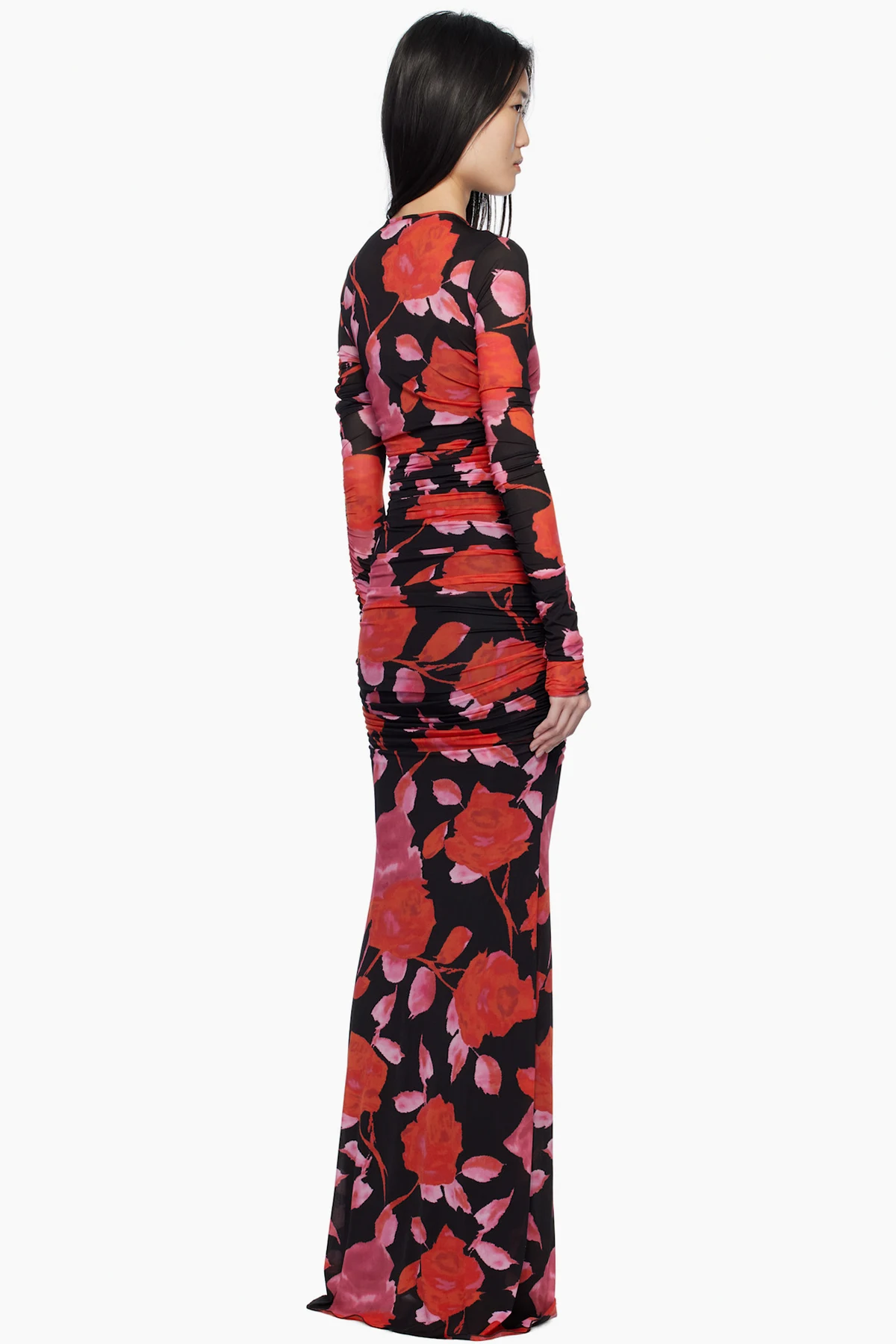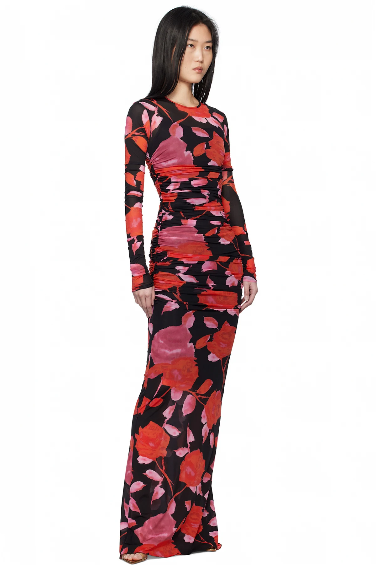 Stretch nylon jersey maxi dress. Ruching and floral pattern printed throughout.