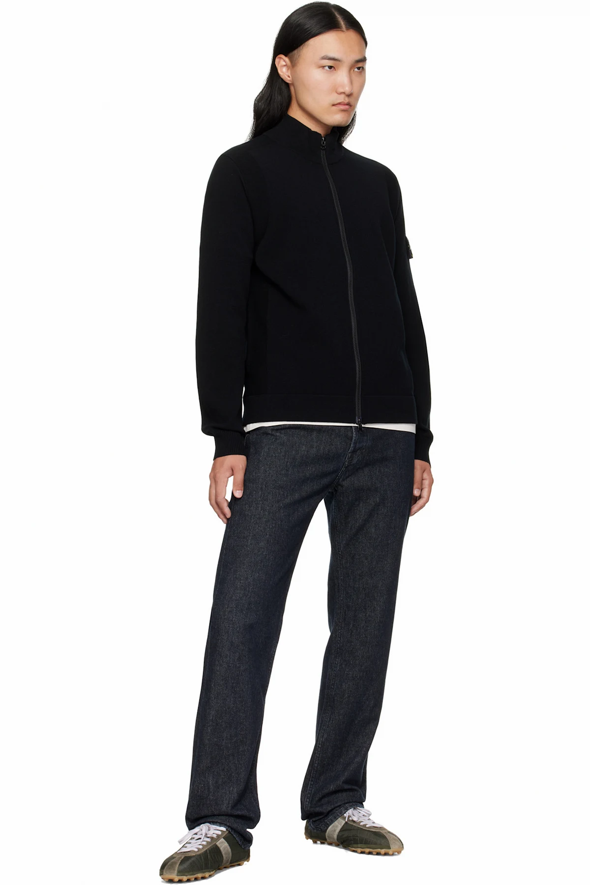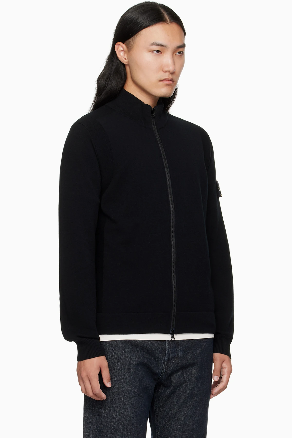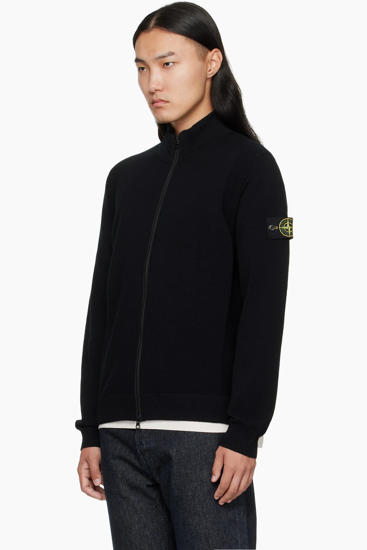 · Rib-knit stand collar, hem, and cuffs