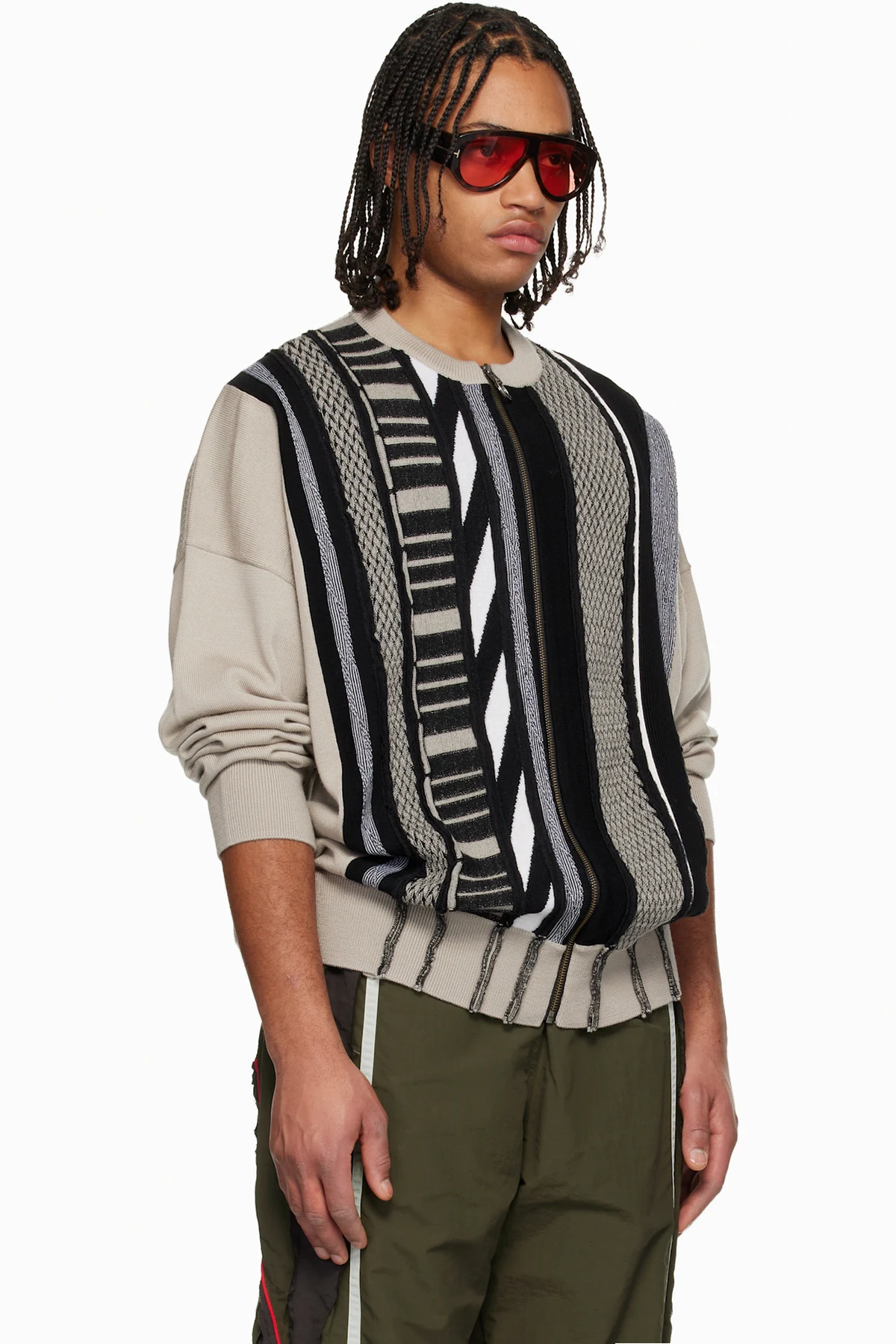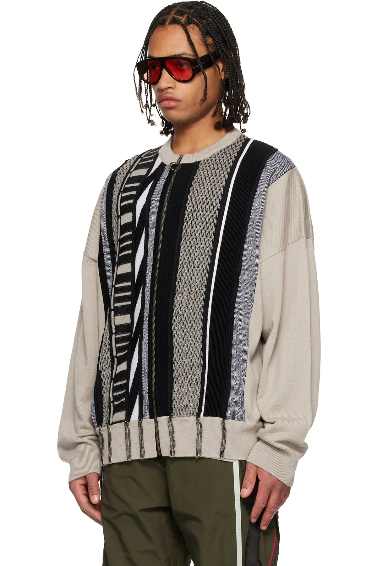 Beige & Black Multi Stripe Zip Up Crew Sweater