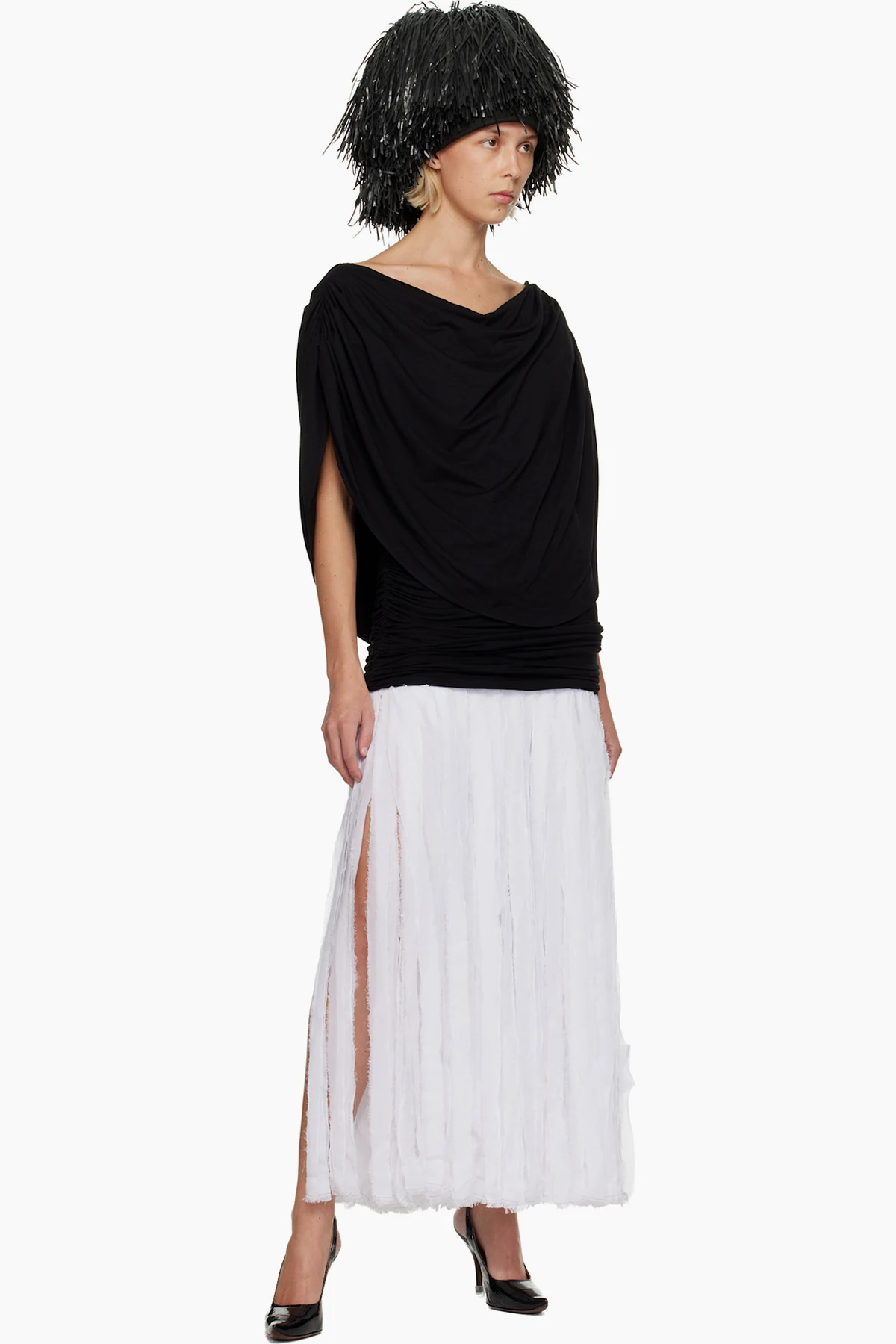 · Raw edges at layered fringed chiffon skirt