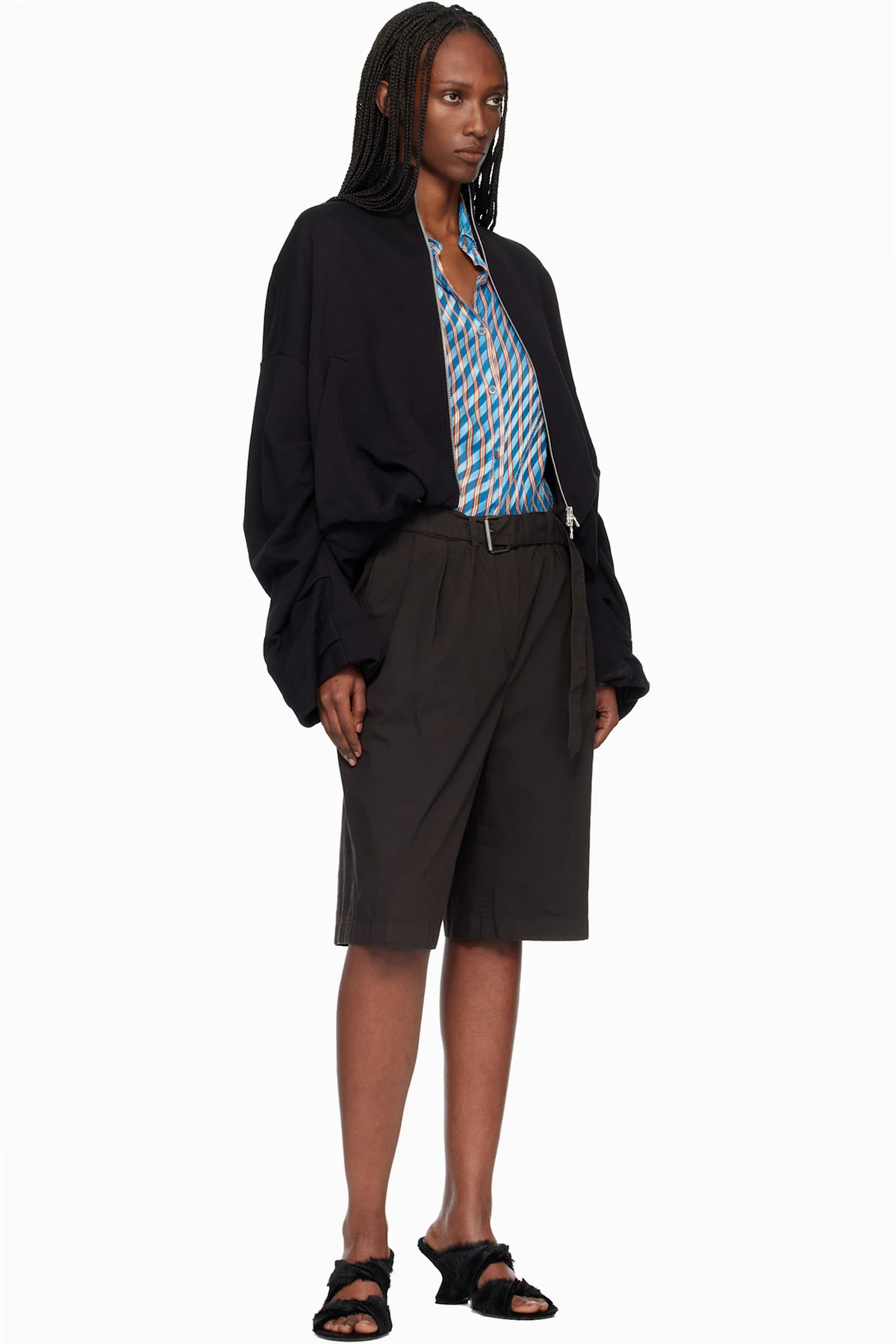 · Pleats at sleeves and back hem