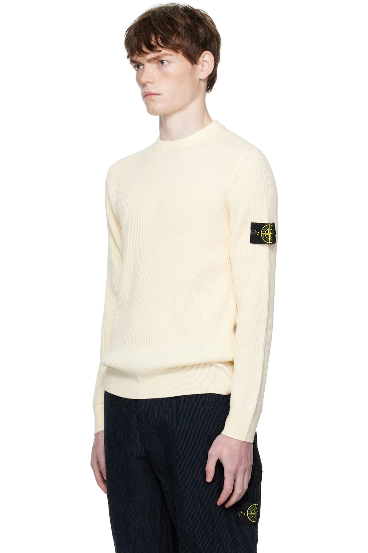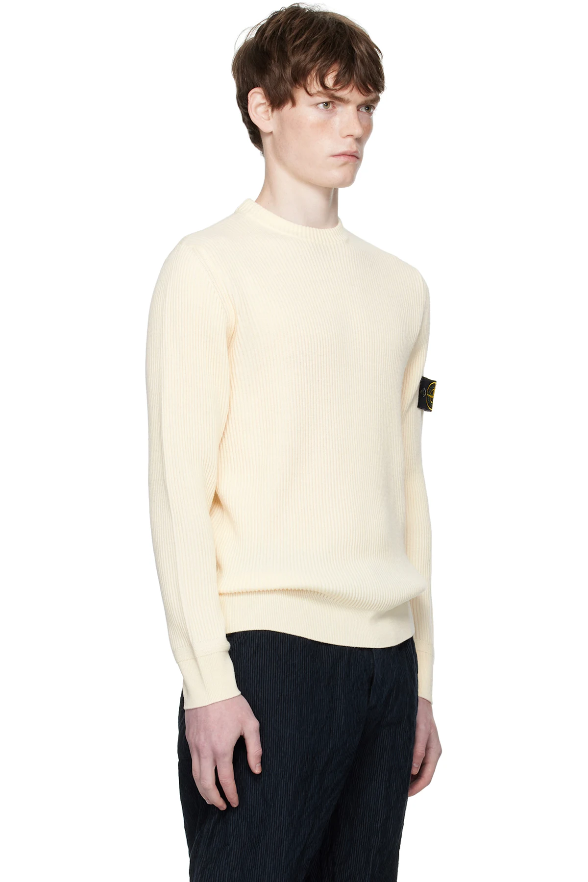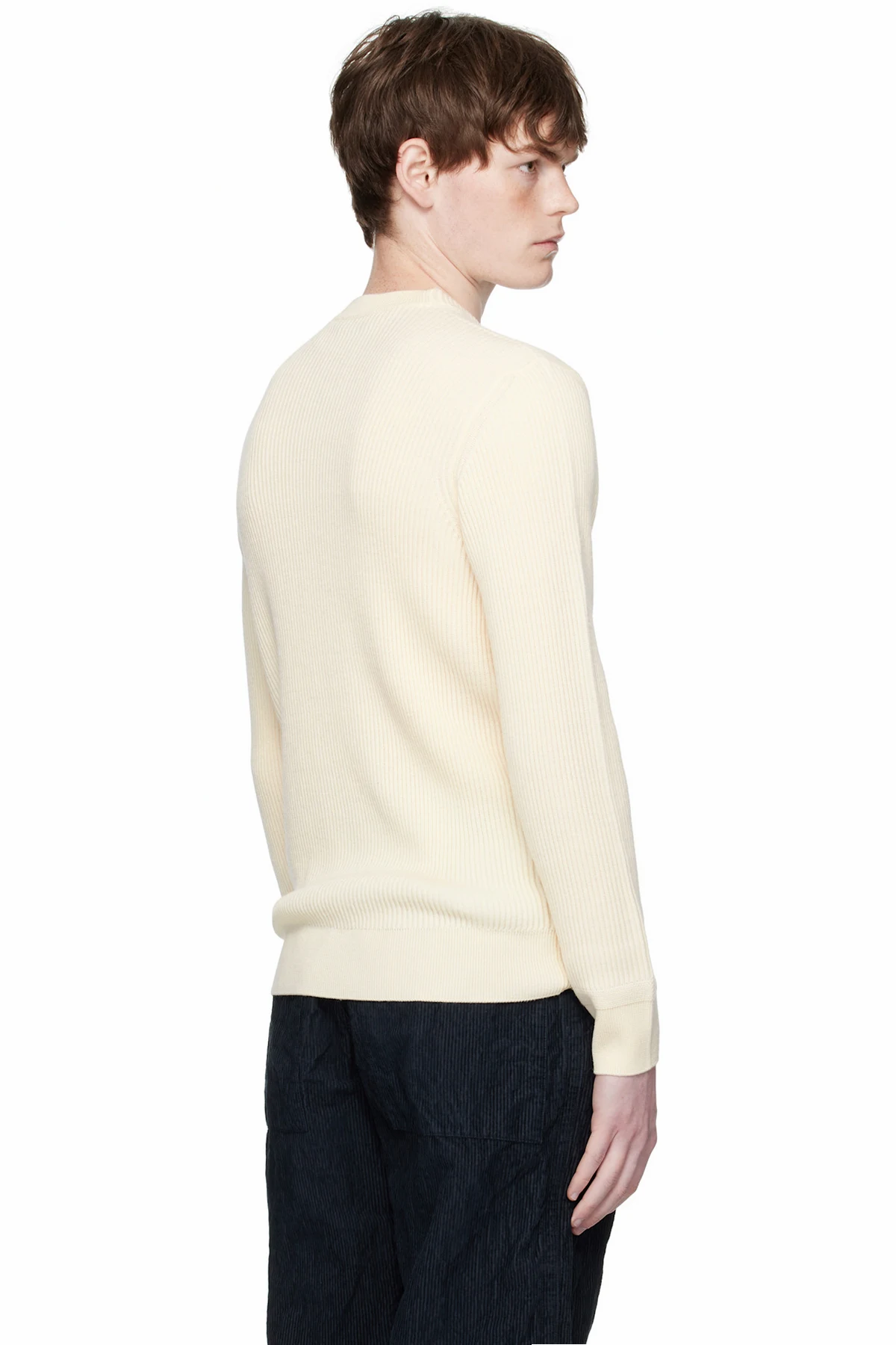 12-gauge rib-knit virgin wool sweater.