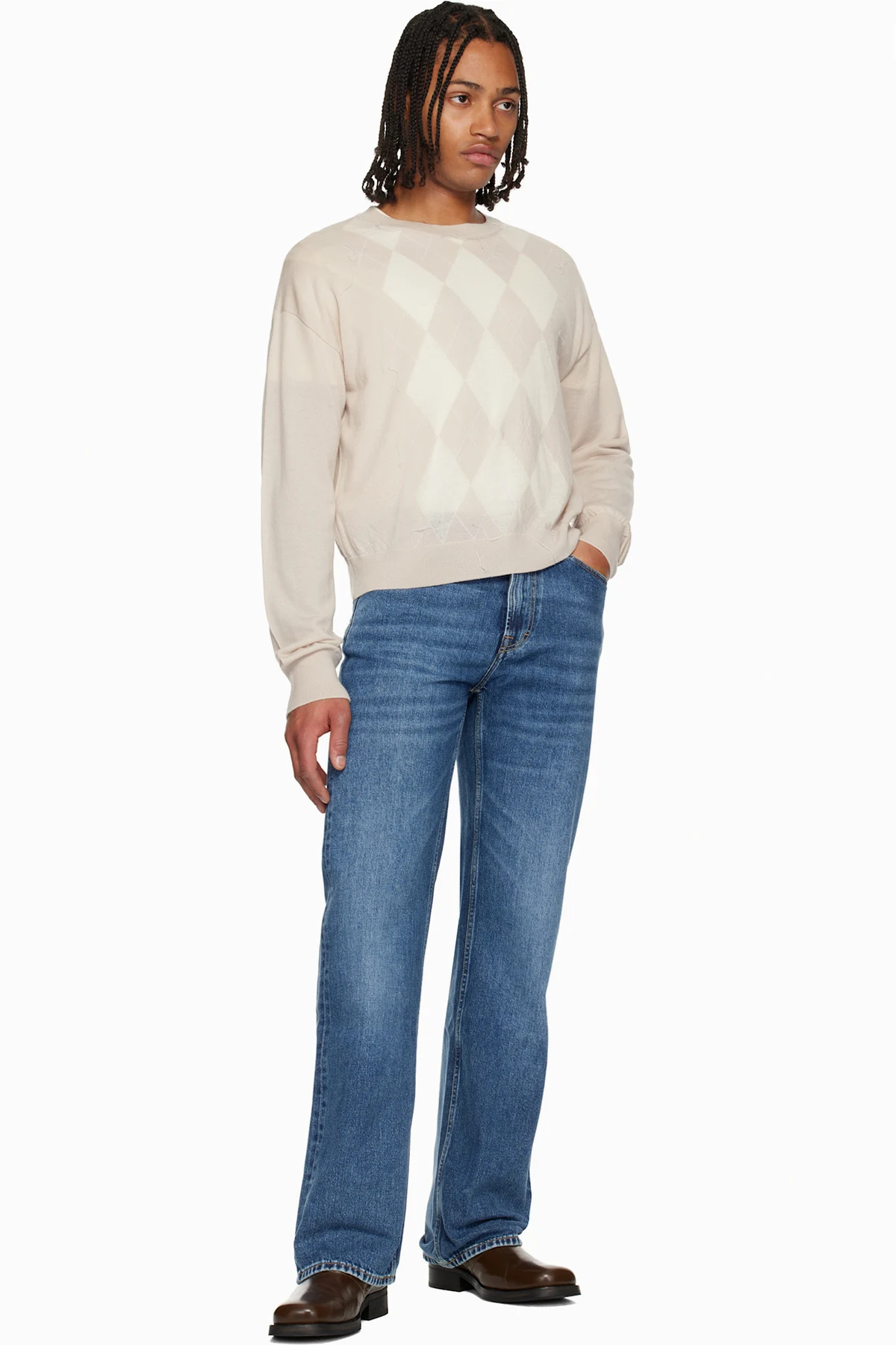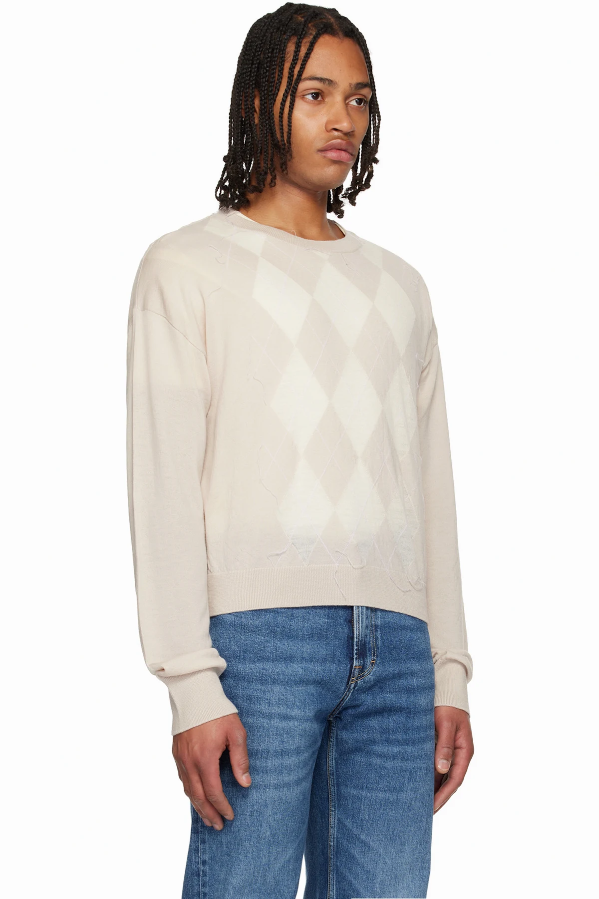 · Jacquard argyle pattern and loose thread detailing at front