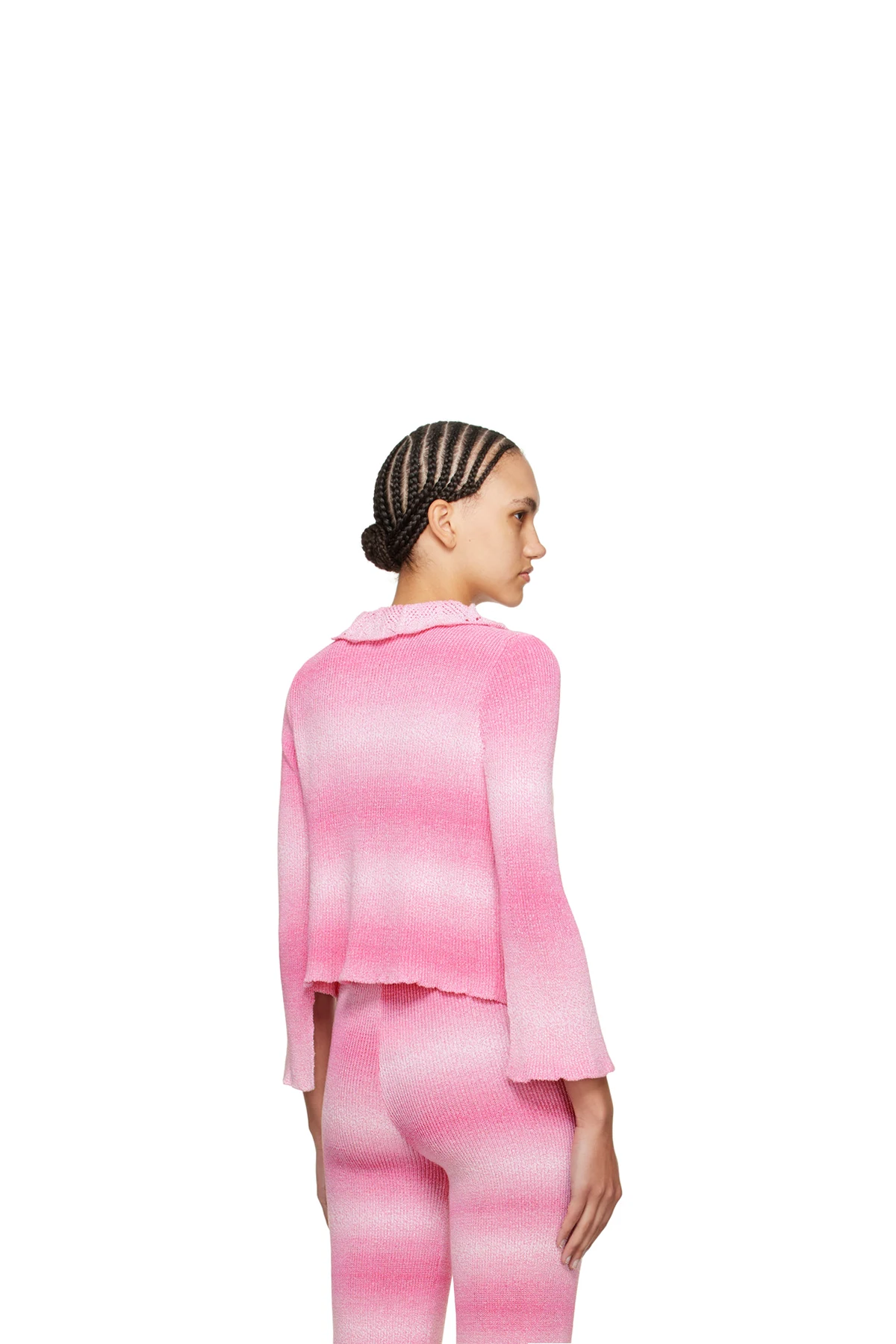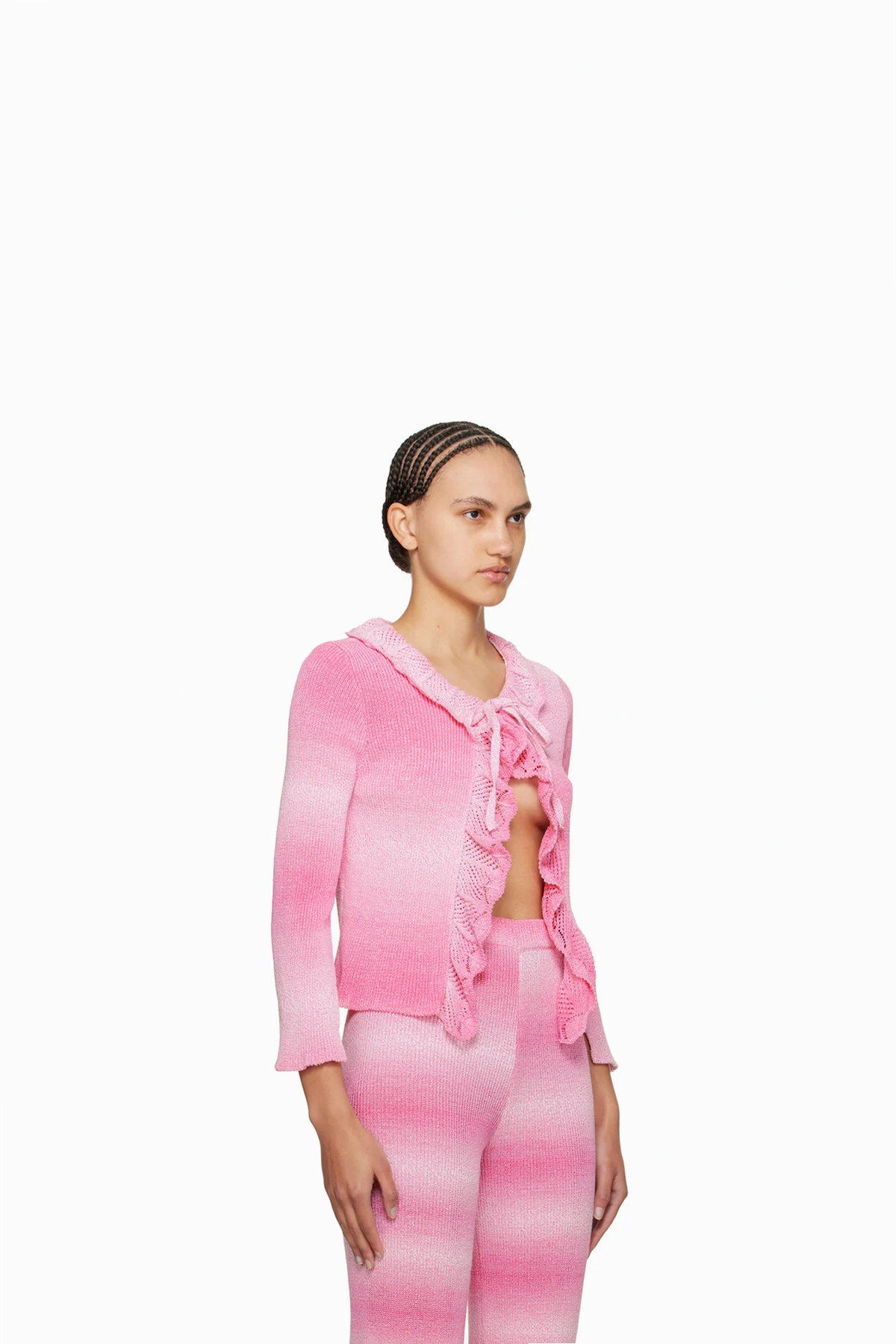 Knit cotton-blend cardigan. Gradient stripes and lettuce edges throughout.