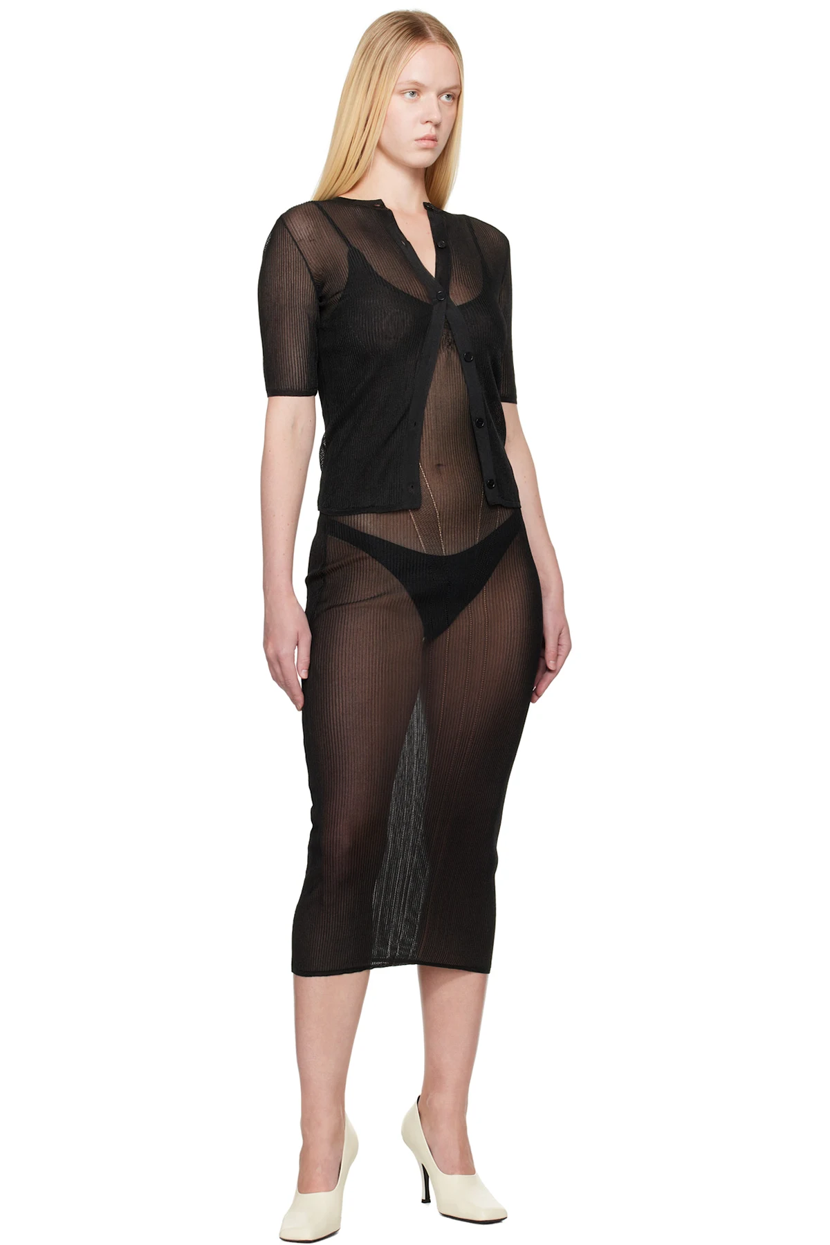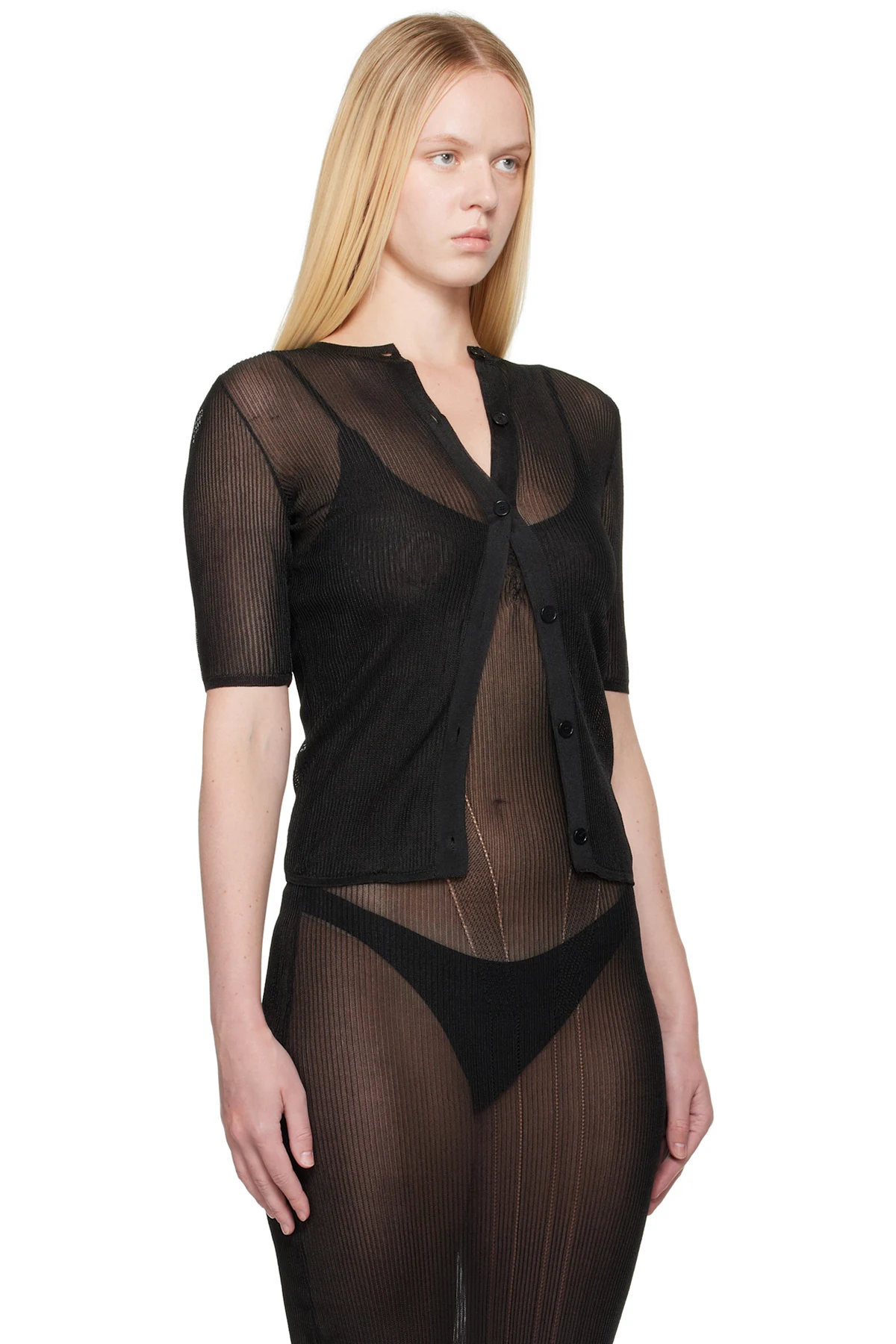Semi-sheer rib-knit nylon-blend cardigan.