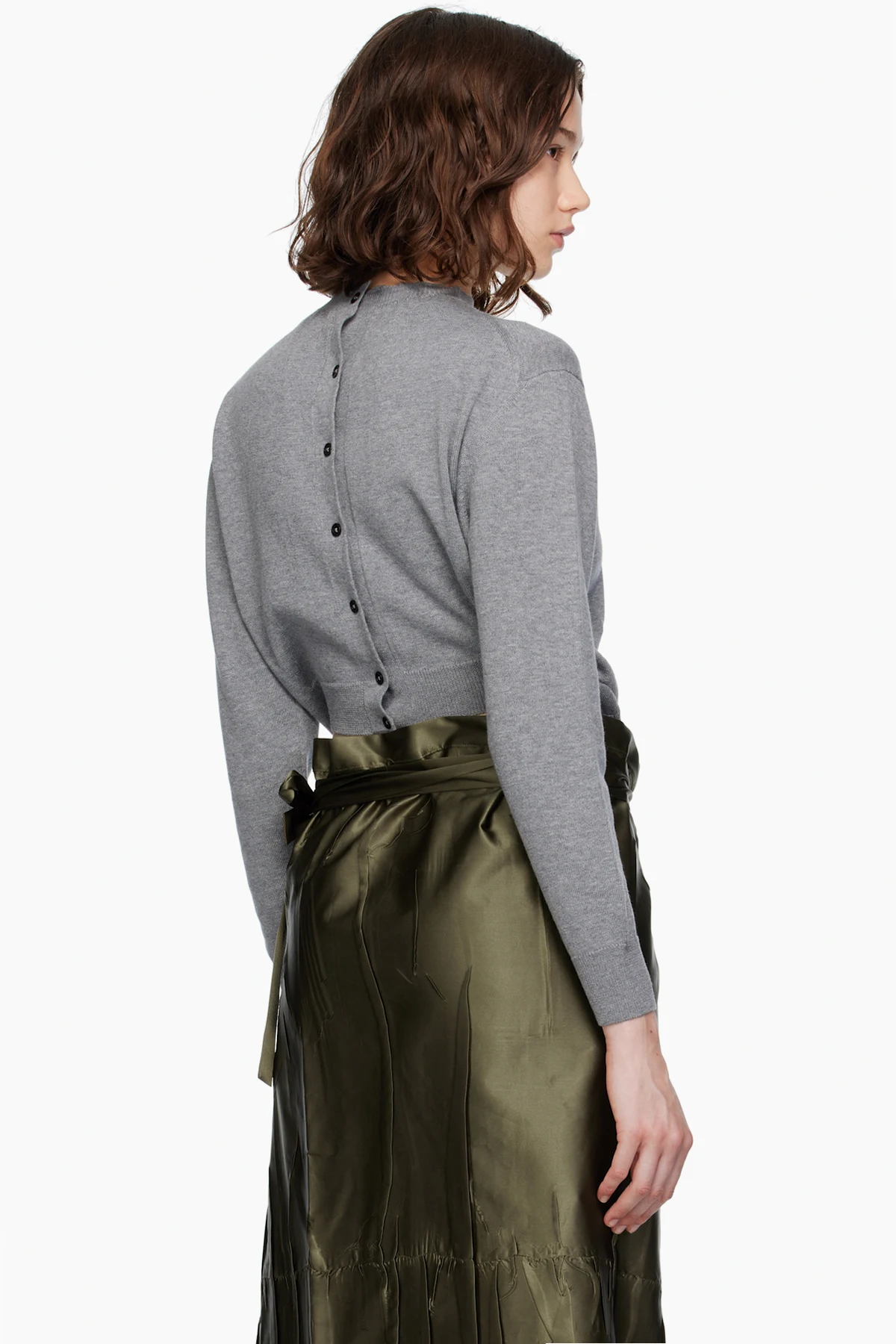 · Button closure and cutout at back