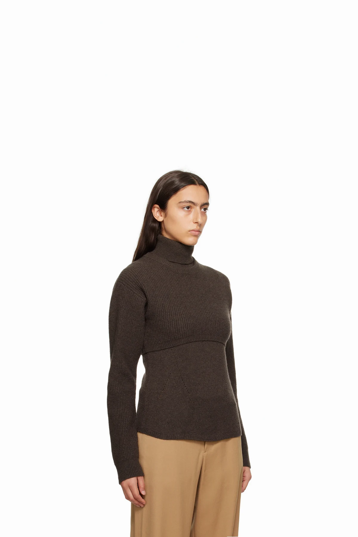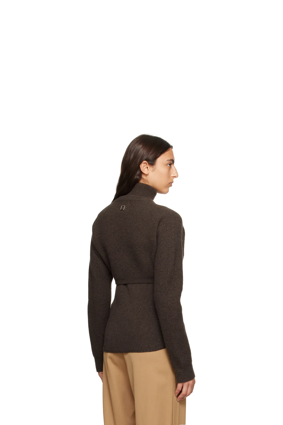 Knit wool- and nylon-blend turtleneck. Detachable rib knit crewneck overlay for alternate styling.