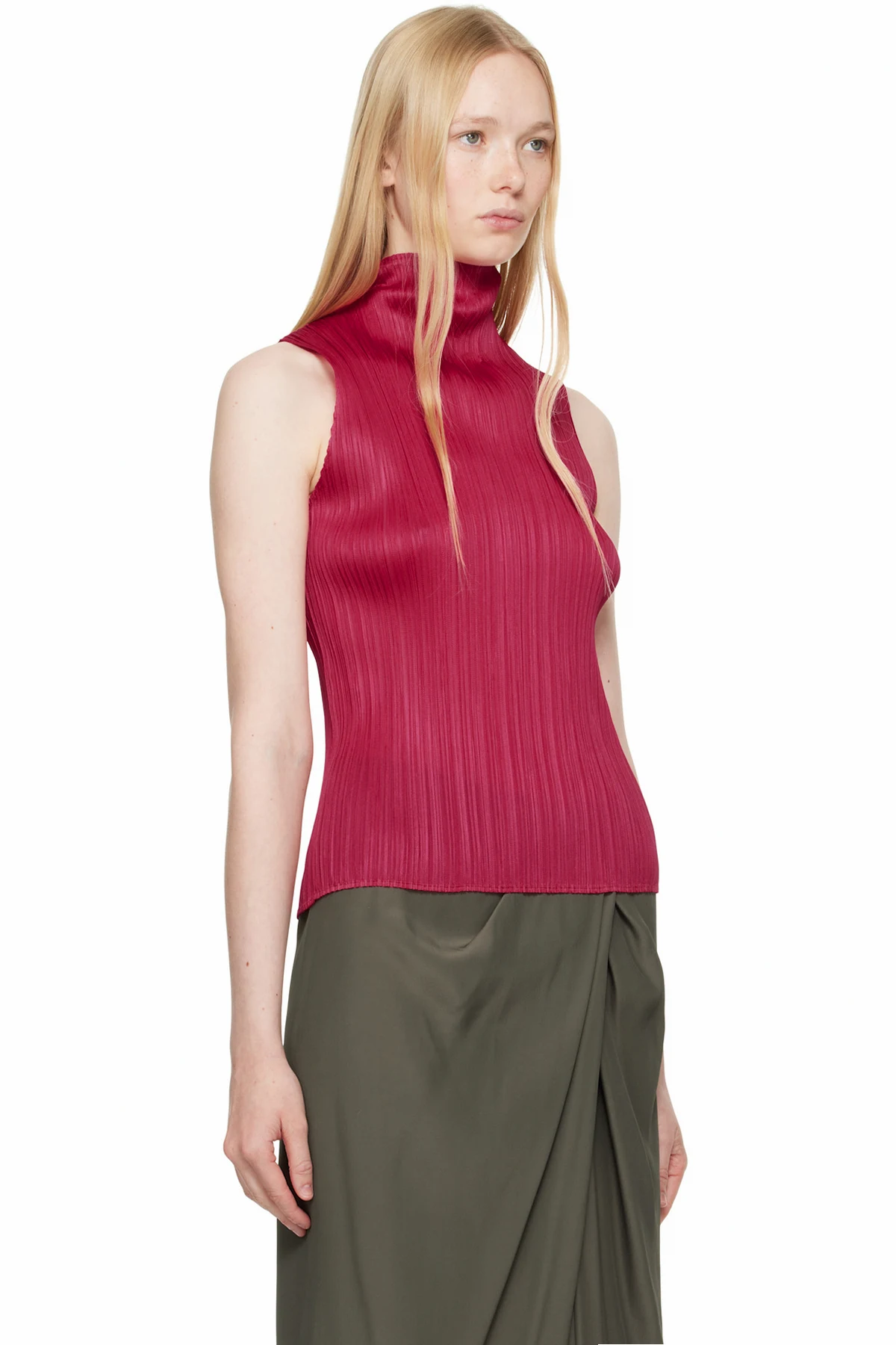 Garment-pleated polyester tricot top. Mock neck.