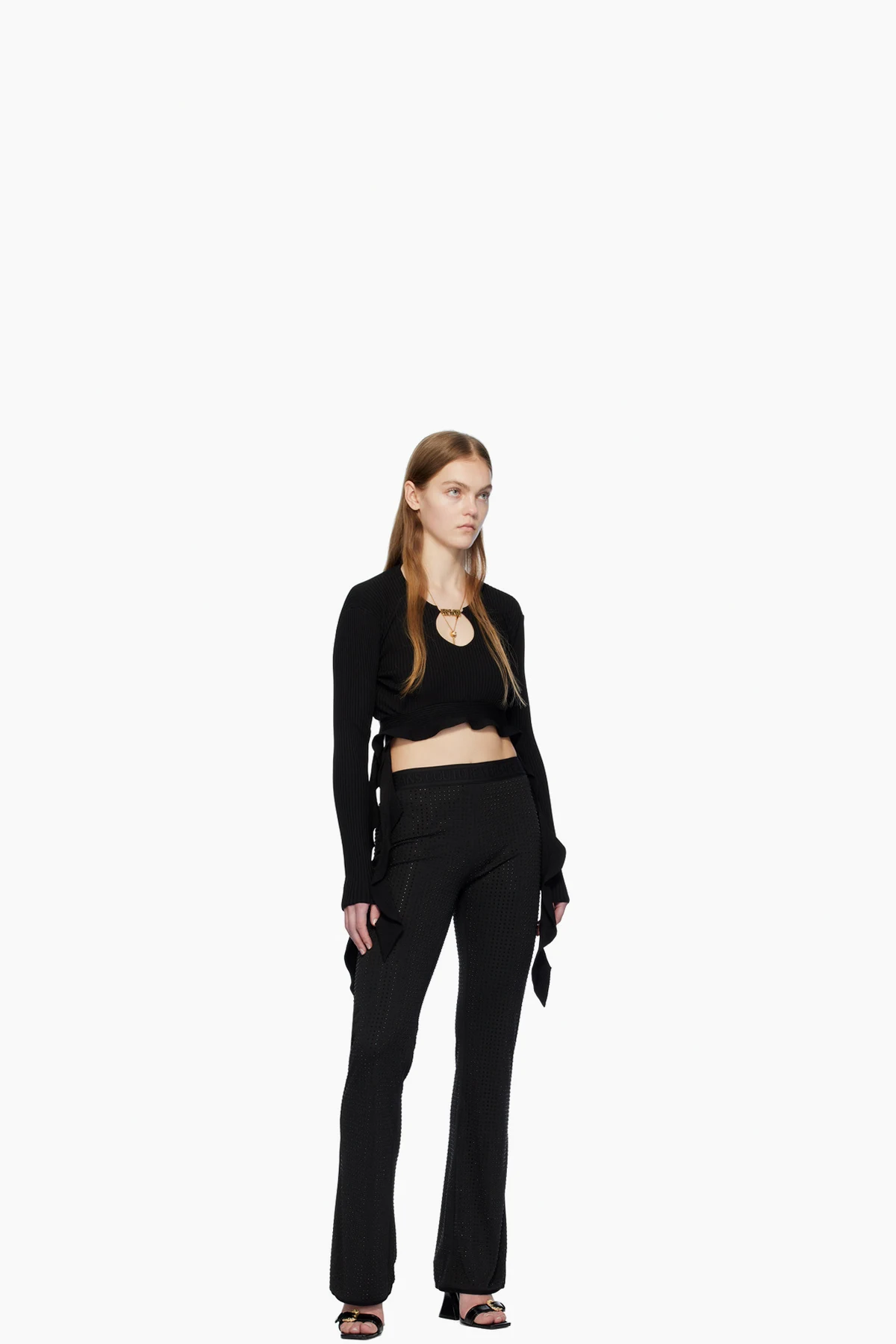 · Ruffled panels at curved cropped hem