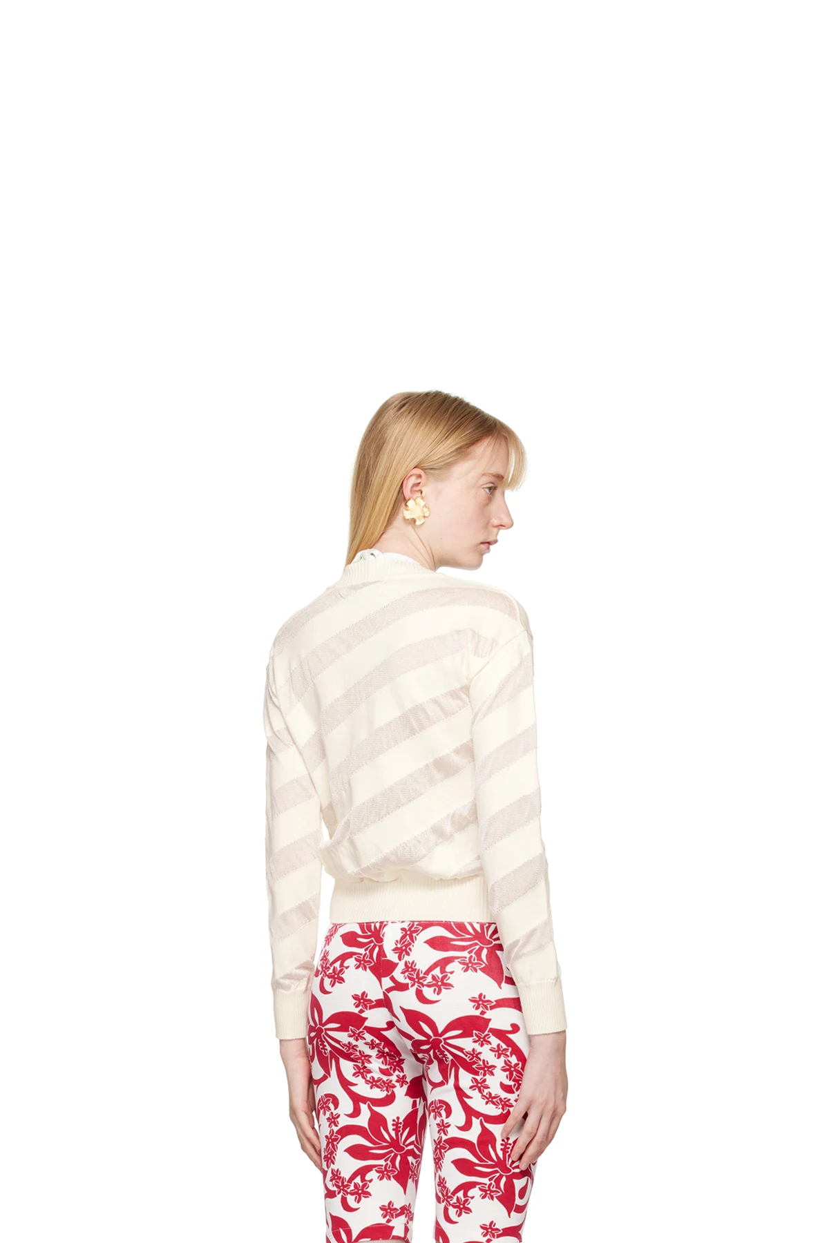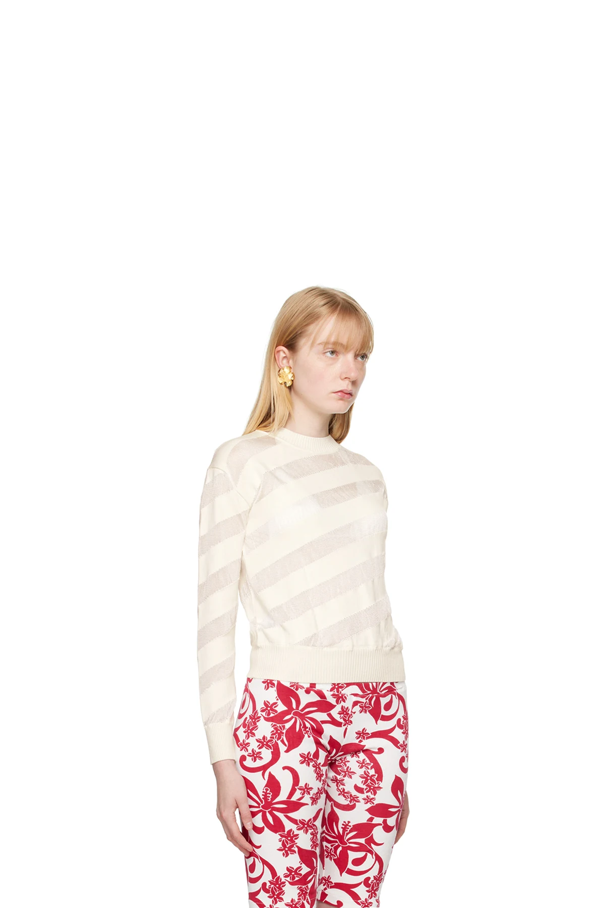 Semi-sheer knit viscose and viscose organza sweater. Stripes throughout.