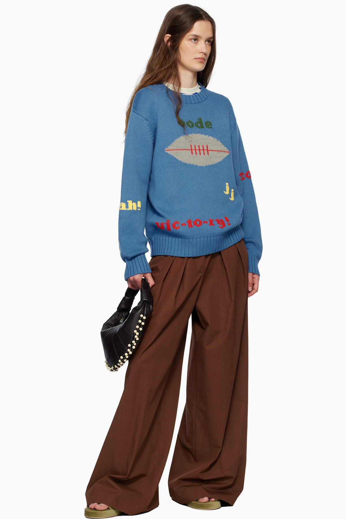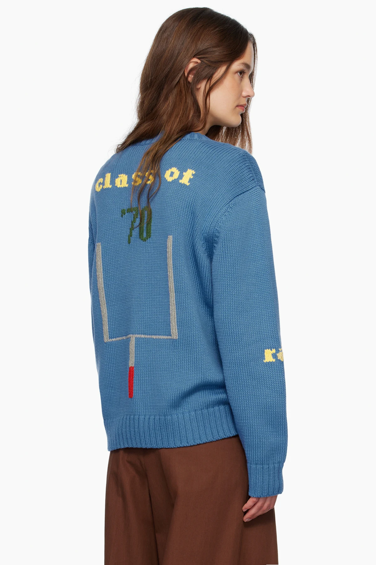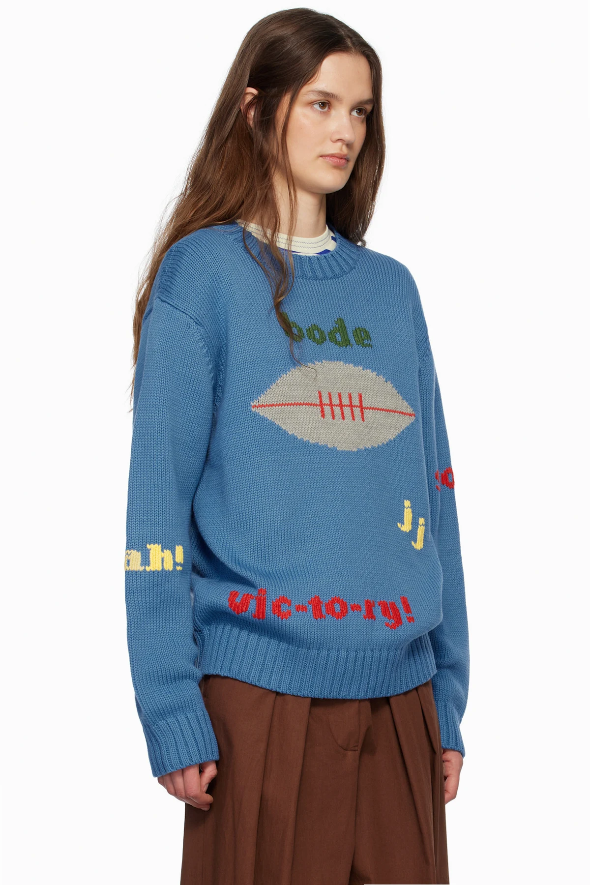 Knit cotton- and merino wool-blend sweater. Jacquard text throughout.
