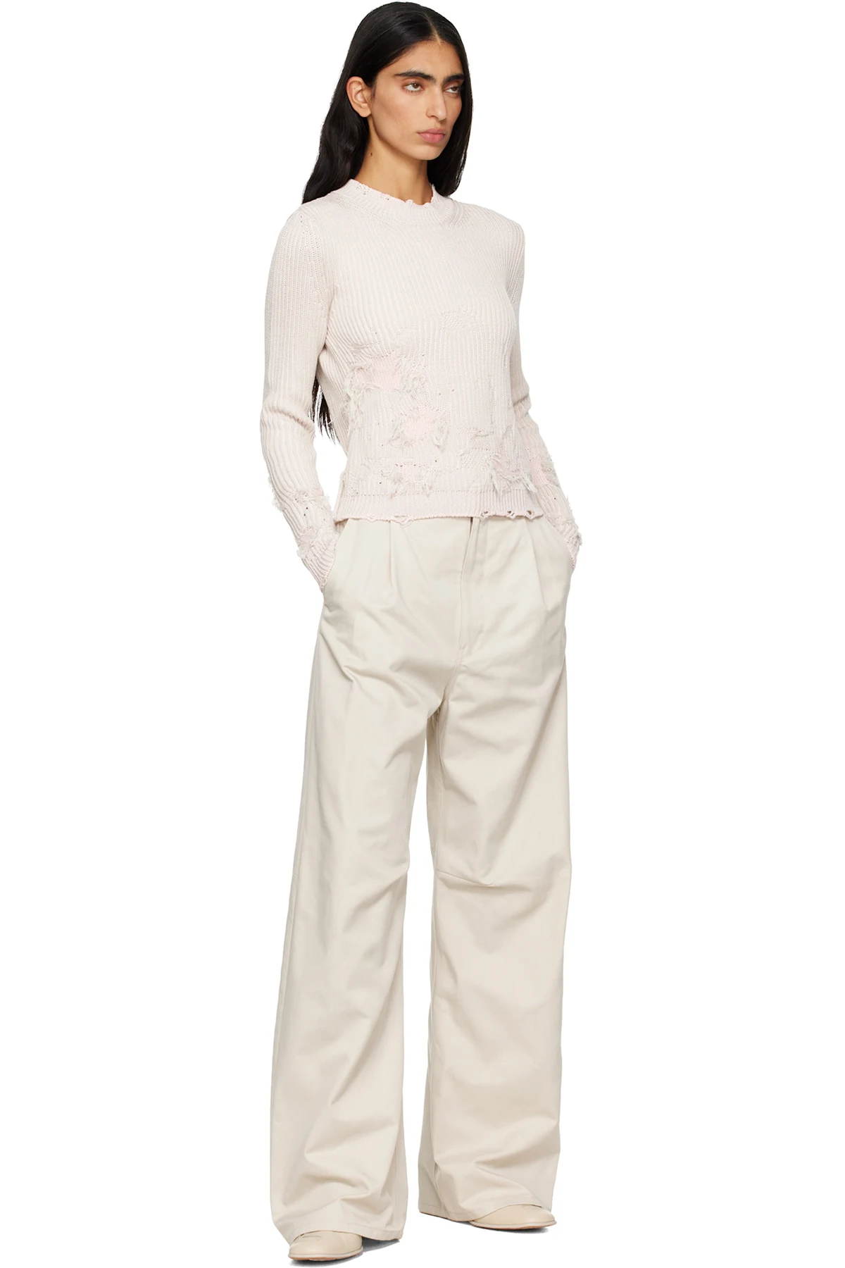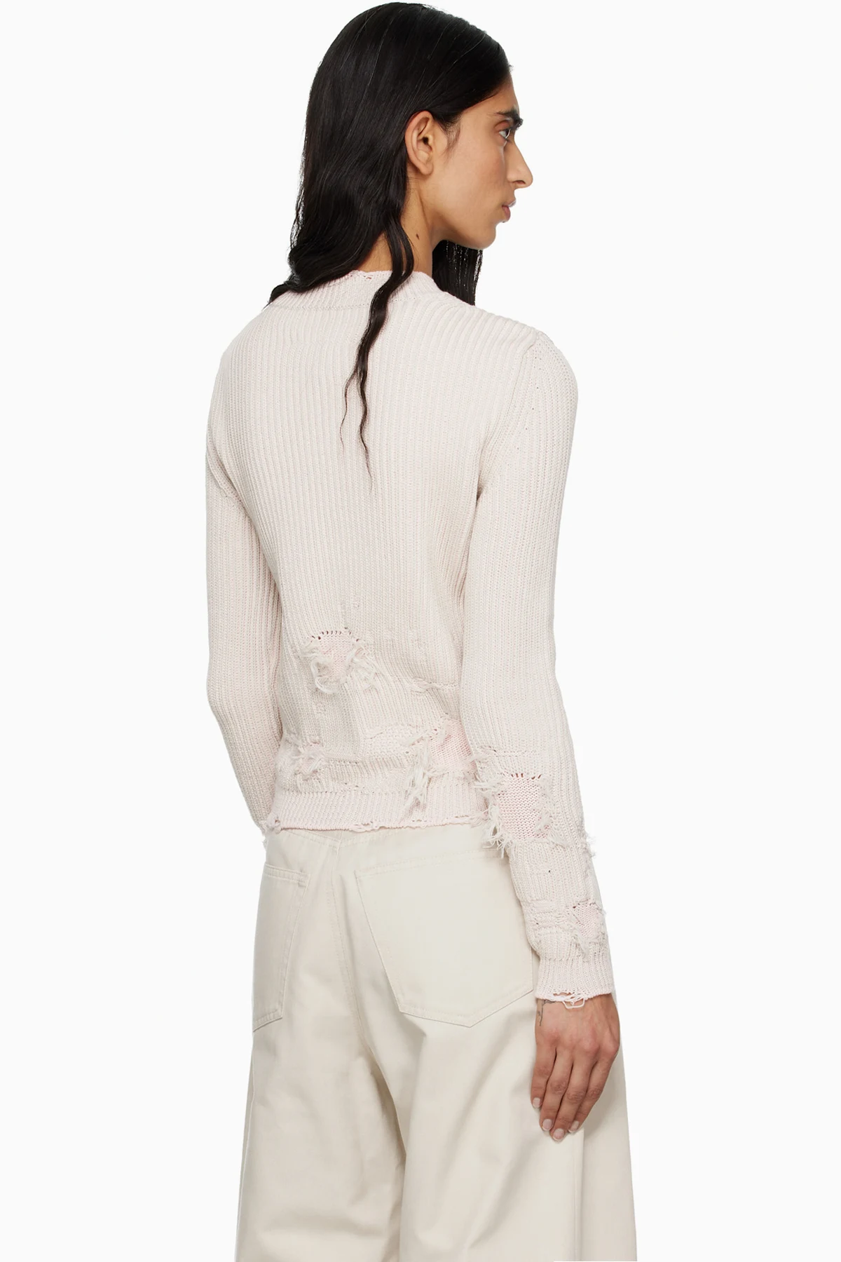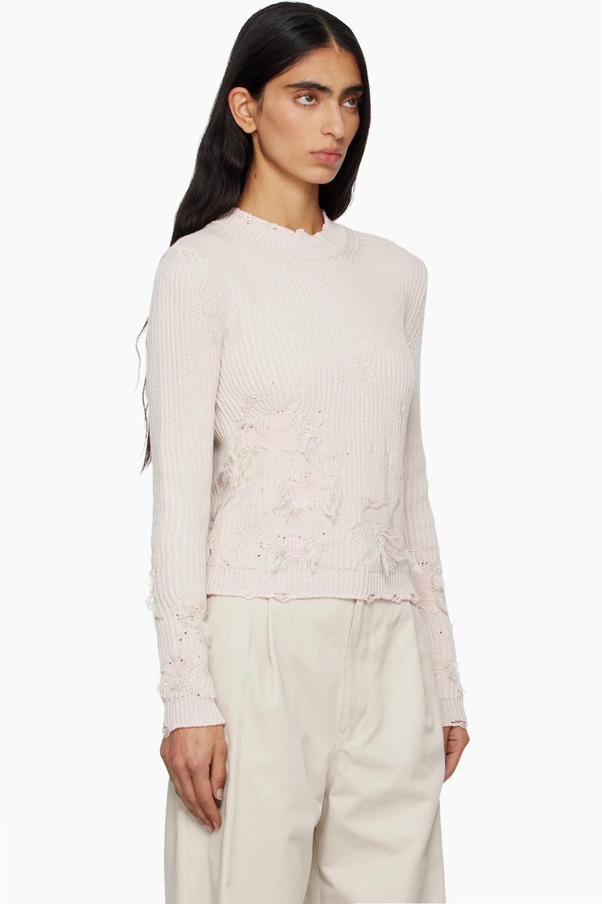 · Distressing, loose threads, and purl-knit detailing throughout