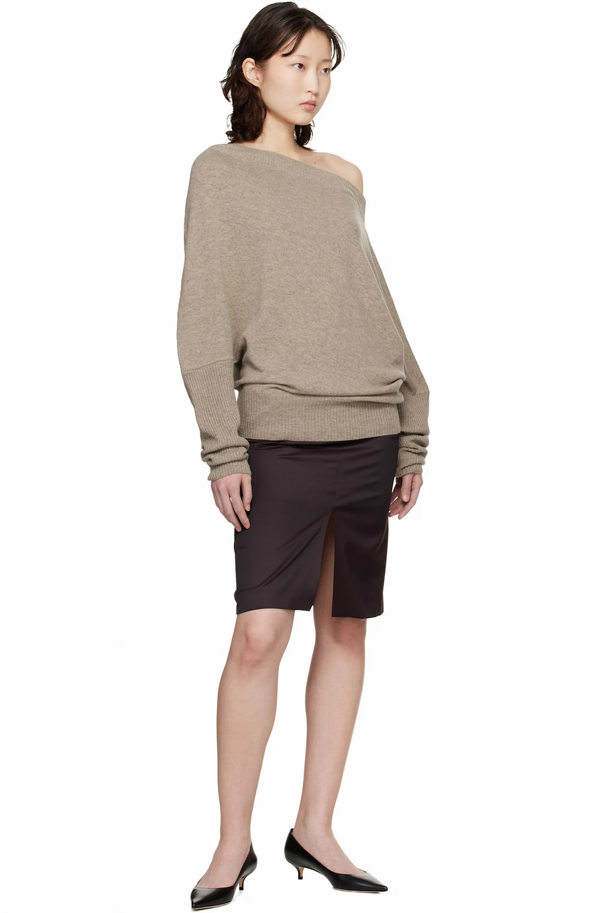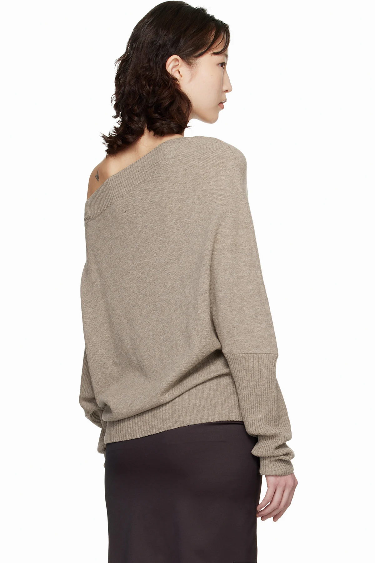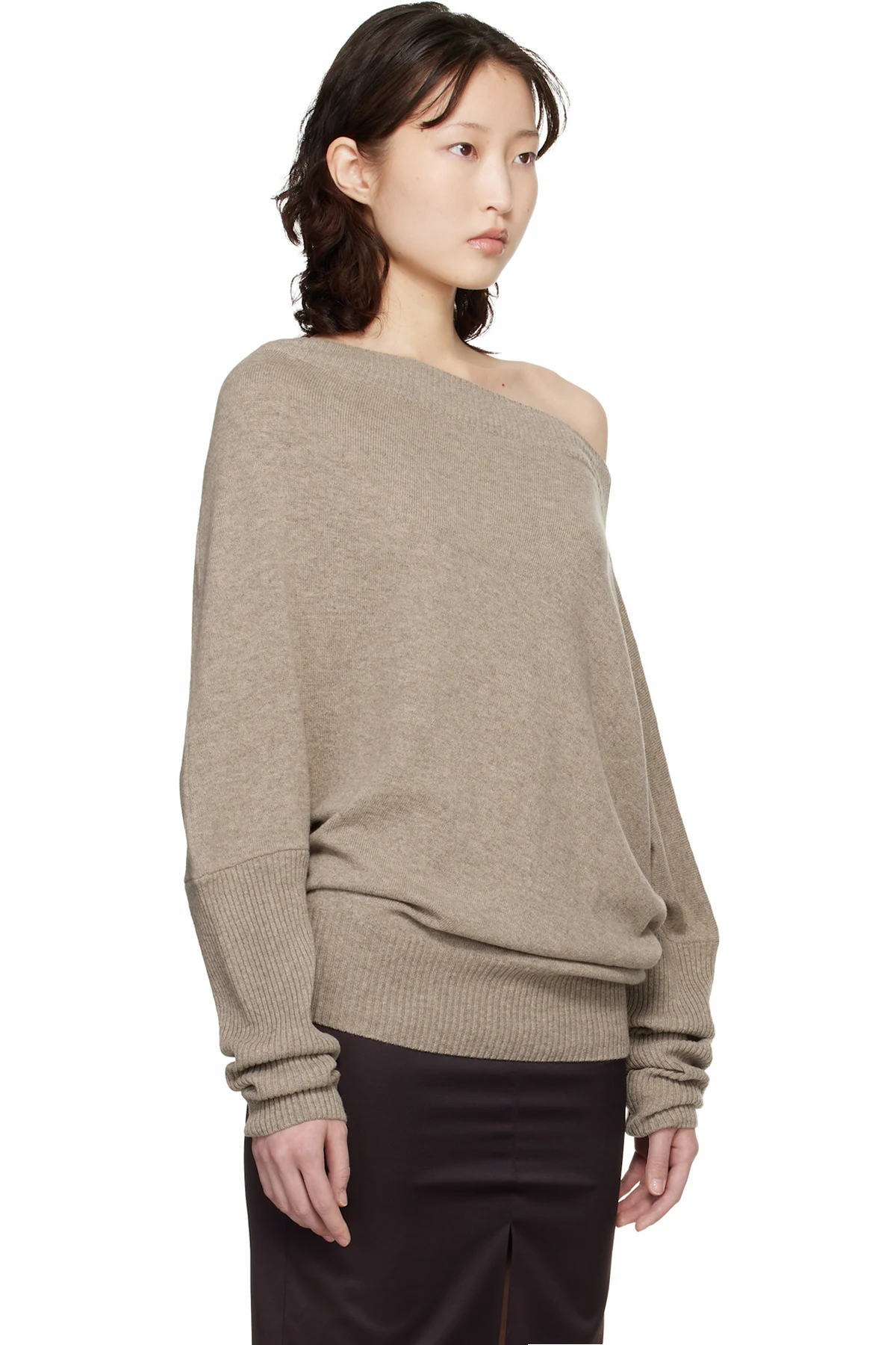 Taupe Merino Wool Off-Shoulder Sweater