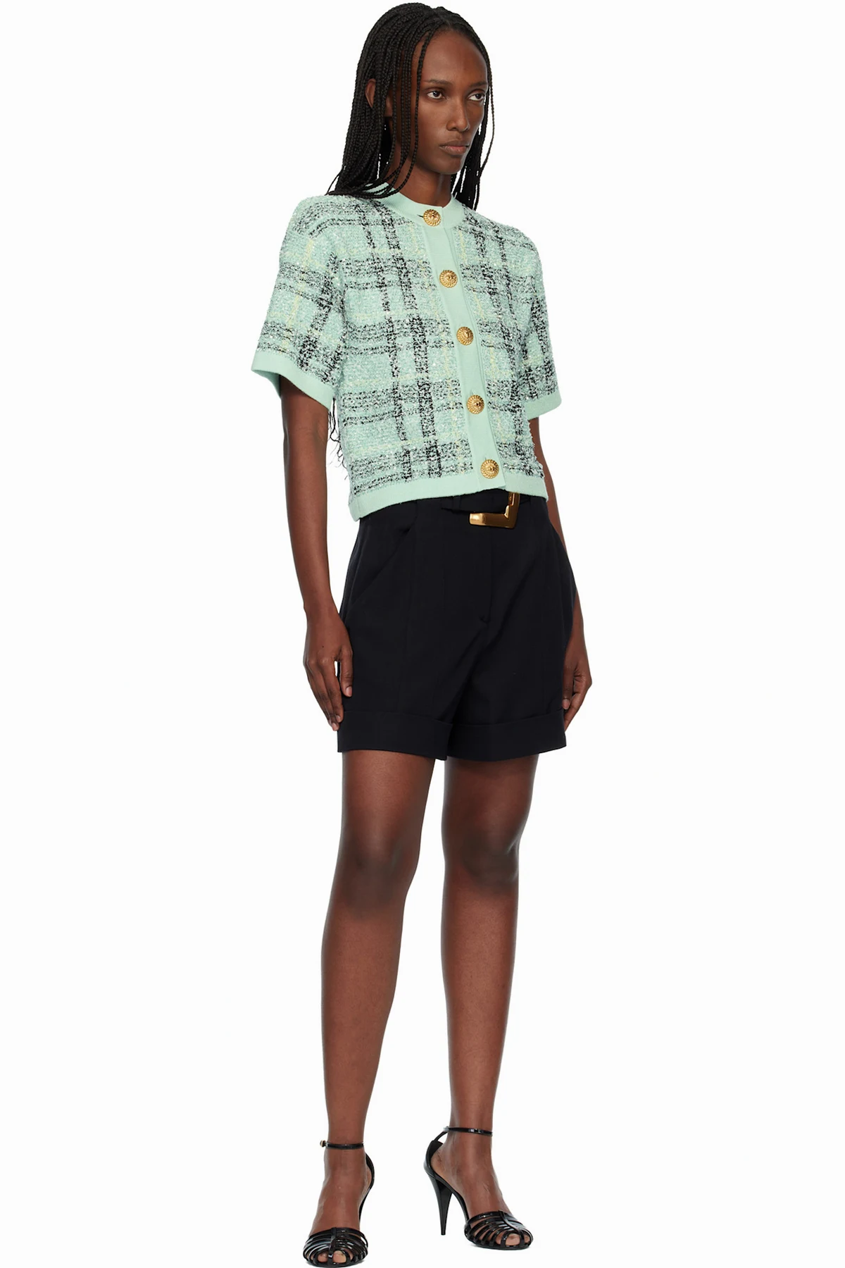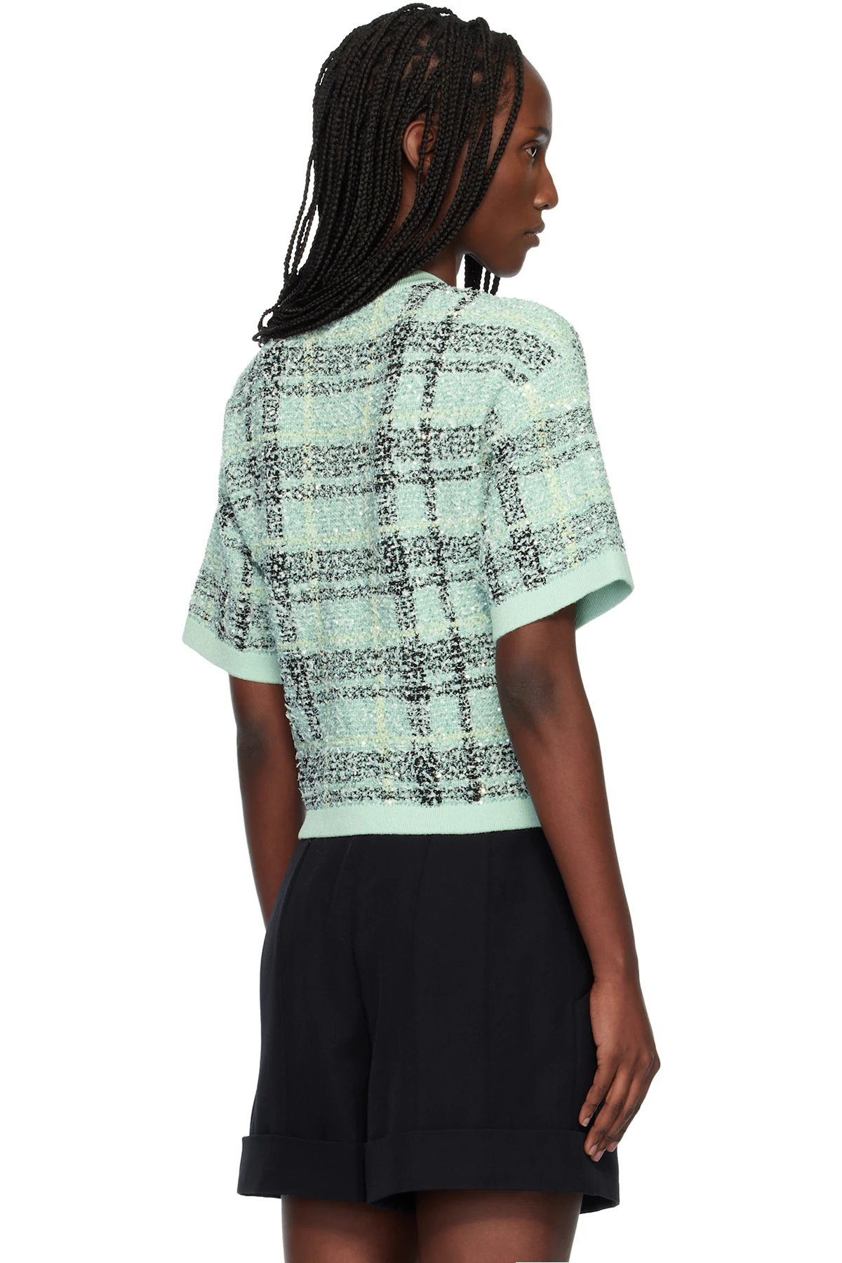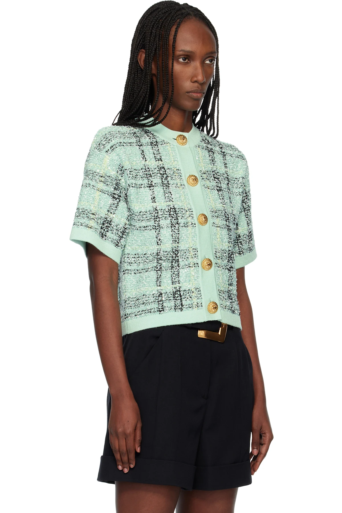 Green Buttoned Shiny Light Tweed Cardigan