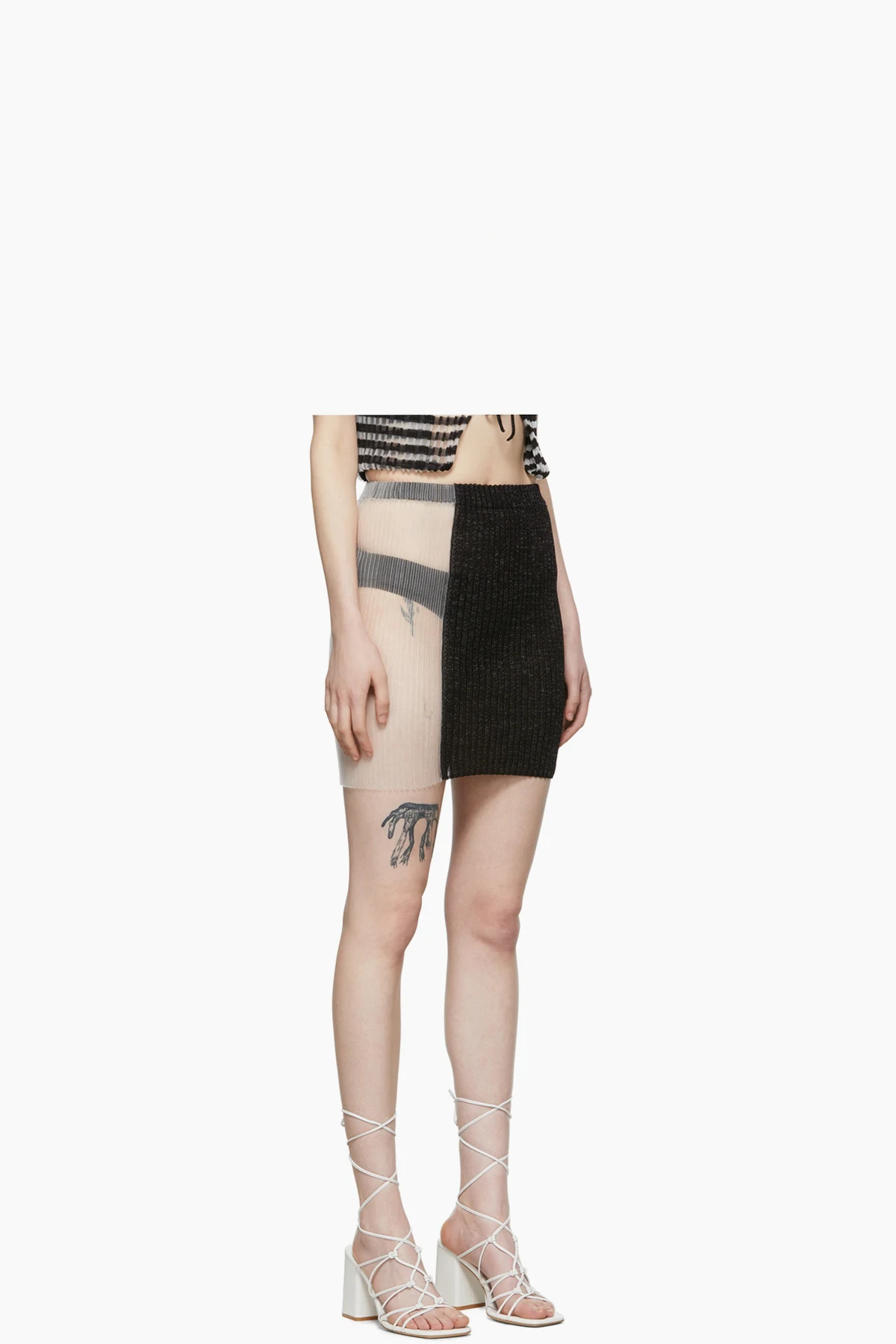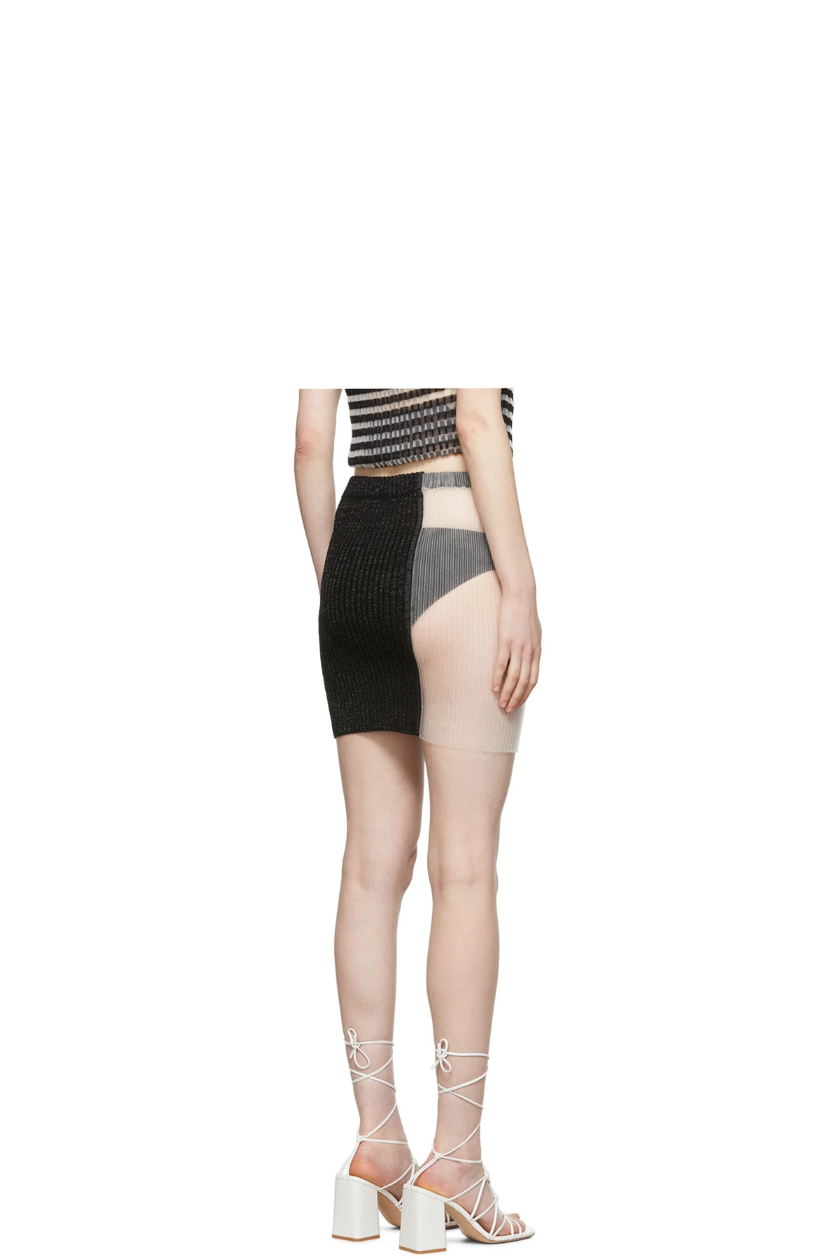Paneled rib knit nylon and nylon mesh skirt. Elasticized waistband.